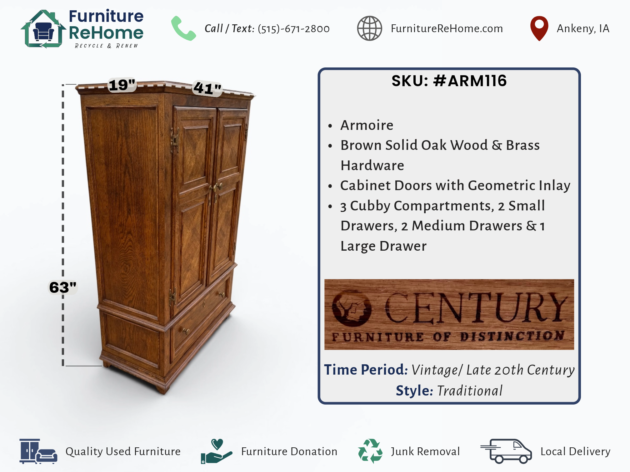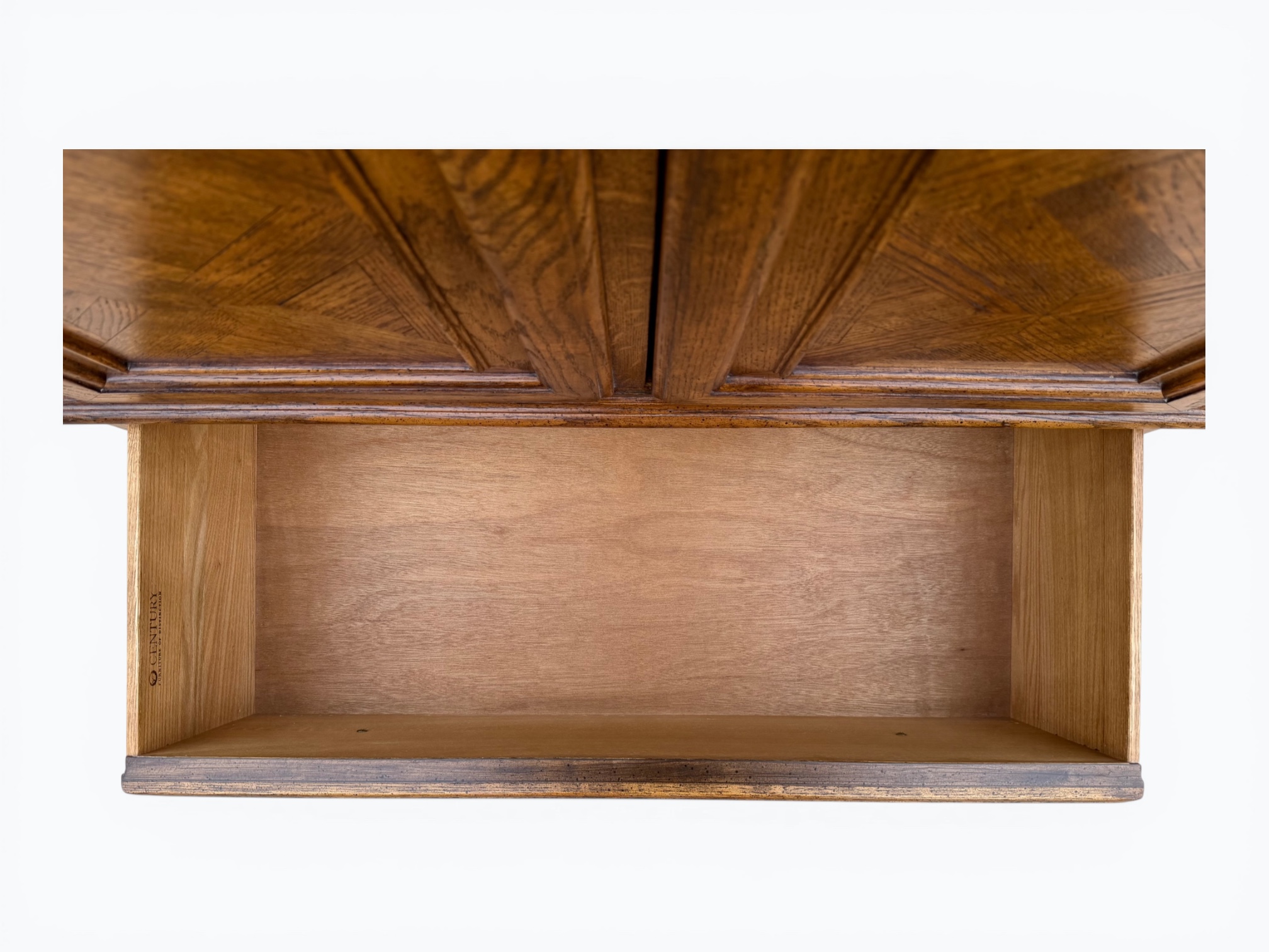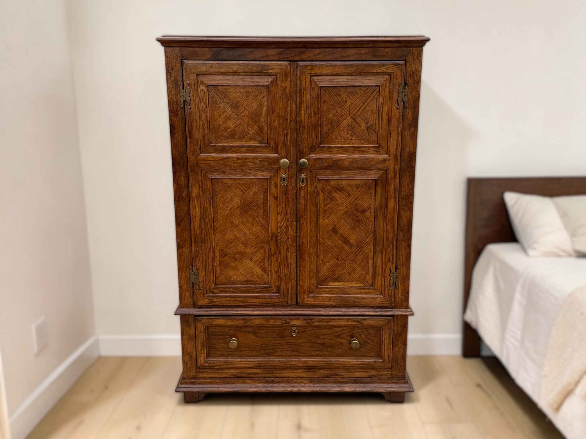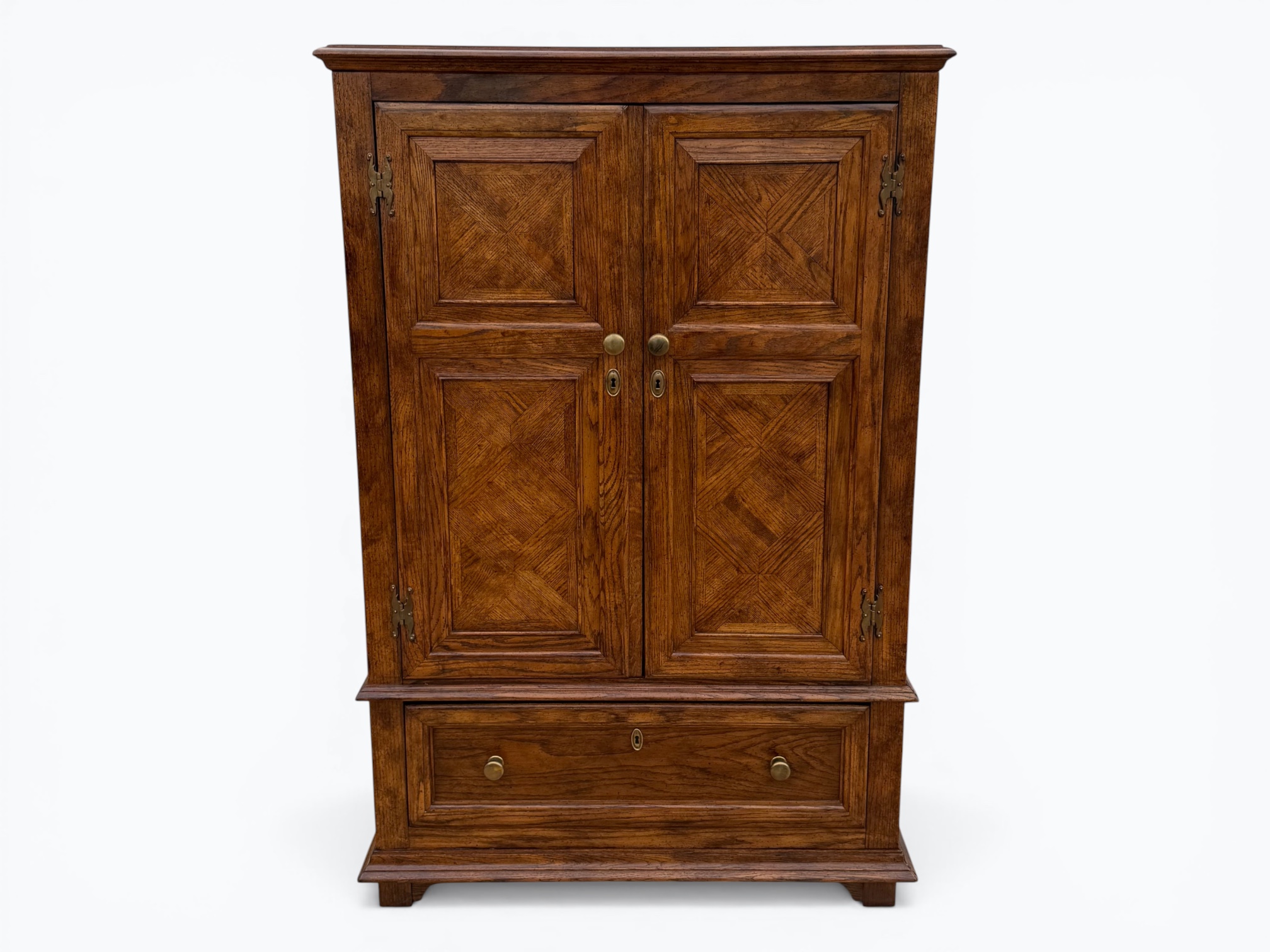 • [Features]: Large drawer at the bottom; 2 cabinet doors with interior door stays and geometric inlay; 3 cubby compartments, 2 small drawers, and 2 medium drawers on the inside; Decorative trim framing; Solid and heavy construction