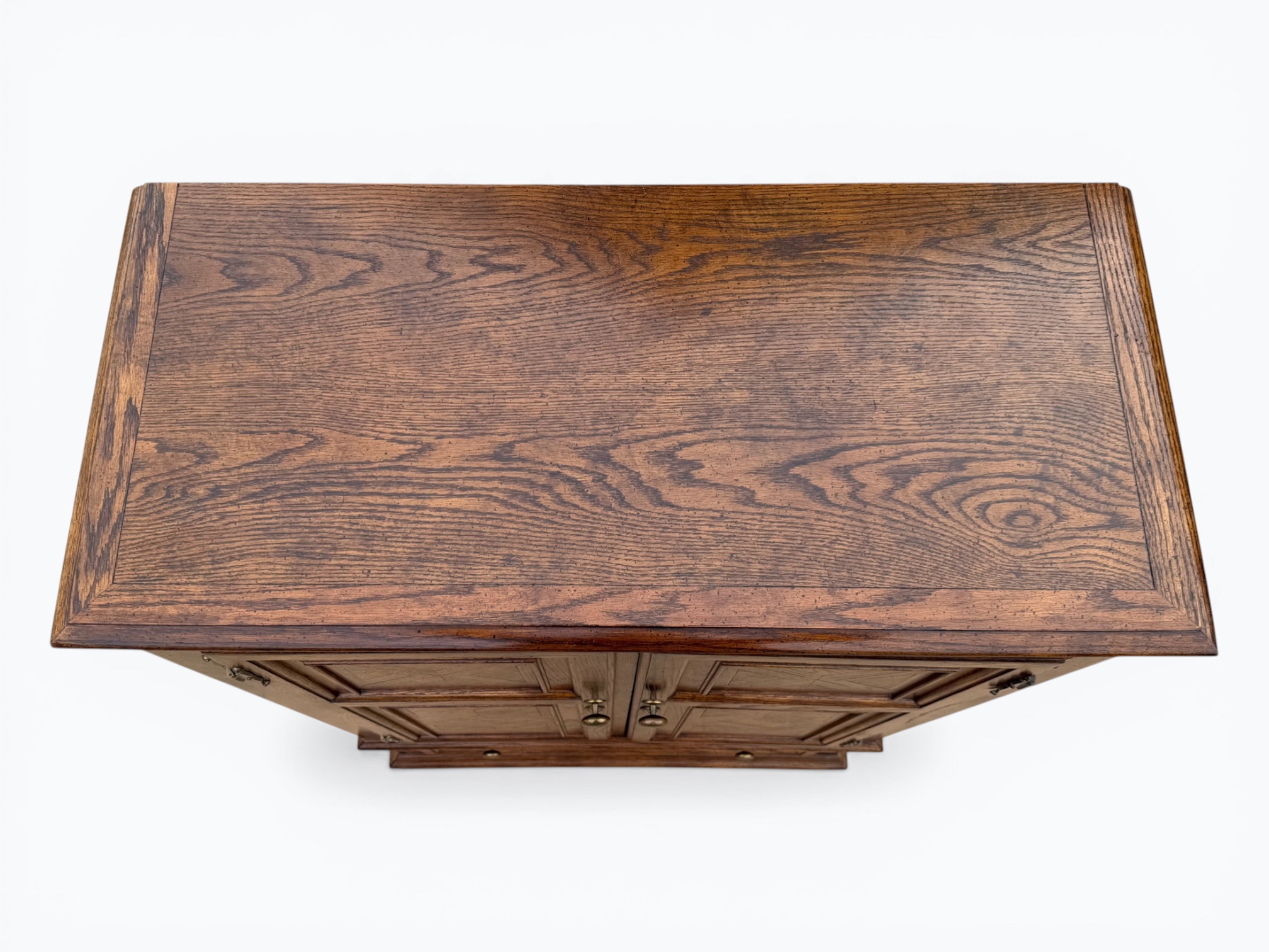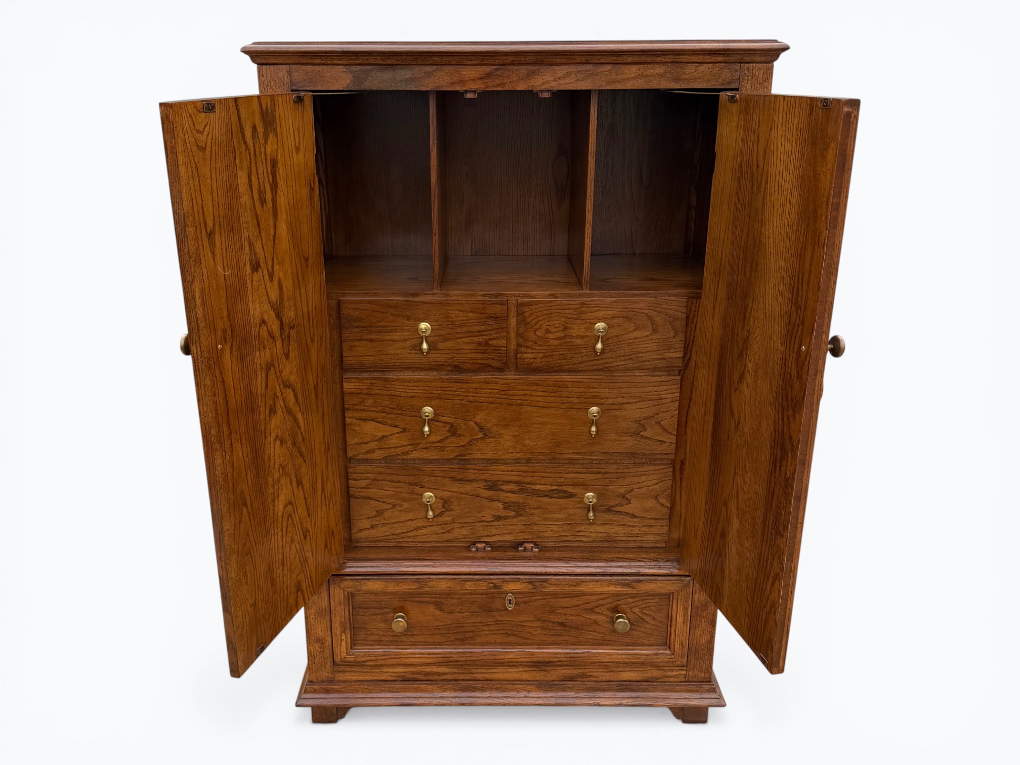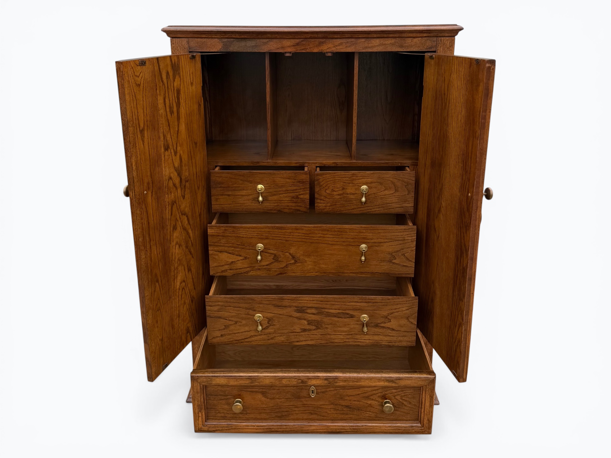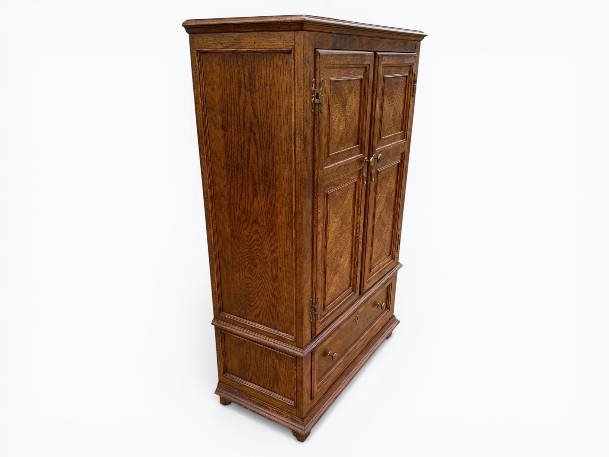 • [Features]: Large drawer at the bottom; 2 cabinet doors with interior door stays and geometric inlay; 3 cubby compartments, 2 small drawers, and 2 medium drawers on the inside; Decorative trim framing; Solid and heavy construction