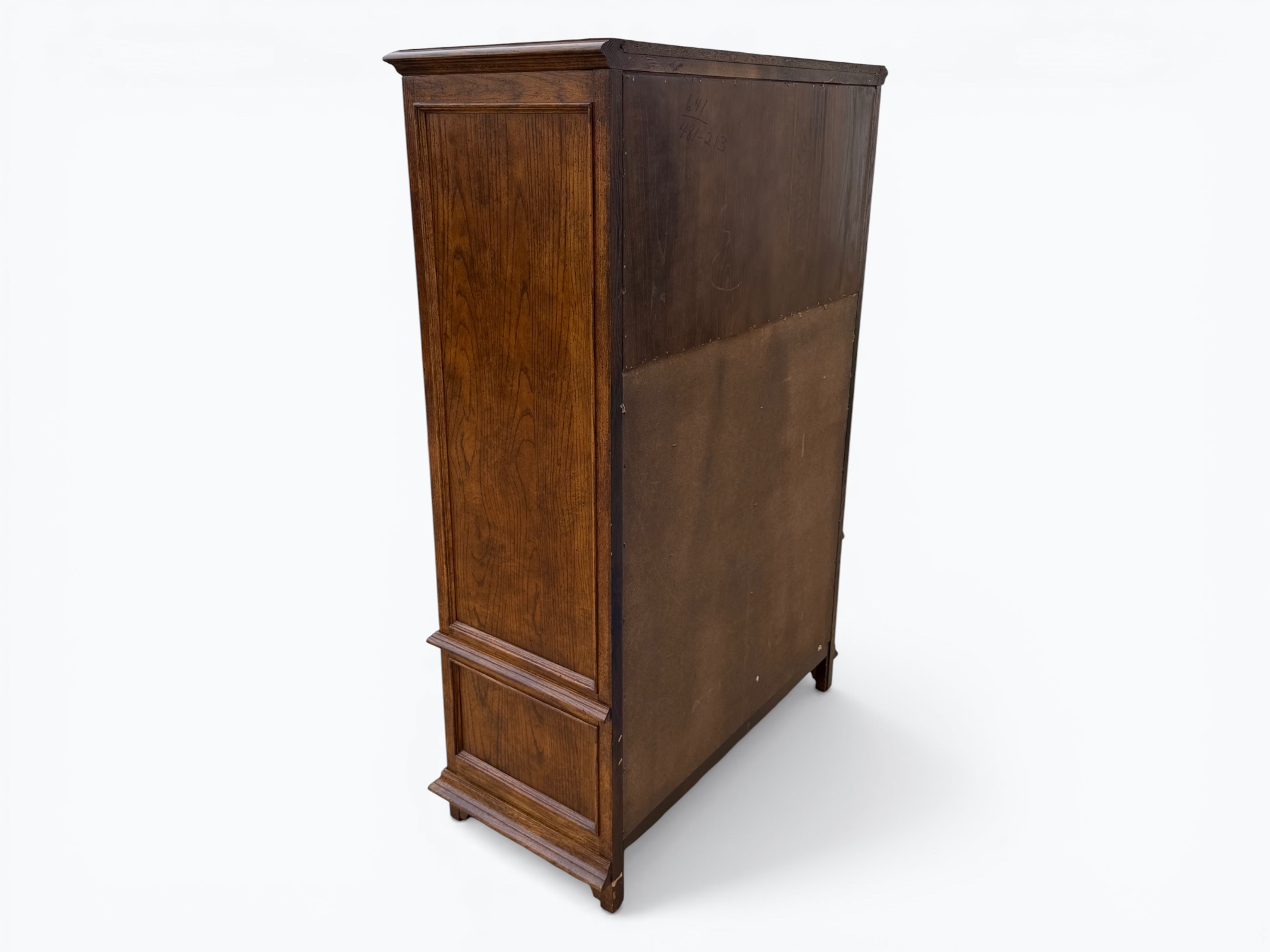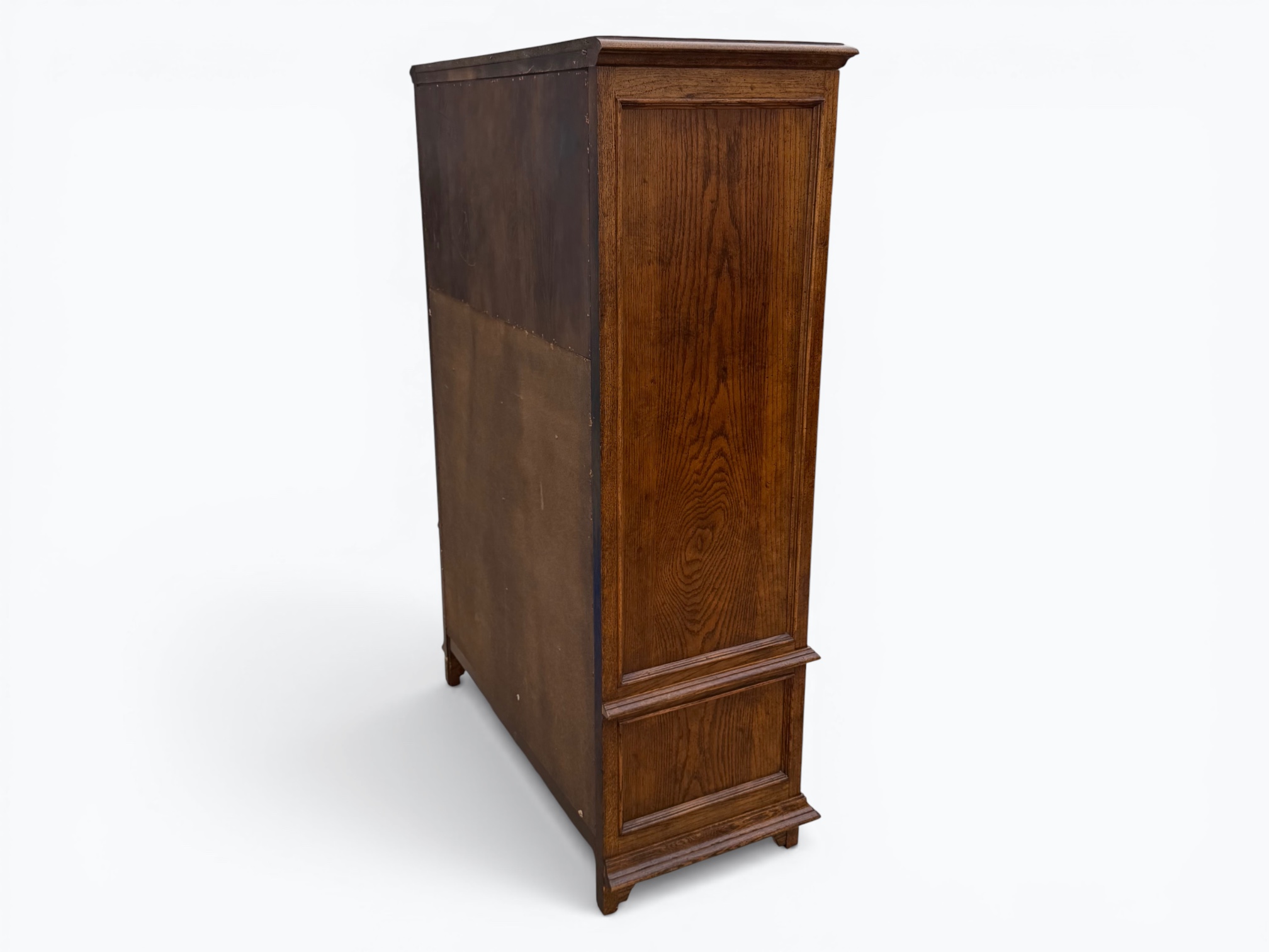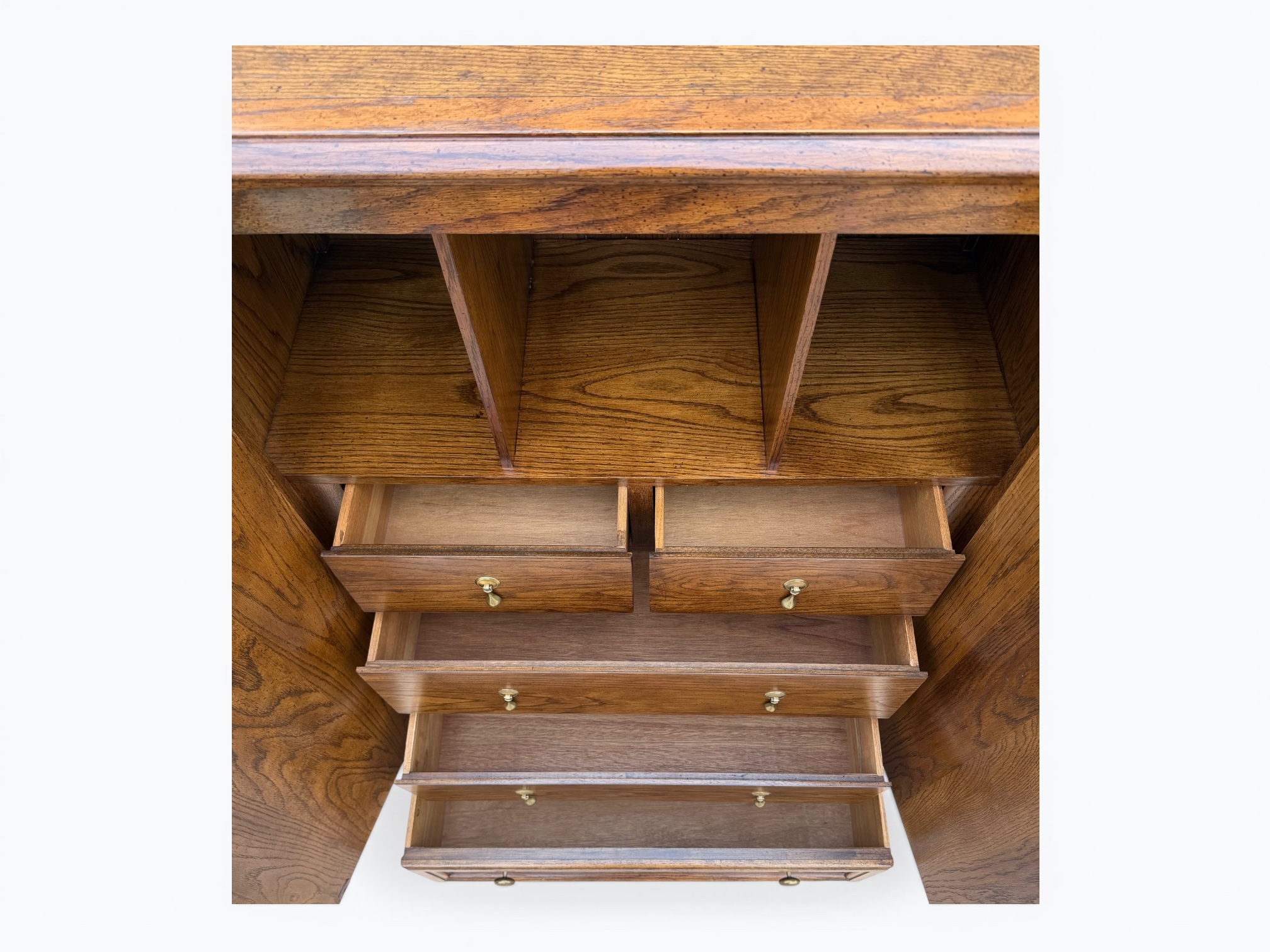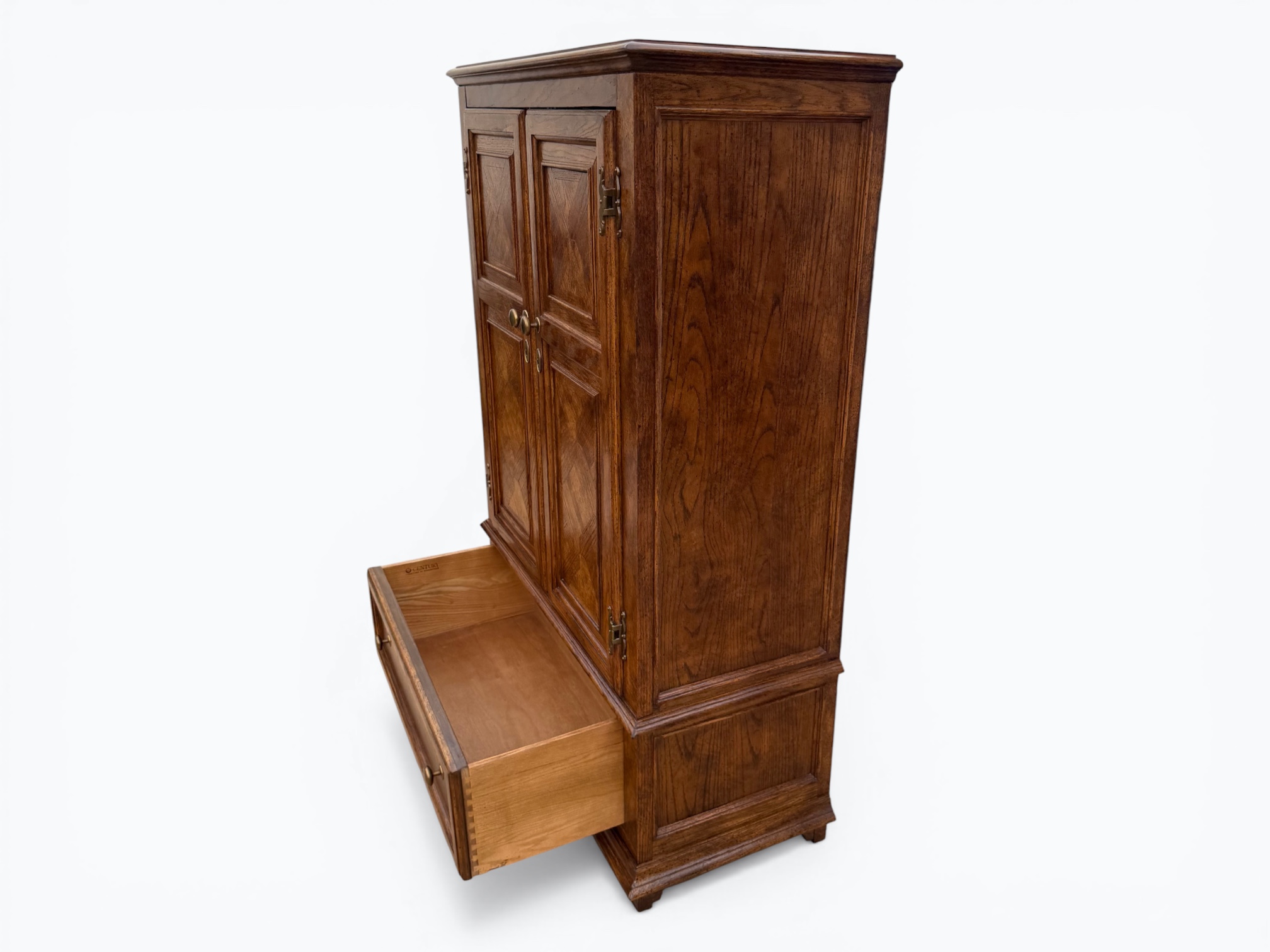 • [Features]: Large drawer at the bottom; 2 cabinet doors with interior door stays and geometric inlay; 3 cubby compartments, 2 small drawers, and 2 medium drawers on the inside; Decorative trim framing; Solid and heavy construction