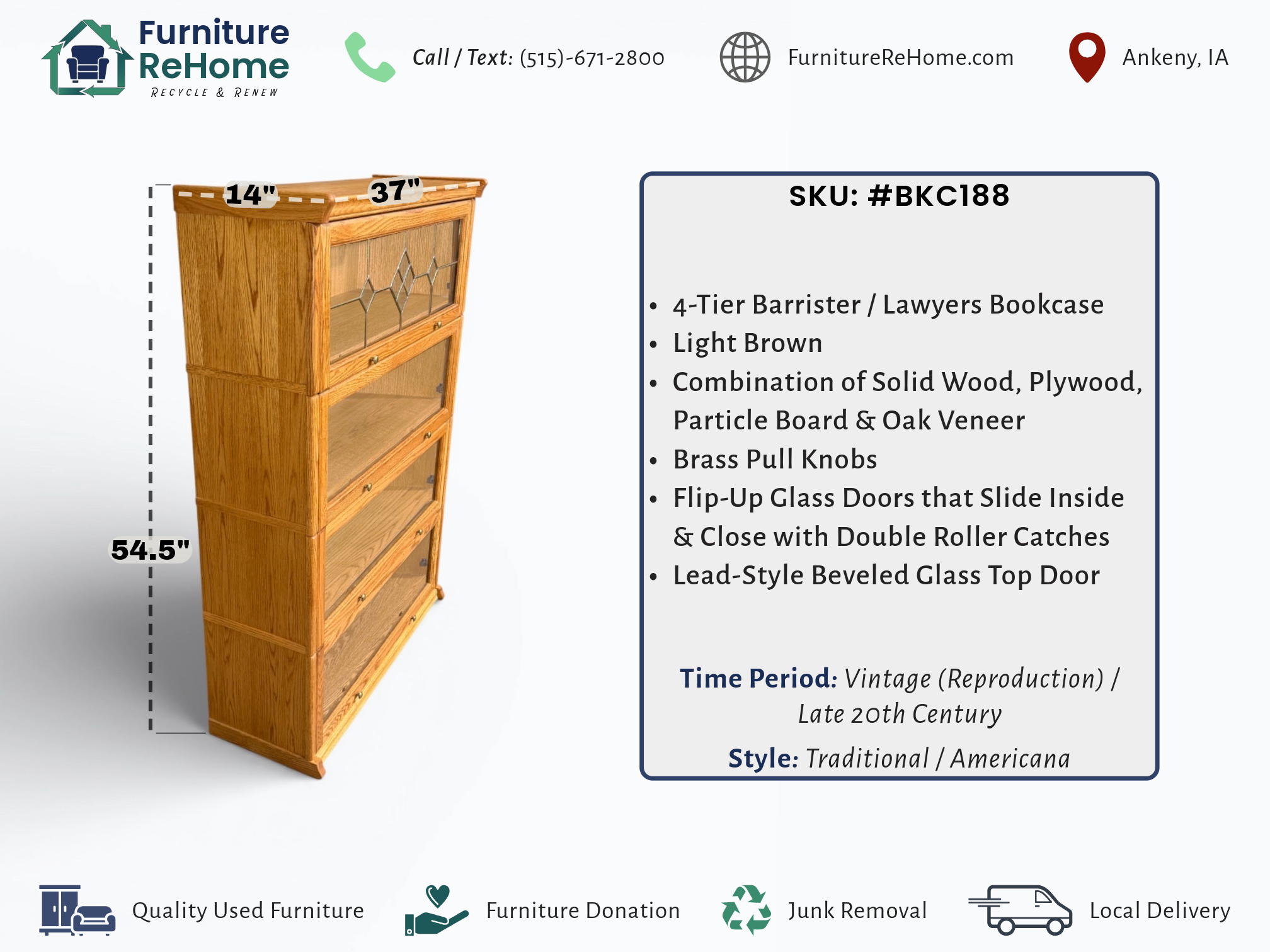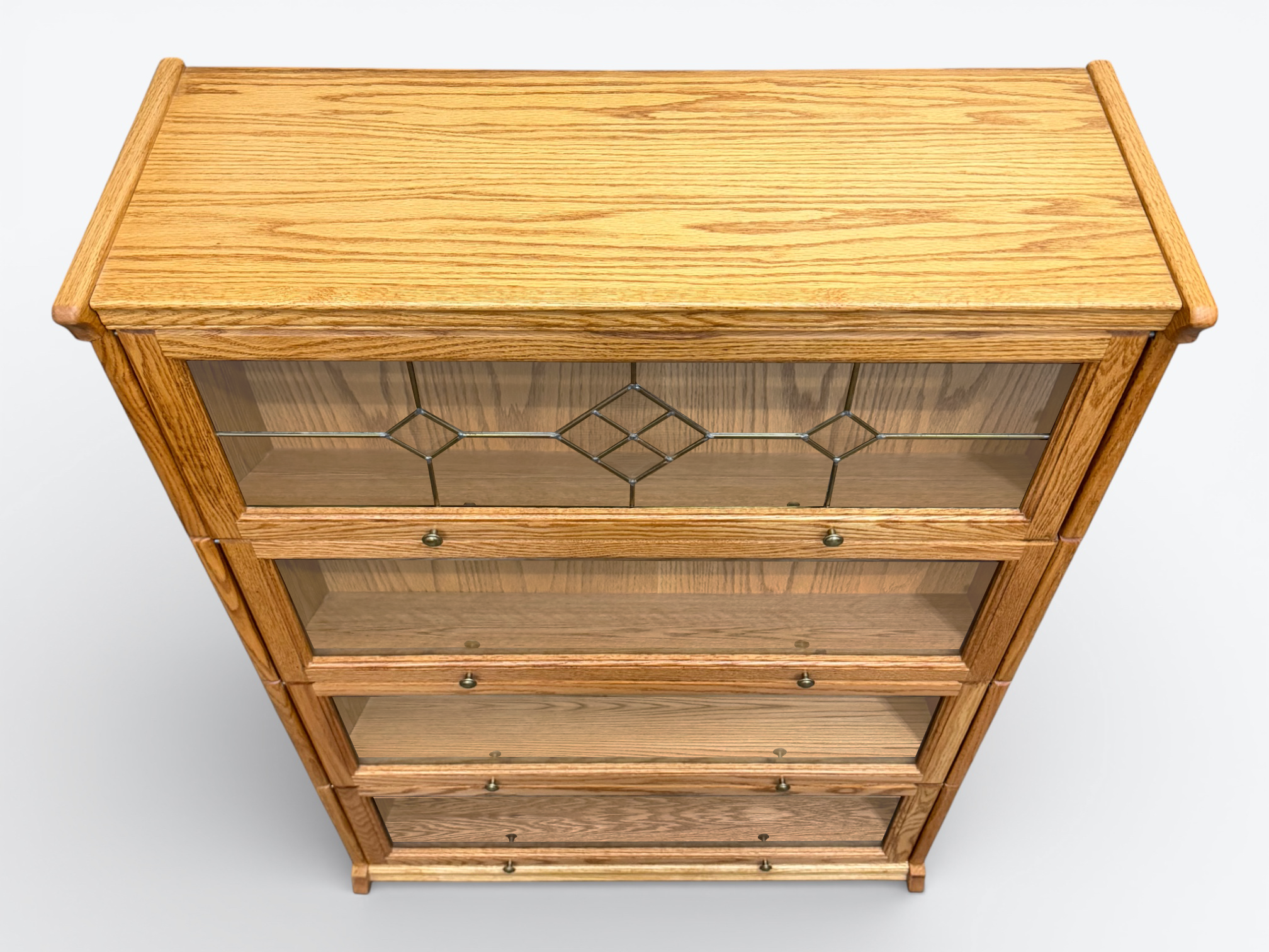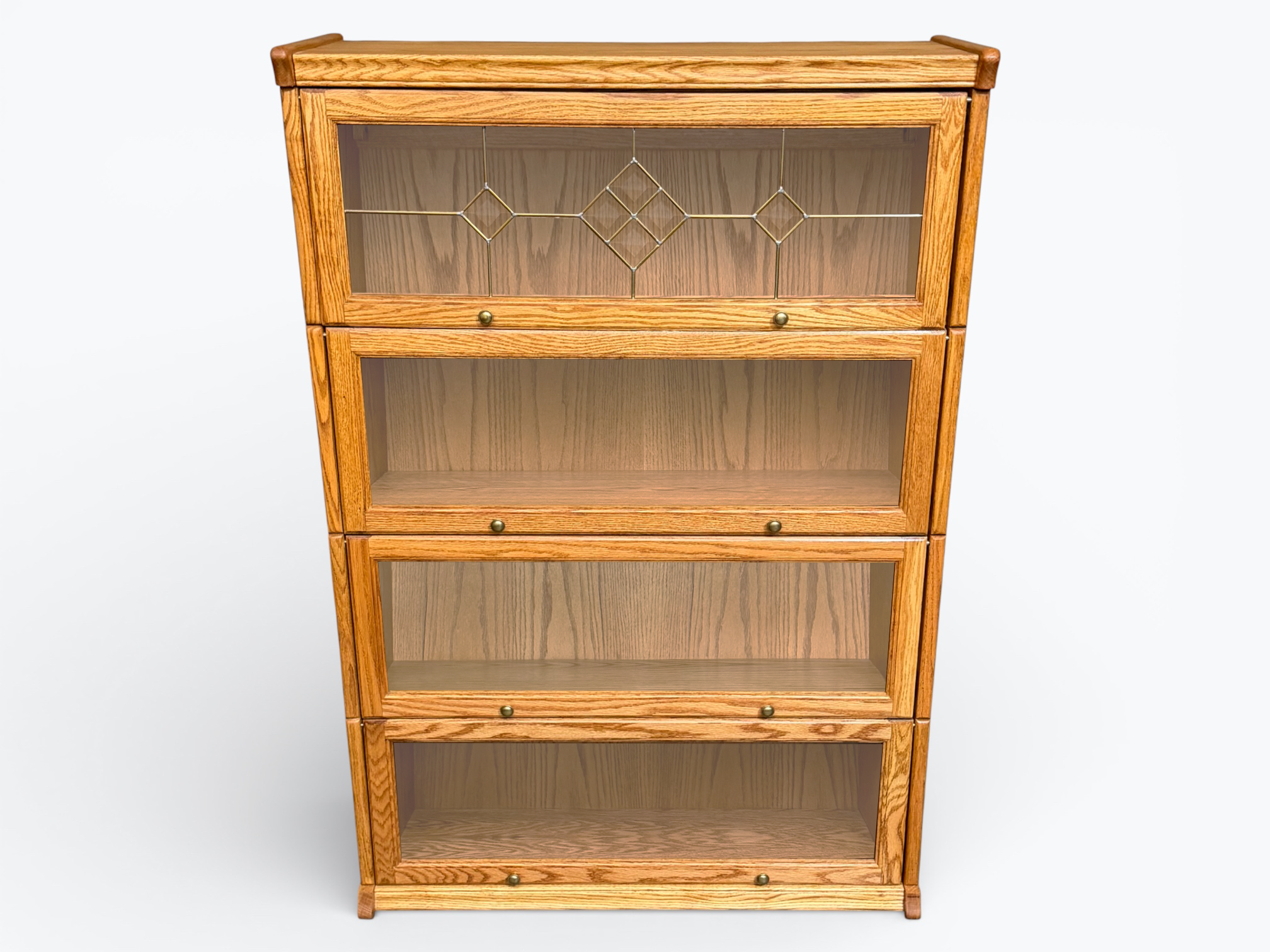 • [Features]: 4 Cabinet doors; All one piece and does not separate into individual stacks; Decorative lead-style beveled glass on the top door; Doors flip up, slide inside and close with double roller catches