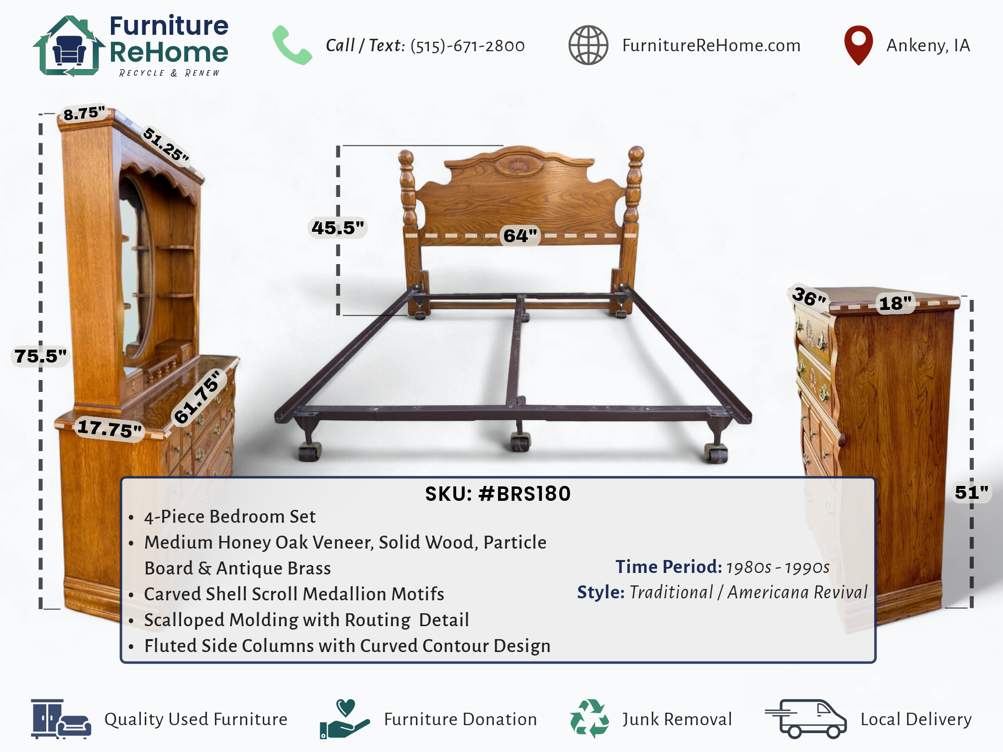 4-Piece Oak Wide Dresser w/ Hutch, Tall Dresser & Queen Bed Frame Set