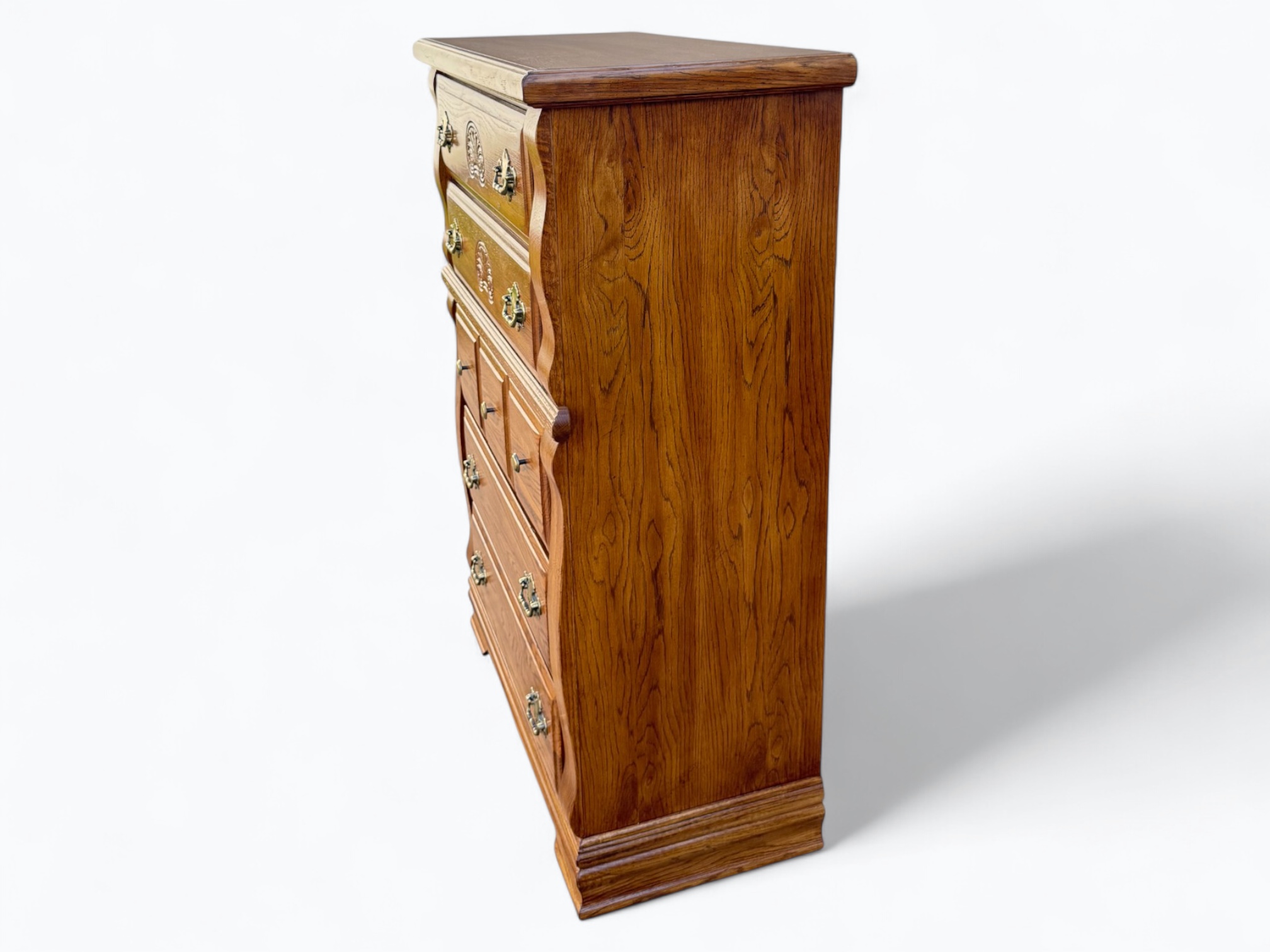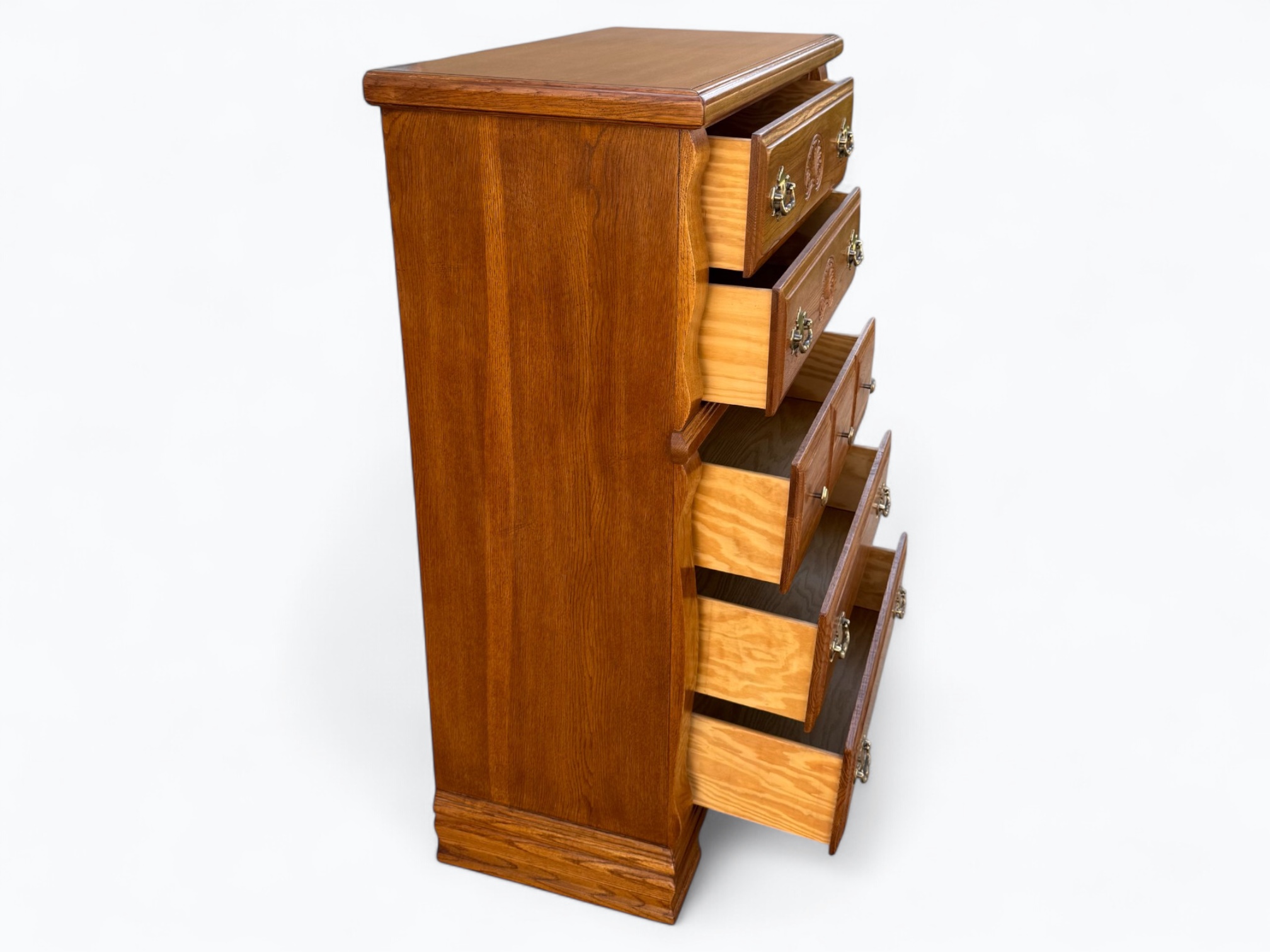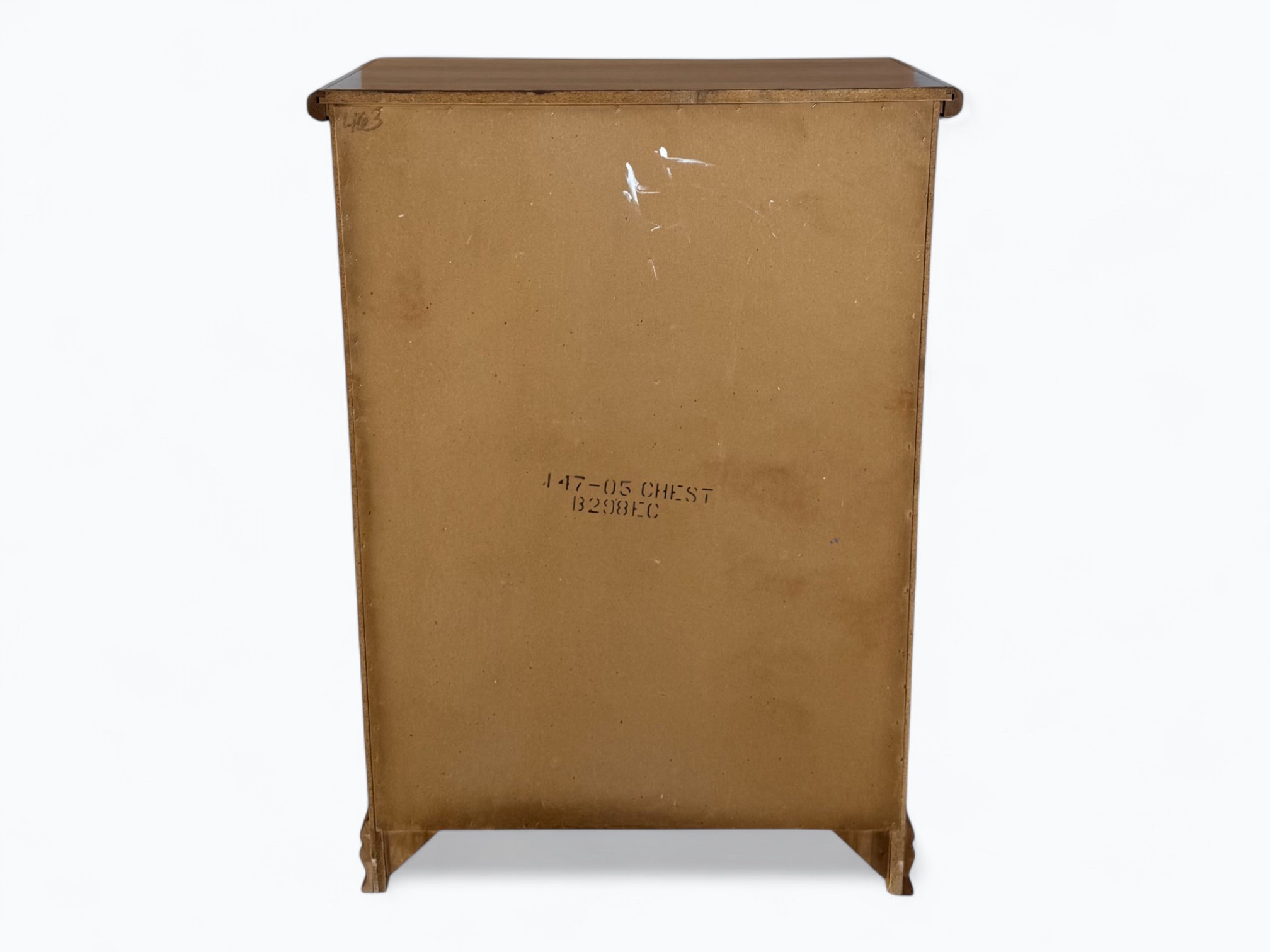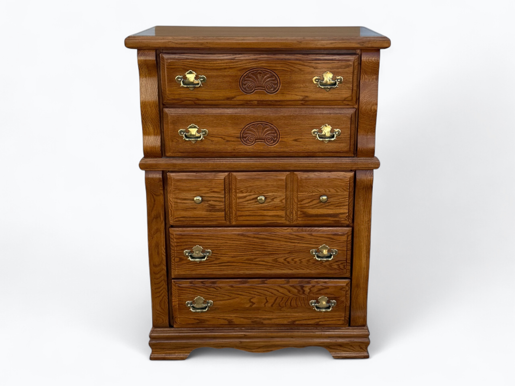 – Tall Dresser: 2 smaller drawers at the top with carved shell scroll medallion motifs and 3 larger drawers at the bottom; Wood center drawer tracks; Scalloped bottom apron; Fluted side columns with curved contour design; Projecting horizontal trim rail midway down that extends slightly past the dresser sides