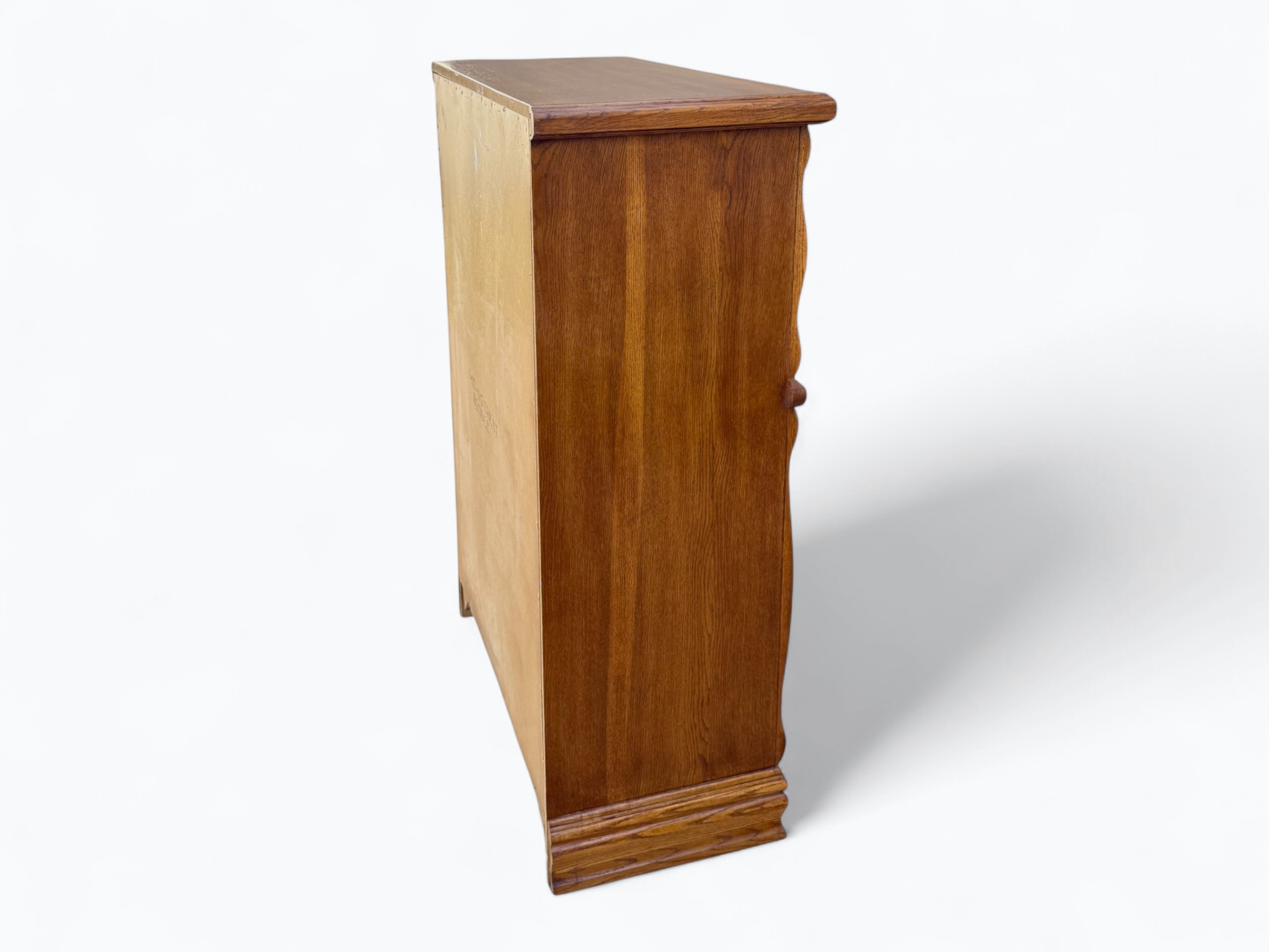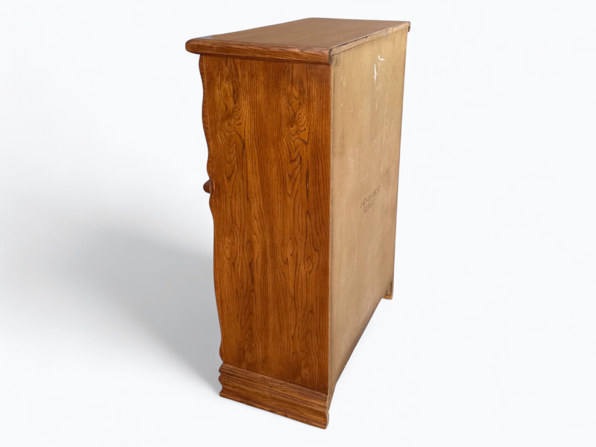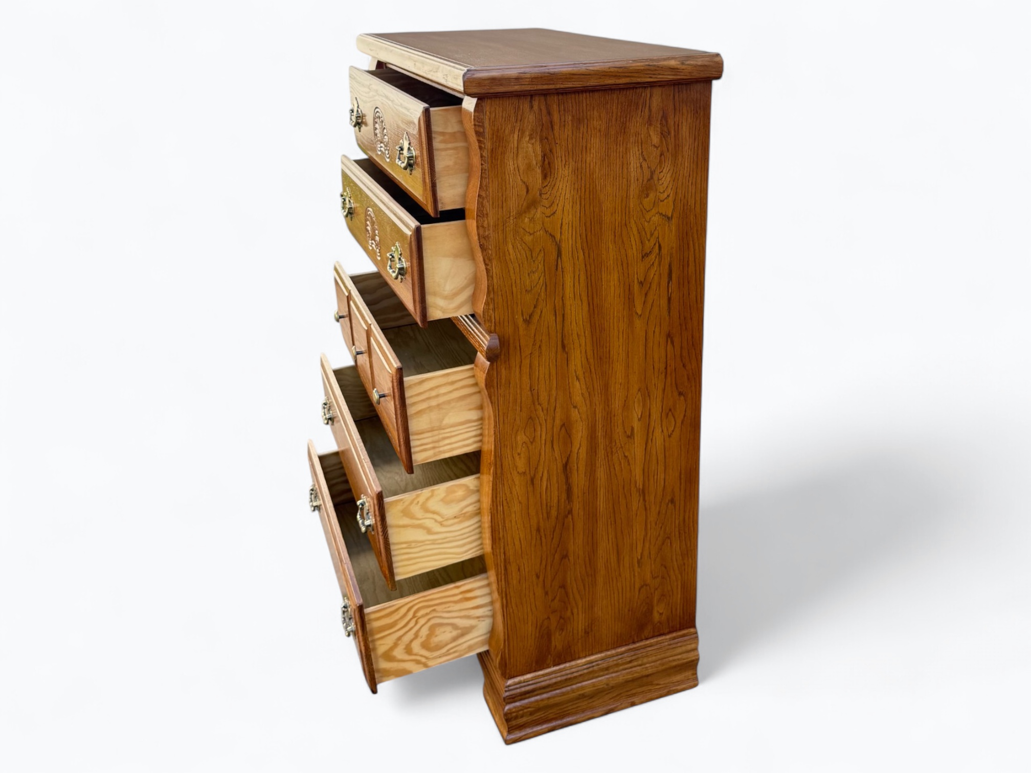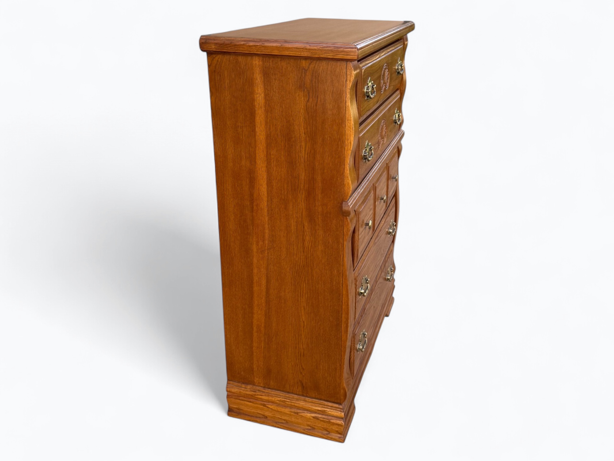 – Tall Dresser: 2 smaller drawers at the top with carved shell scroll medallion motifs and 3 larger drawers at the bottom; Wood center drawer tracks; Scalloped bottom apron; Fluted side columns with curved contour design; Projecting horizontal trim rail midway down that extends slightly past the dresser sides