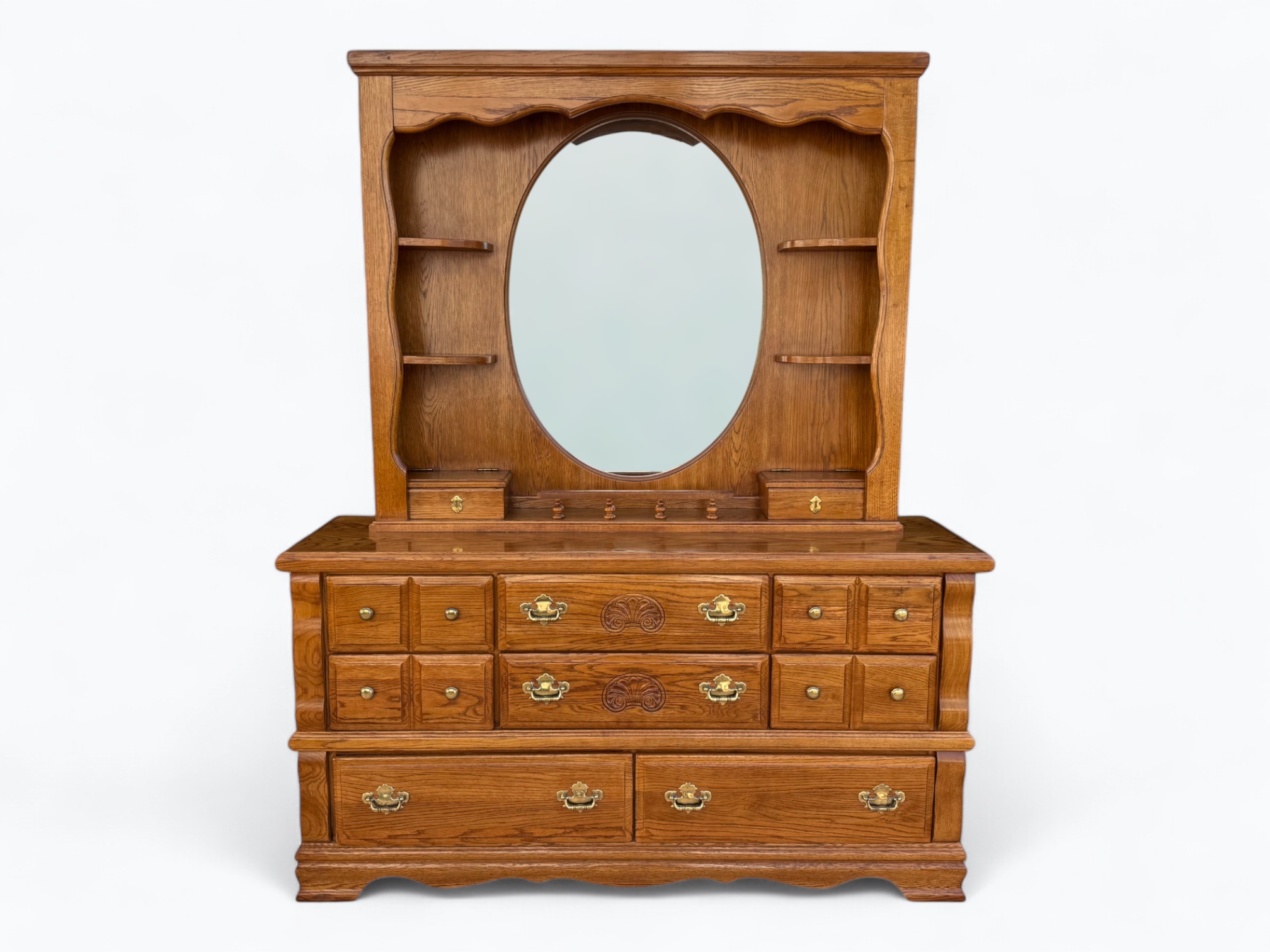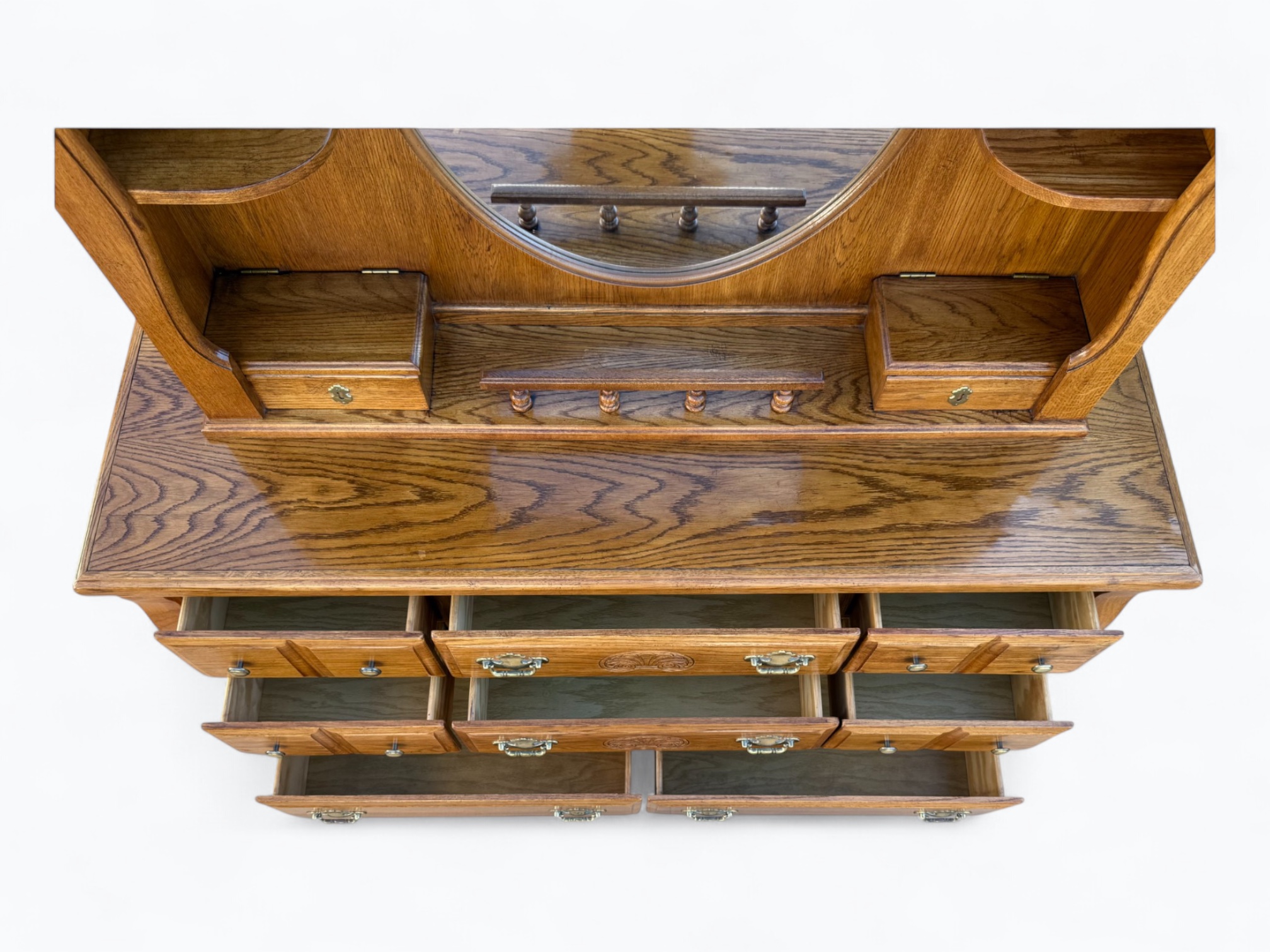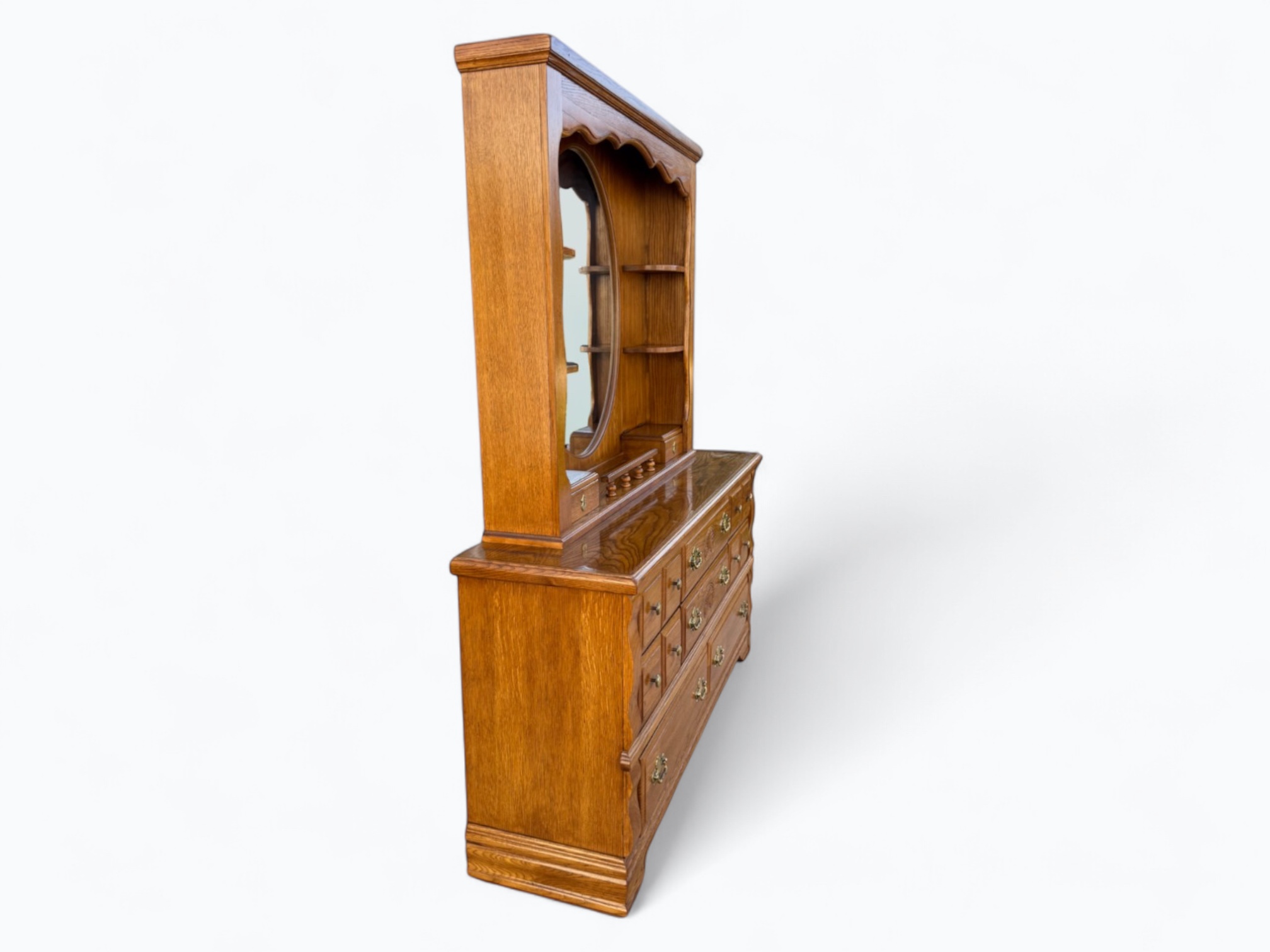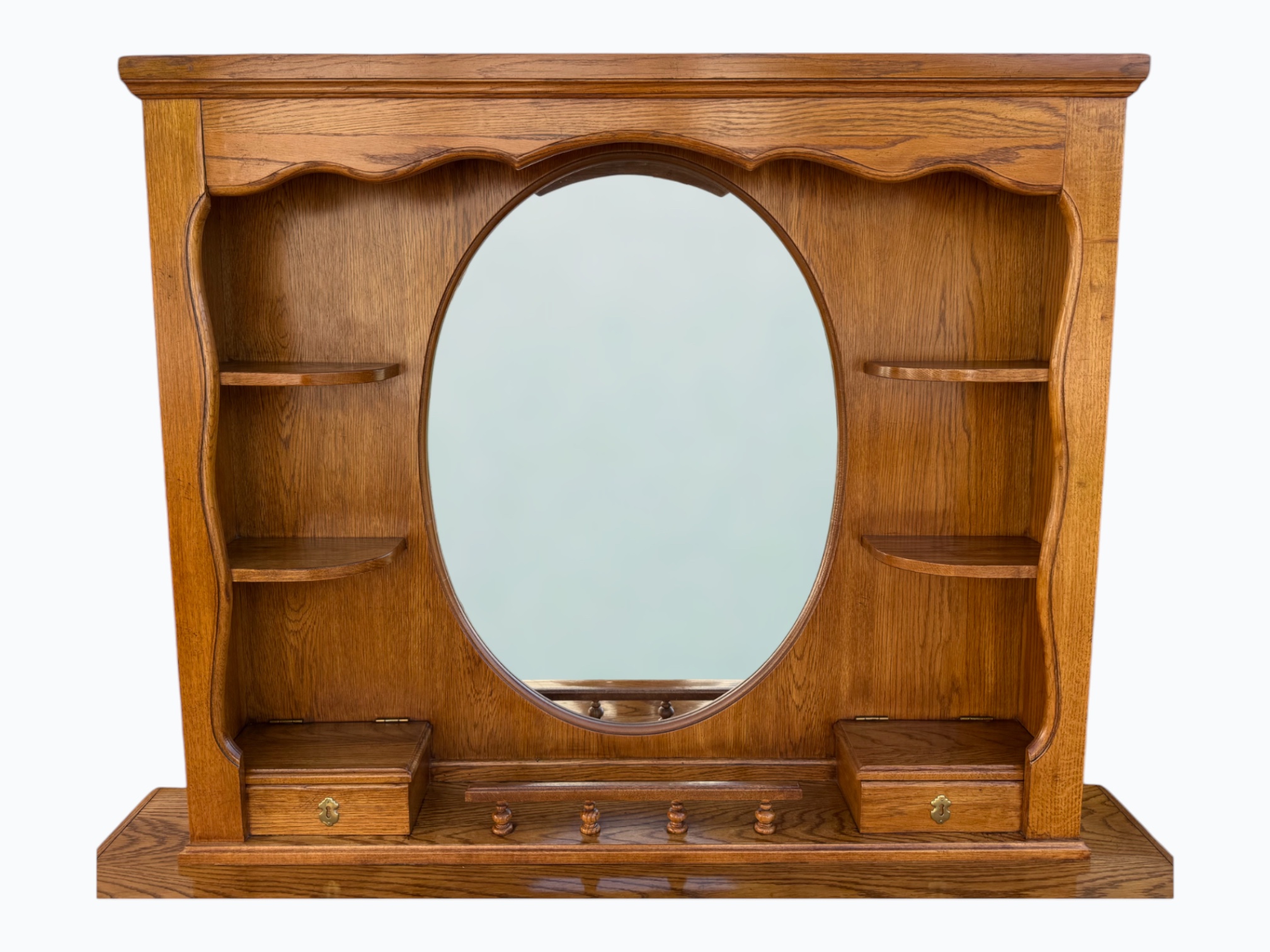 – Hutch: Oval glass mirror with integrated wooden frame; Scalloped crown molding and decorative arch above mirror; 2 hinged-lid jewelry/keepsake boxes; Routed edge detailing around frame and shelving; 4 curved display shelves on each side; Wood center drawer tracks; Fixed decorative wooden rail in the center; 2 rear mounting brackets to keep the hutch in place