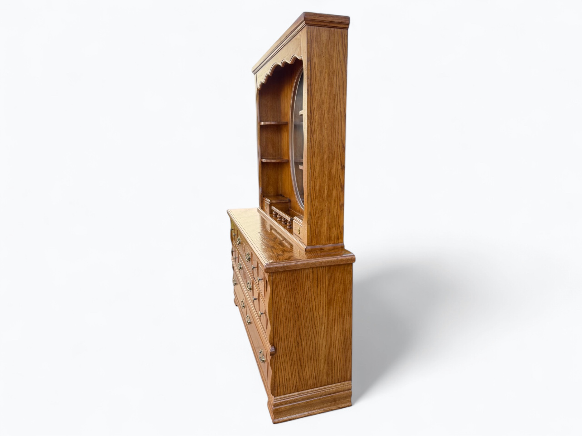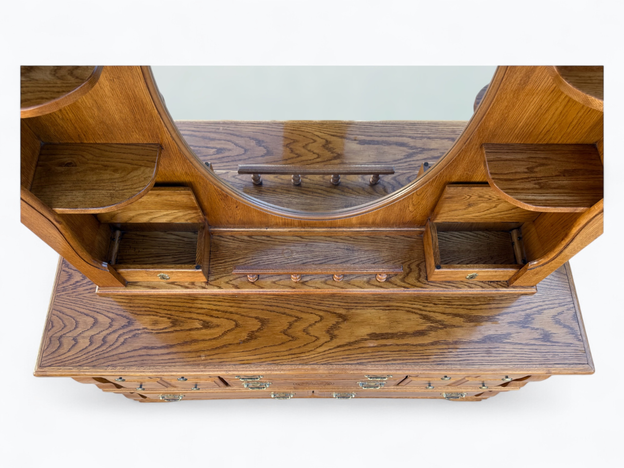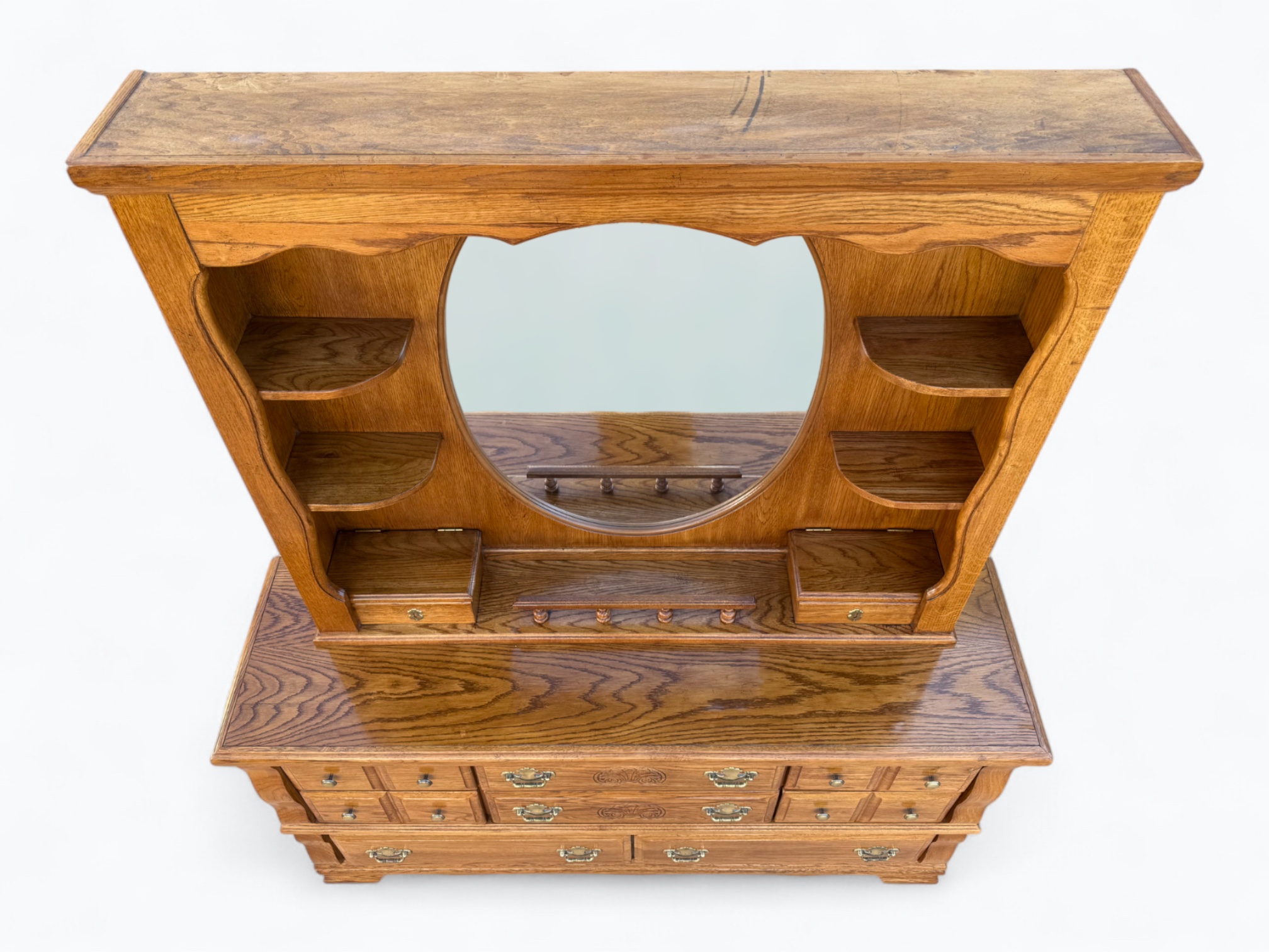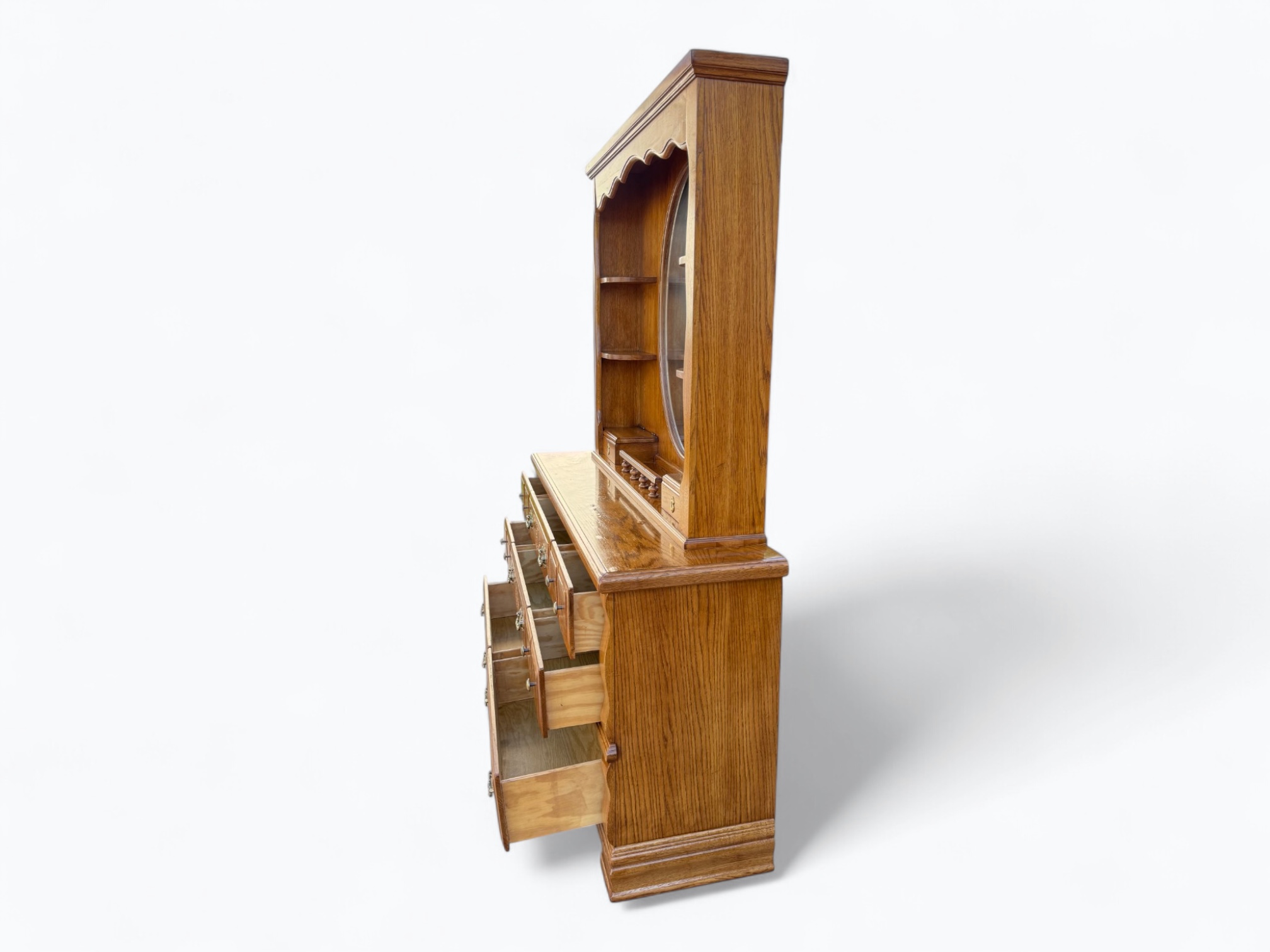 – Hutch: Oval glass mirror with integrated wooden frame; Scalloped crown molding and decorative arch above mirror; 2 hinged-lid jewelry/keepsake boxes; Routed edge detailing around frame and shelving; 4 curved display shelves on each side; Wood center drawer tracks; Fixed decorative wooden rail in the center; 2 rear mounting brackets to keep the hutch in place