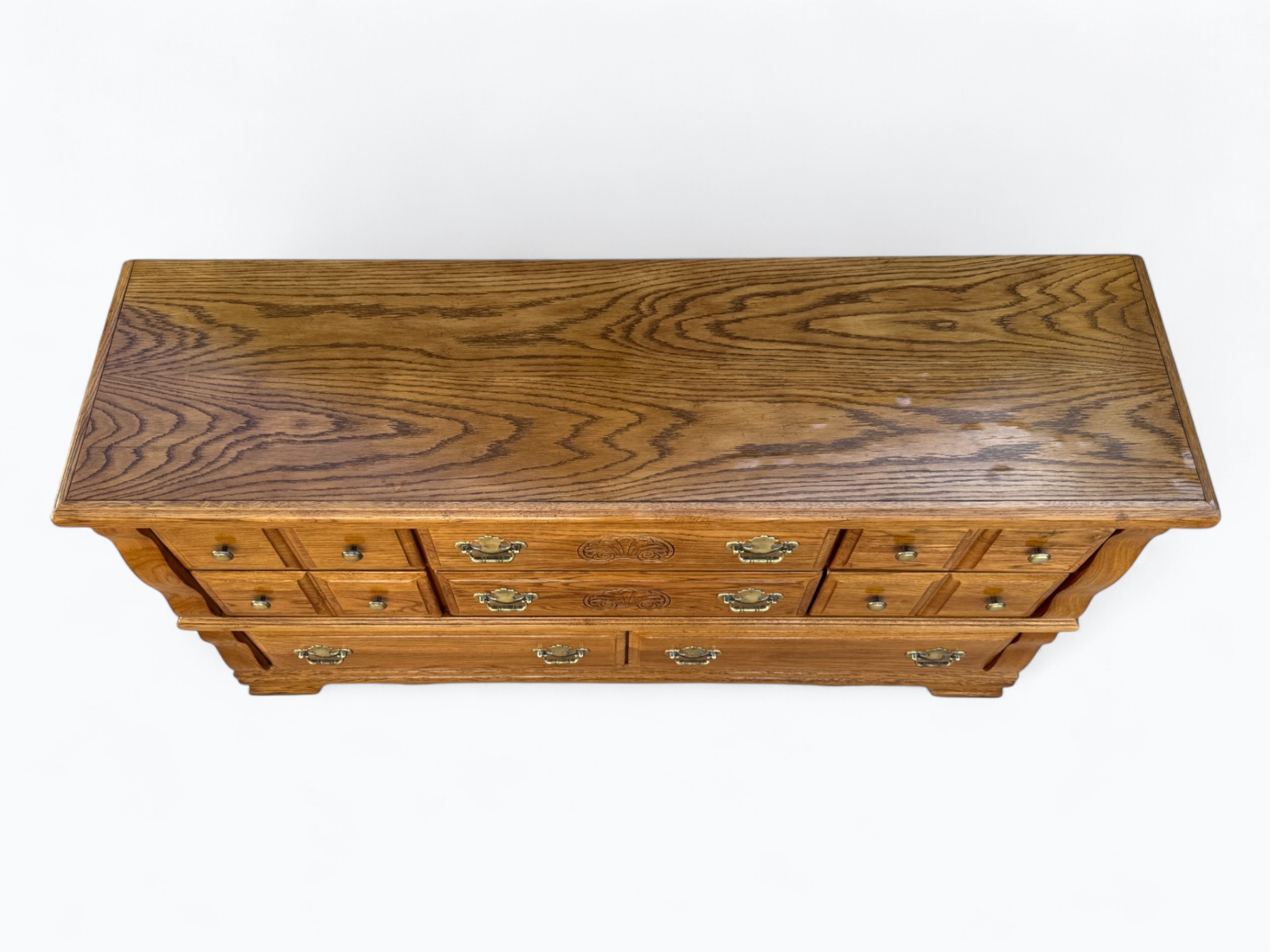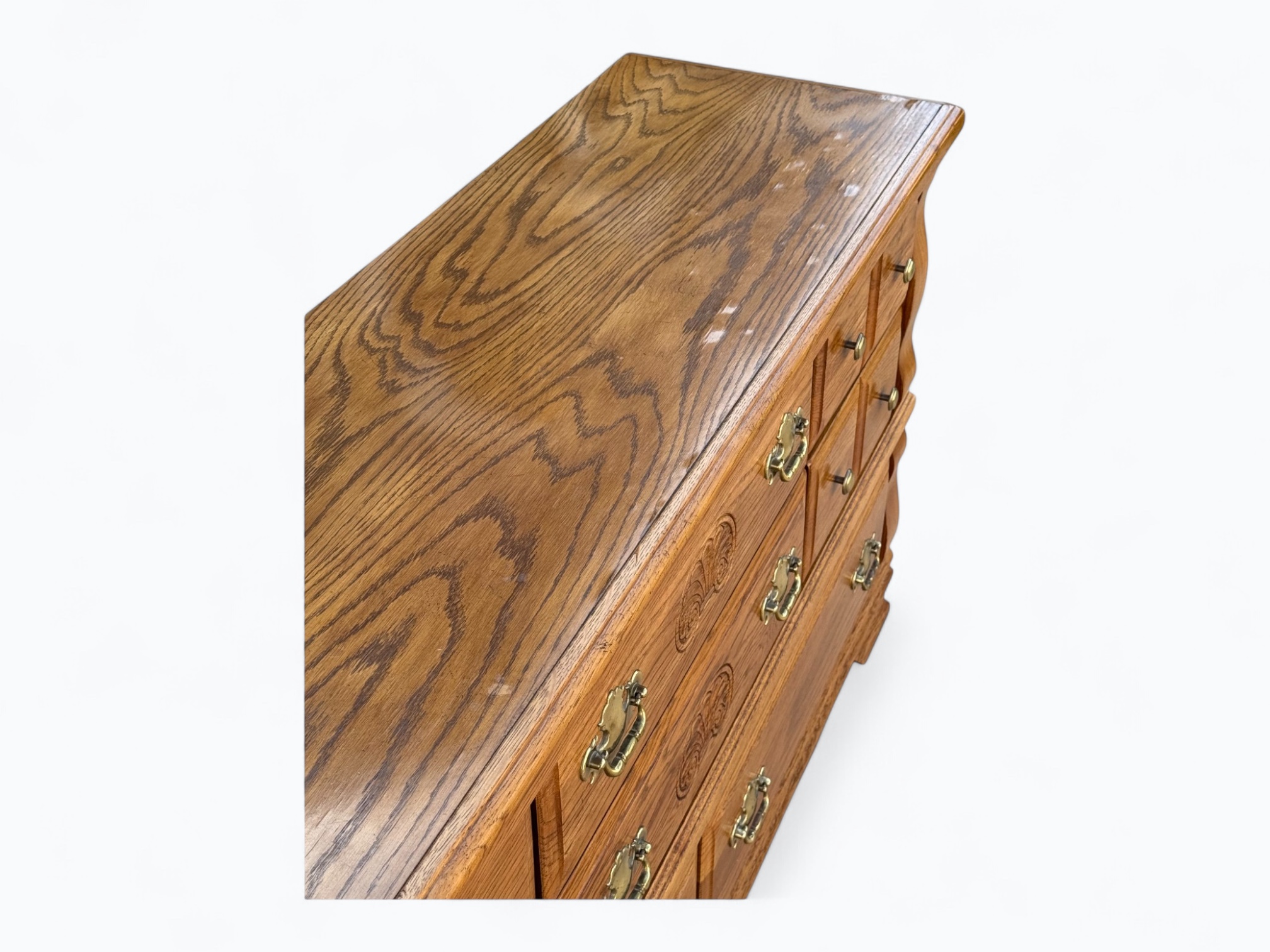 – Wide Dresser: 4 small drawers (2 on each side at the top) and 4 large drawers (2 with carved shell scroll medallion motifs); Scalloped bottom apron with routed detail; Fluted side columns with curved contour design; Projecting horizontal trim rail midway down that extends slightly past the dresser sides
