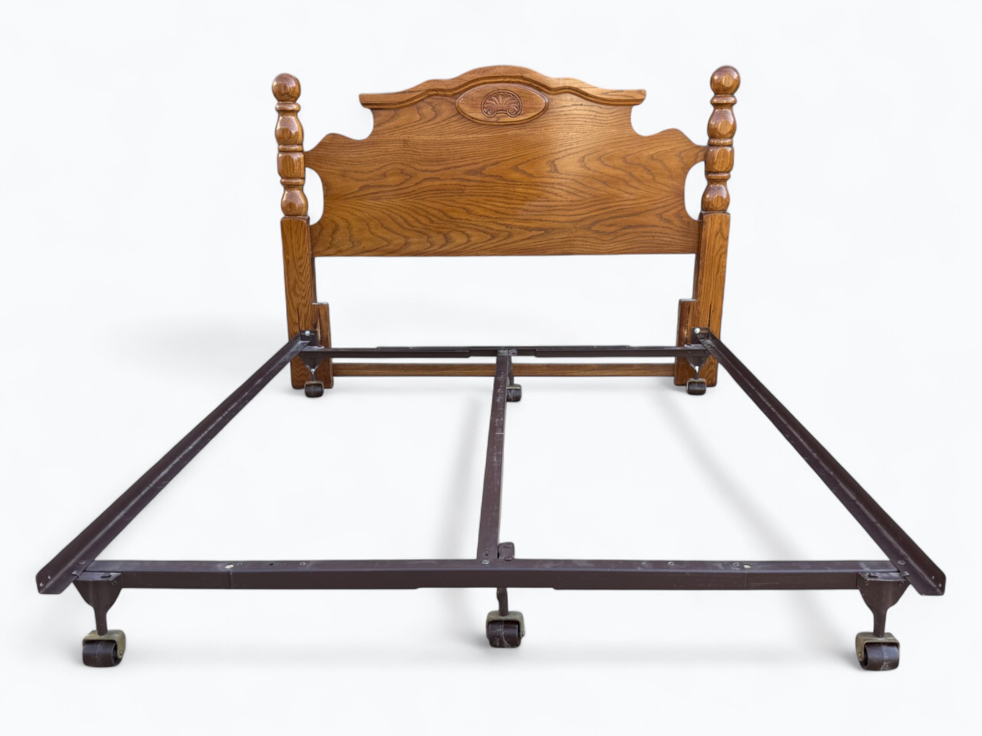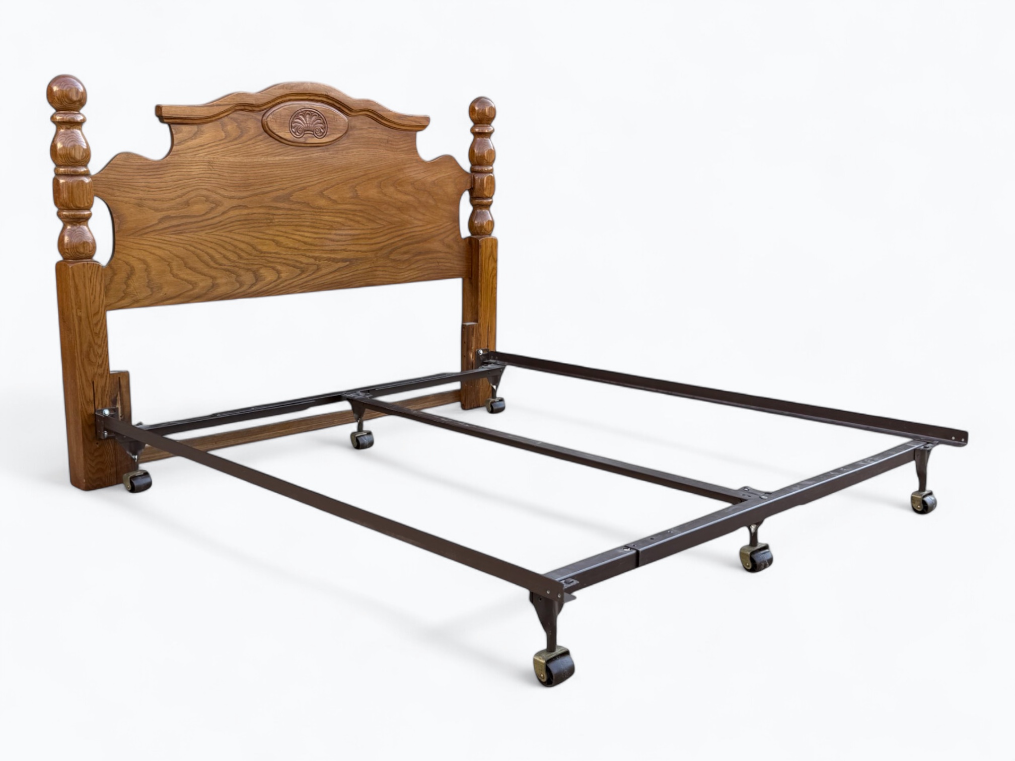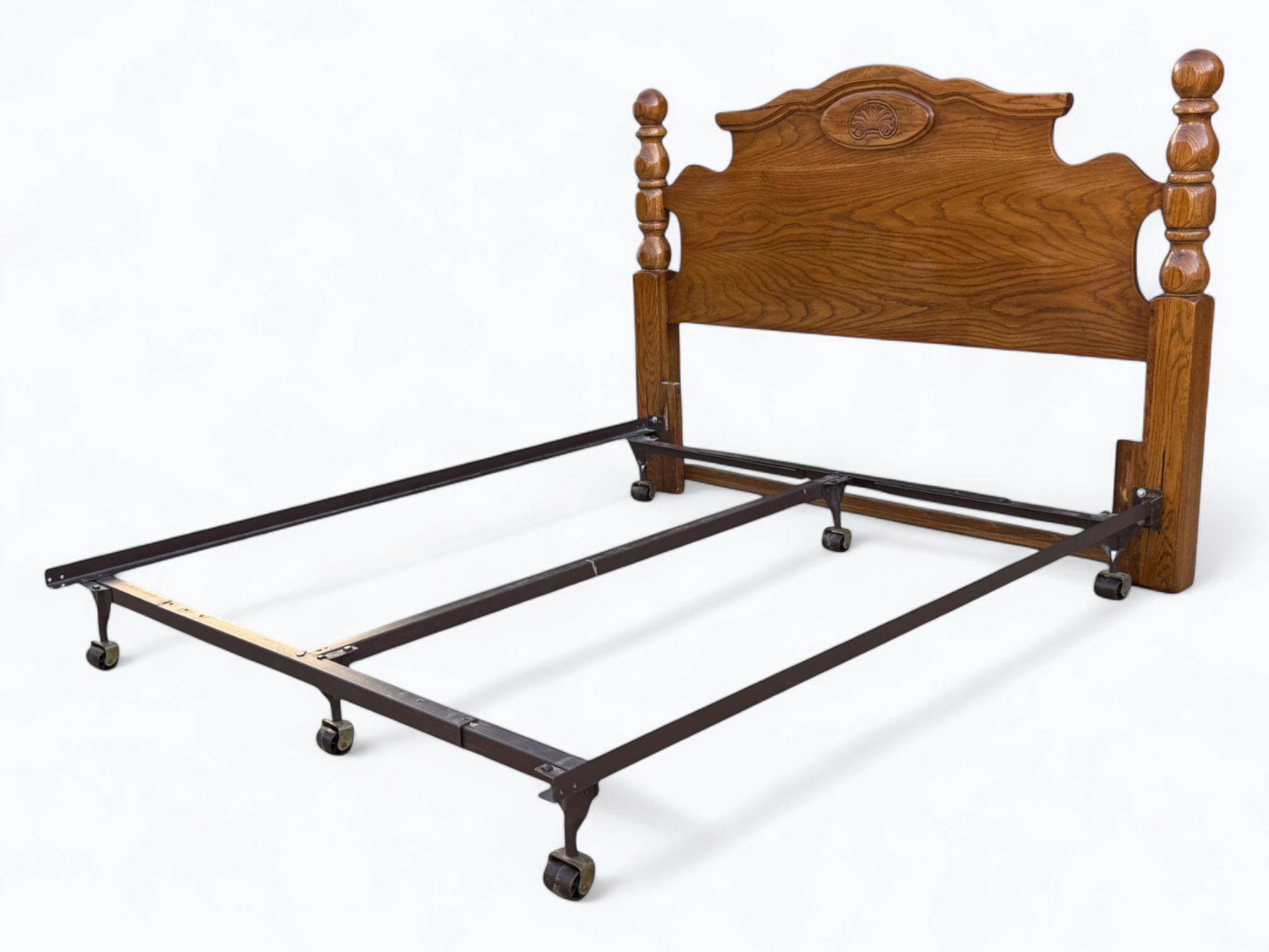 – Headboard: Curved top edge with scalloped crown design; Turned wood-style finials and posts on both sides; Arched side cutouts at base of top panel for a classic Americana profile; Can be used with a queen or full bed frame; Decorative carved shell scroll medallion centerpiece near top