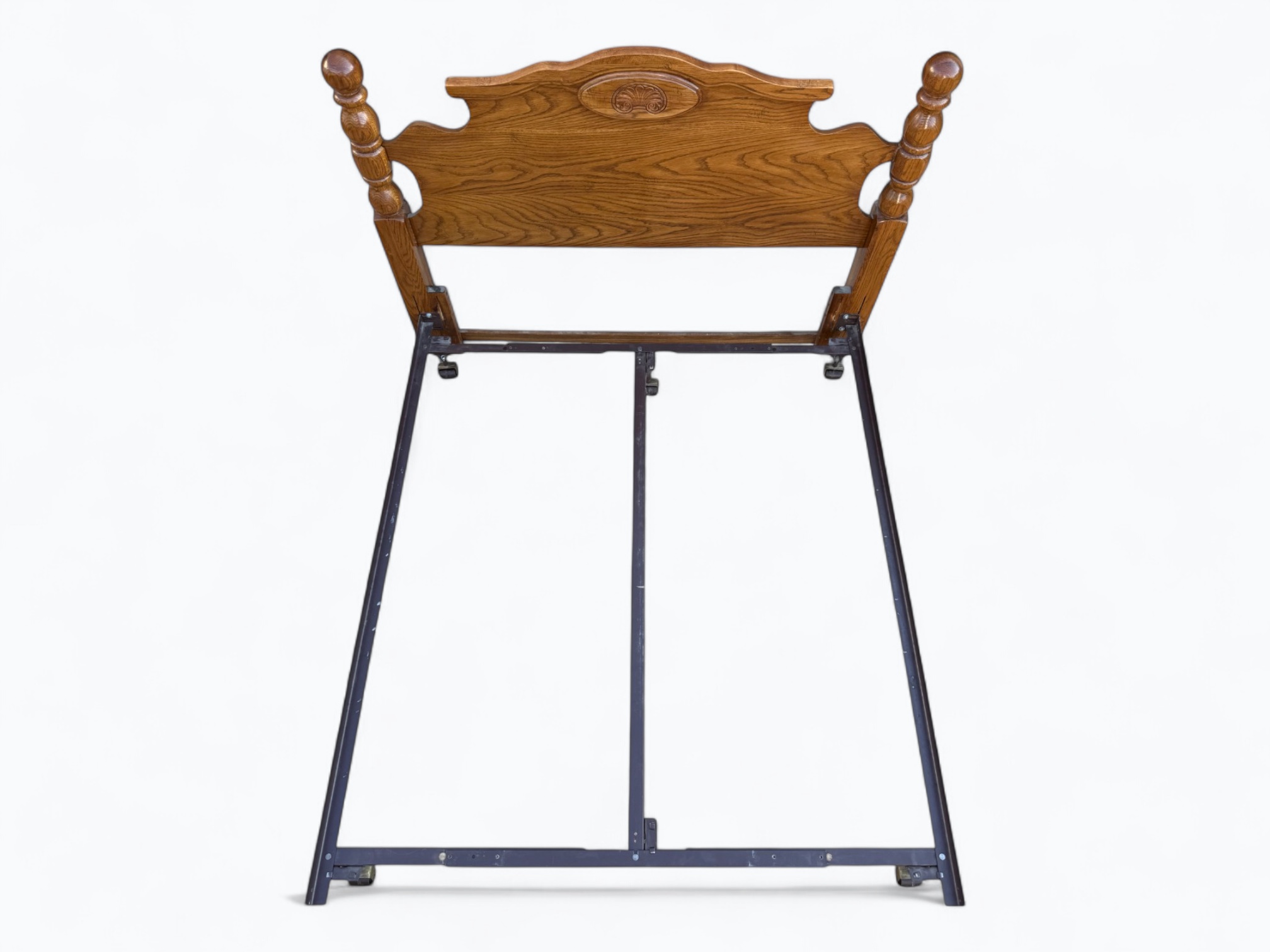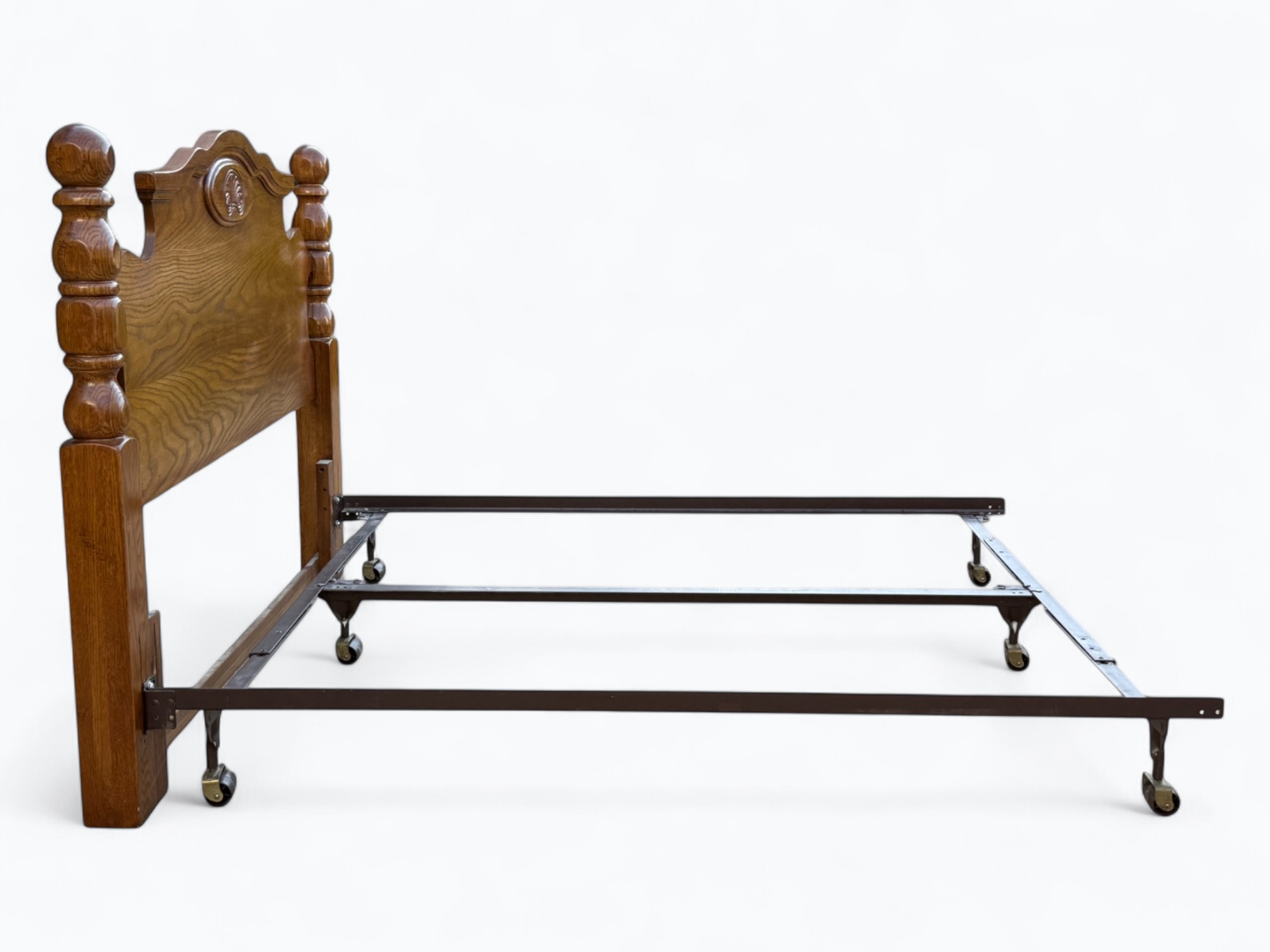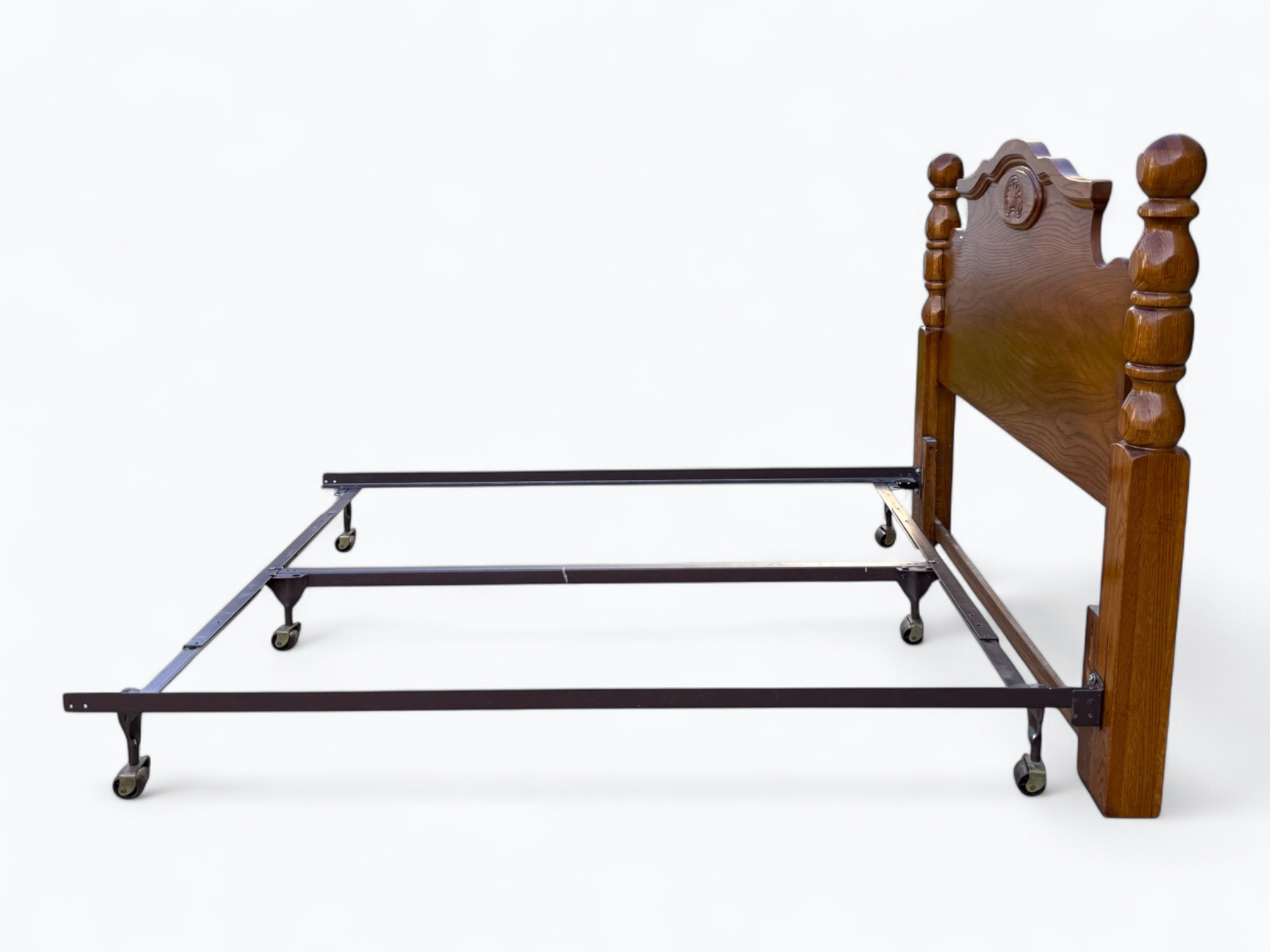 – Headboard: Curved top edge with scalloped crown design; Turned wood-style finials and posts on both sides; Arched side cutouts at base of top panel for a classic Americana profile; Can be used with a queen or full bed frame; Decorative carved shell scroll medallion centerpiece near top