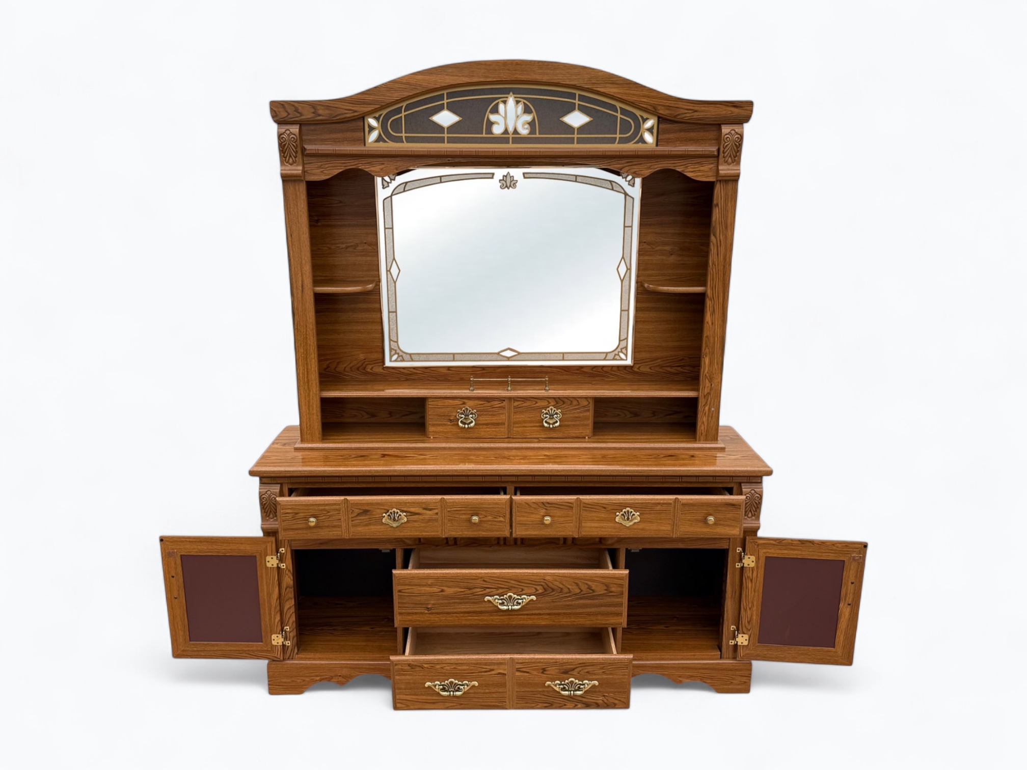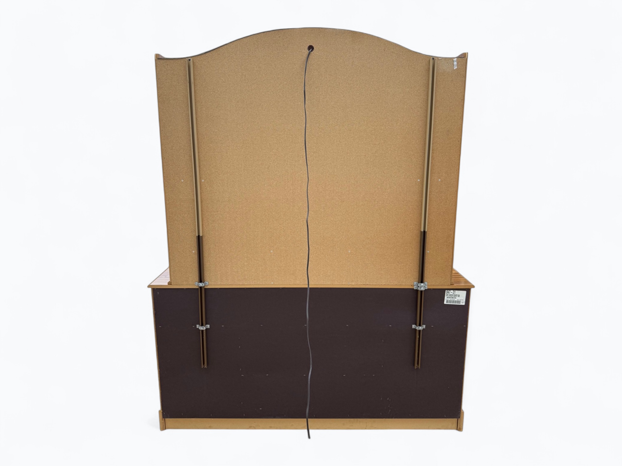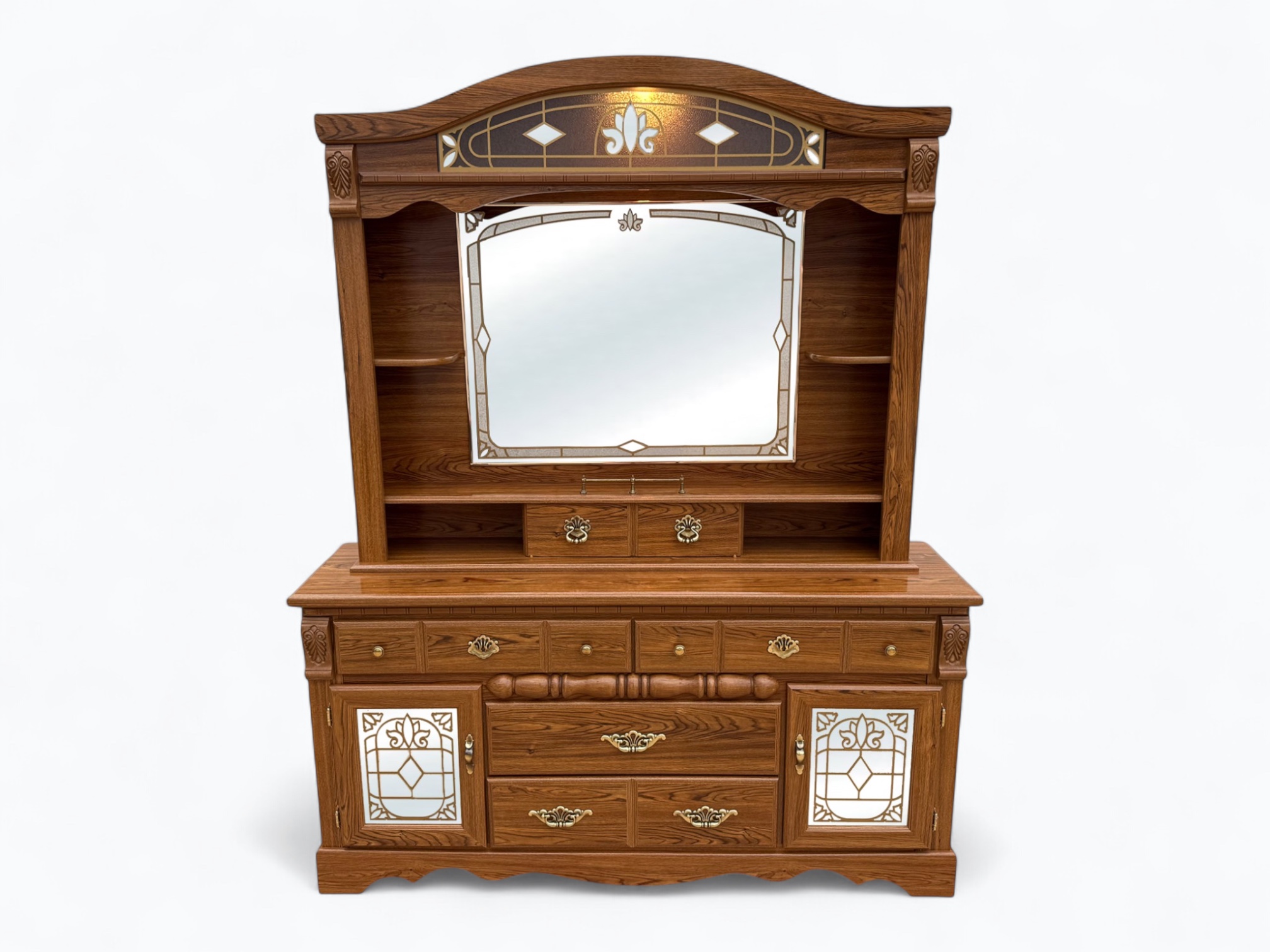 – Hutch: Arched top with light and glass; Large rectangular mirror in the center; Display shelf with center sliding door, 3 cubbies and a decorative railing in the middle; 2 small side shelves; Secured onto the dresser with metal rails and locking hardware on the back; Turned wood spindle rail accent in the center of the dressers