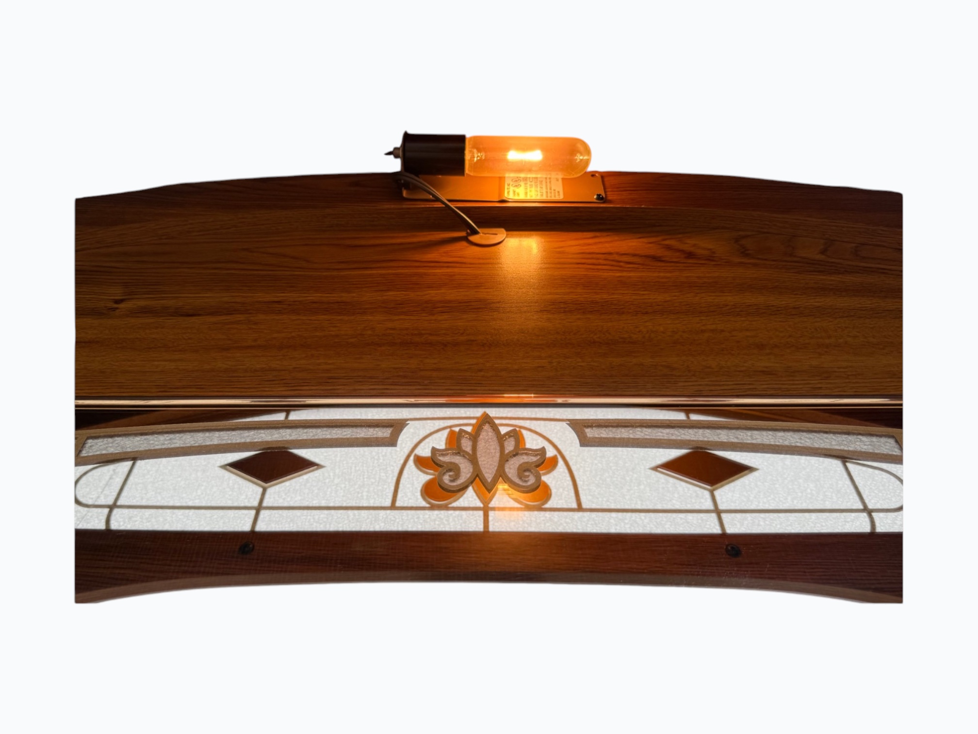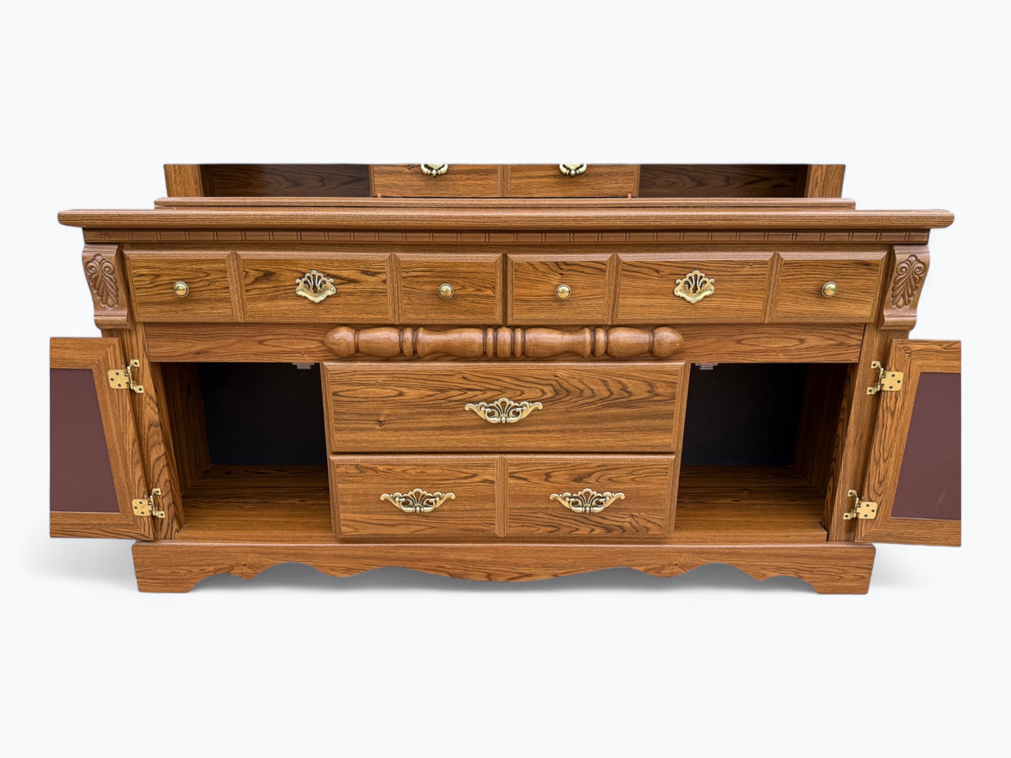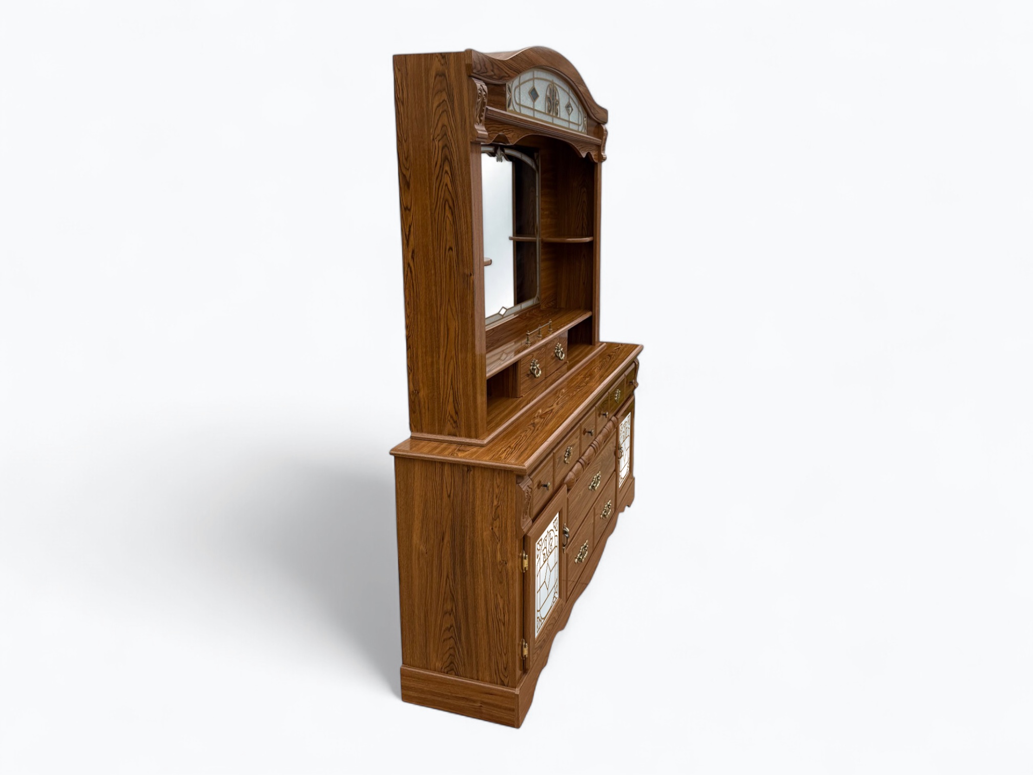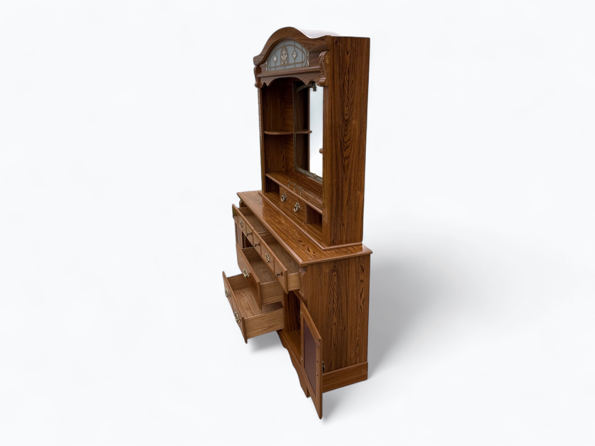 – Hutch: Arched top with light and glass; Large rectangular mirror in the center; Display shelf with center sliding door, 3 cubbies and a decorative railing in the middle; 2 small side shelves; Secured onto the dresser with metal rails and locking hardware on the back; Turned wood spindle rail accent in the center of the dressers