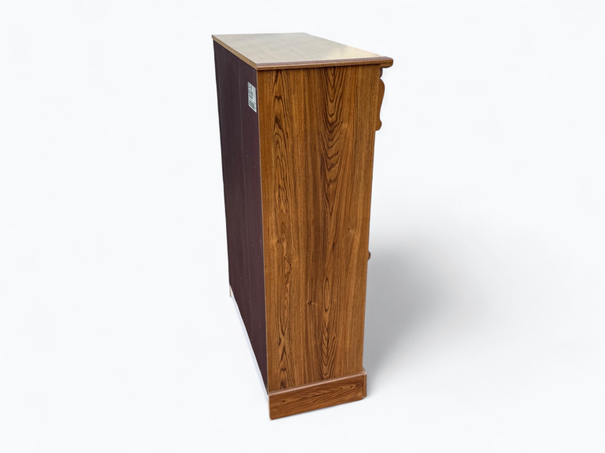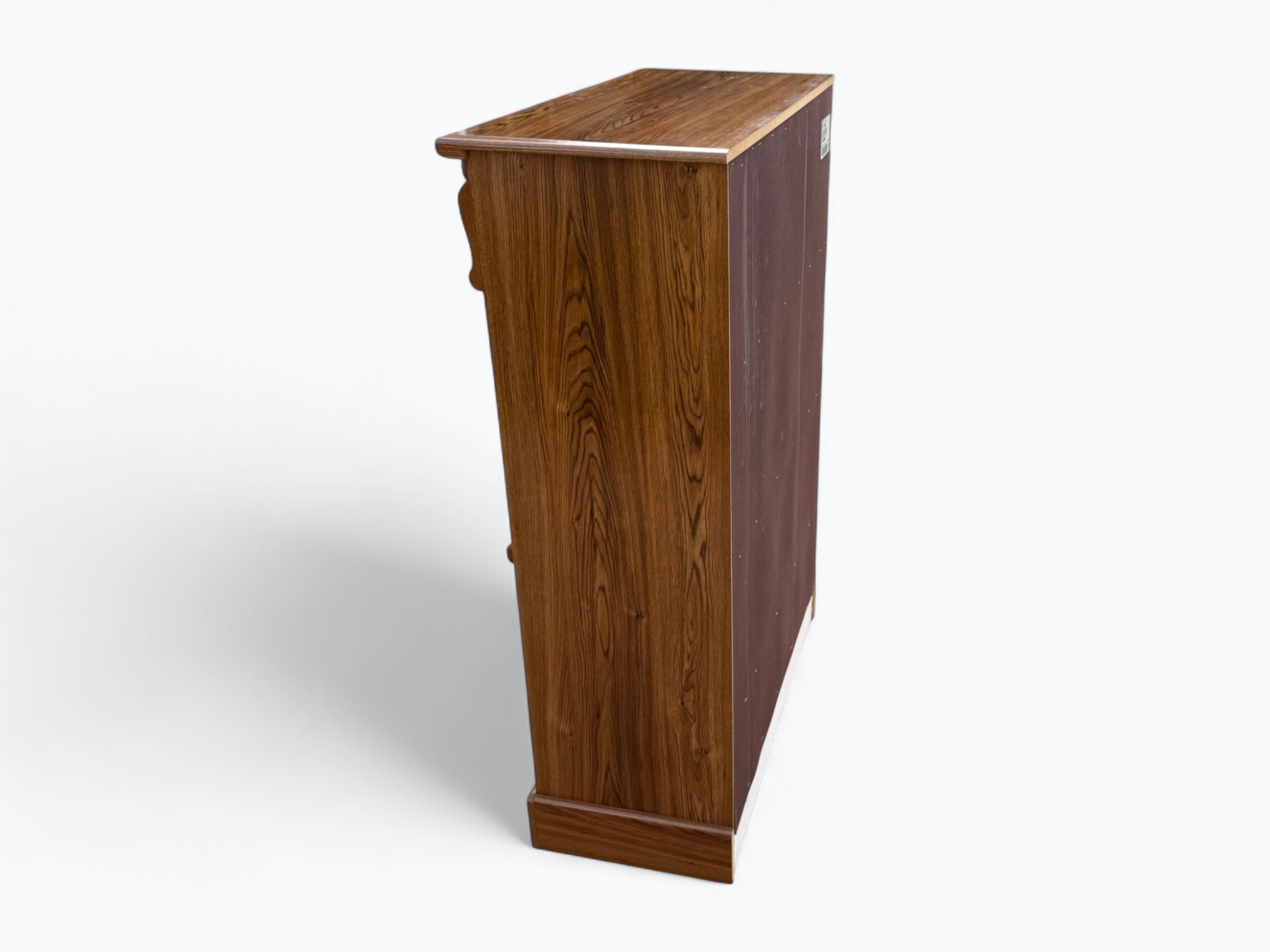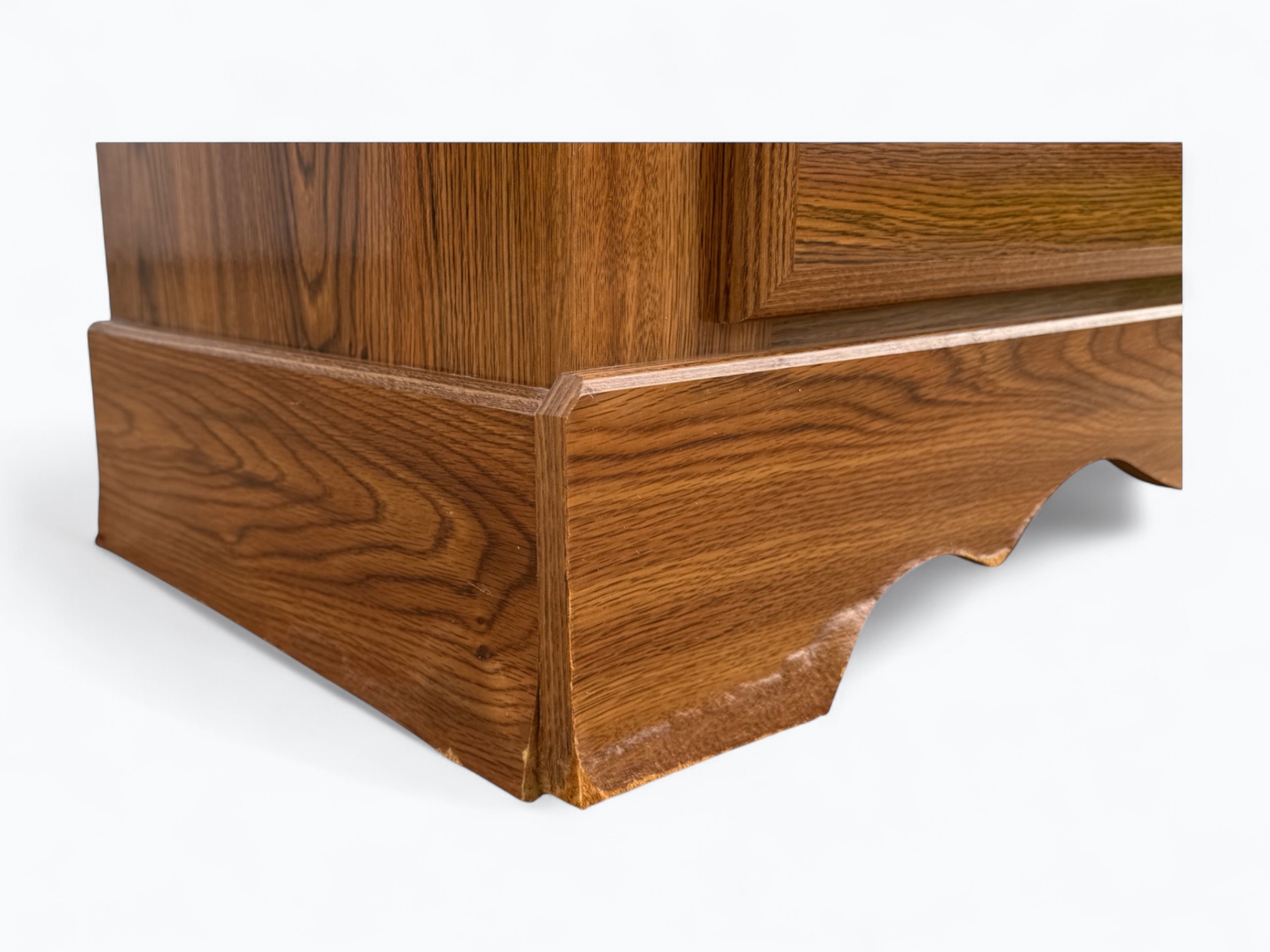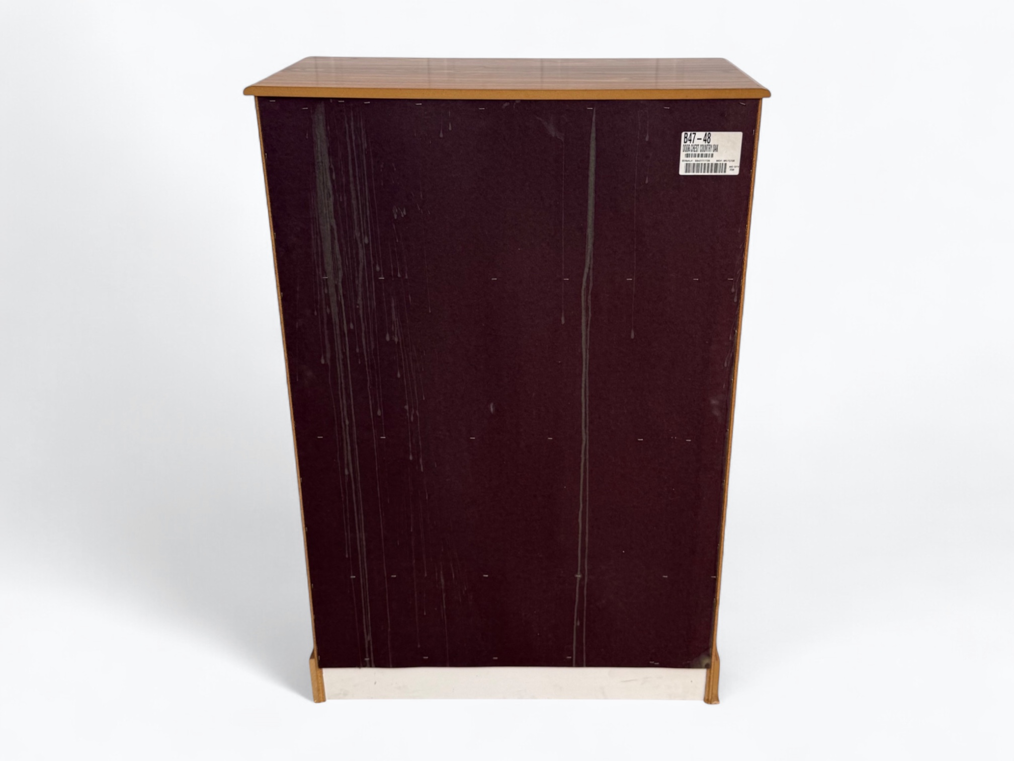 – Tall Dresser: 6.5/10; Fair condition; Some water damage on corner at the bottom; Some bubbling on the front of the cabinet doors; Some marks on the top