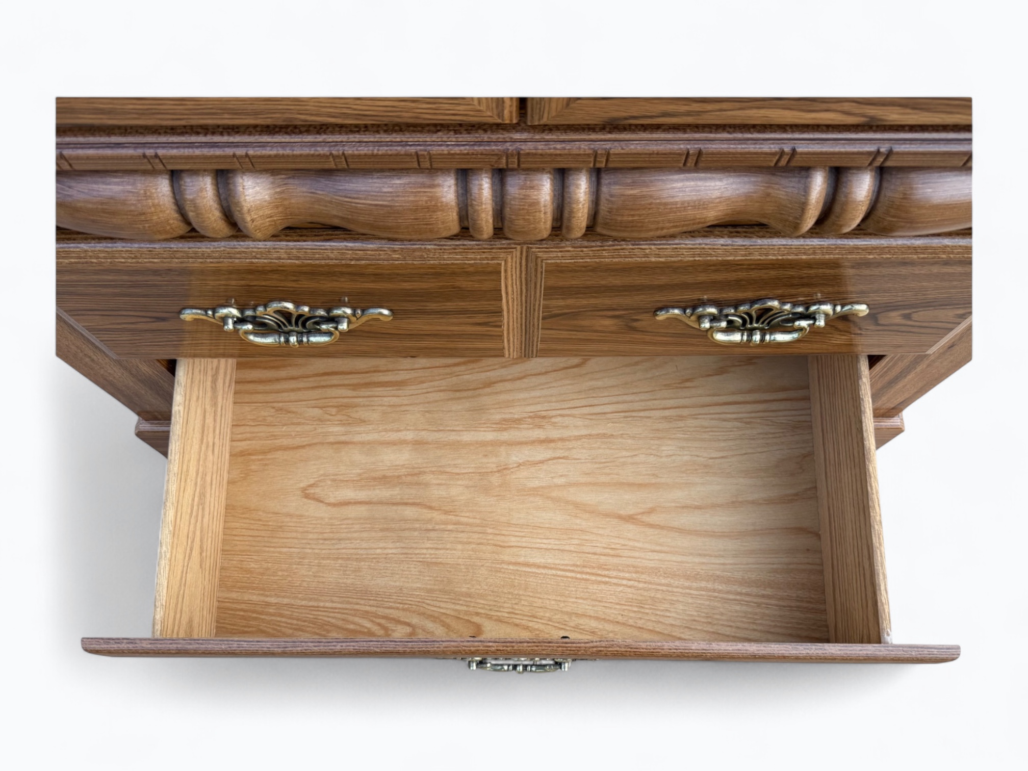 – Wide Dresser: 2 medium top drawers; 2 large drawers in the middle at the bottom; 2 decorative mirrored cabinet doors with magnetic door catch hardware and storage space inside
