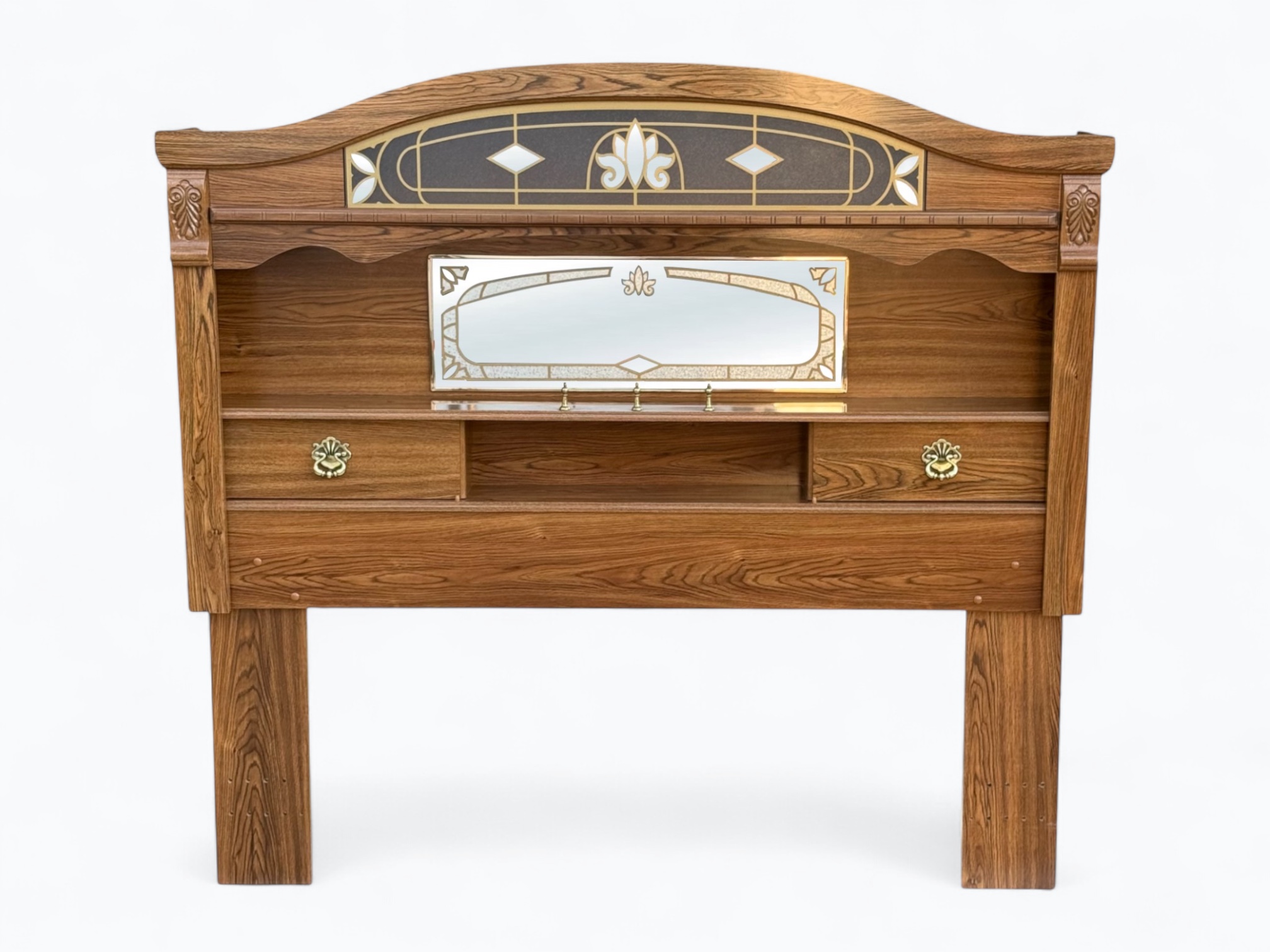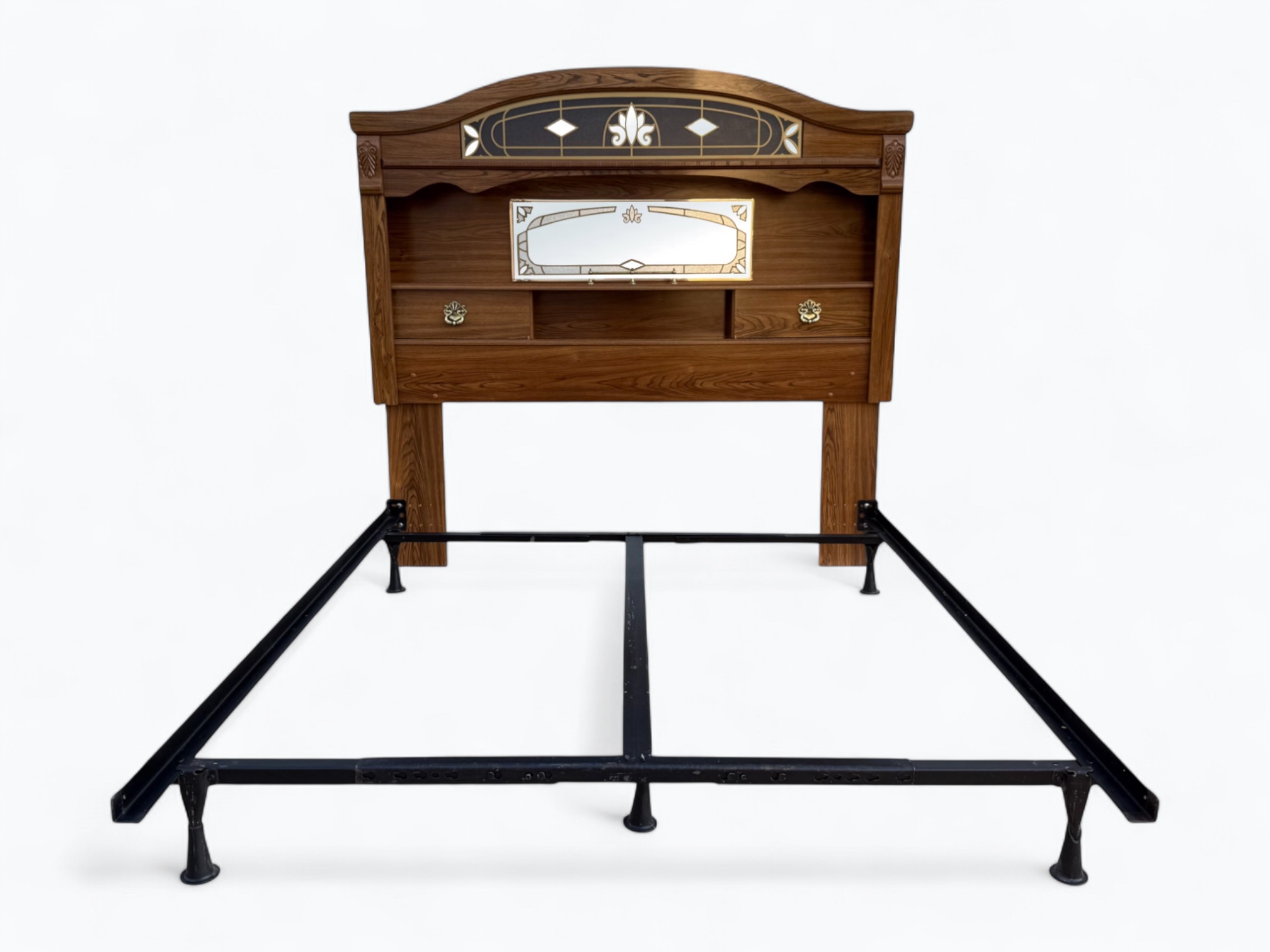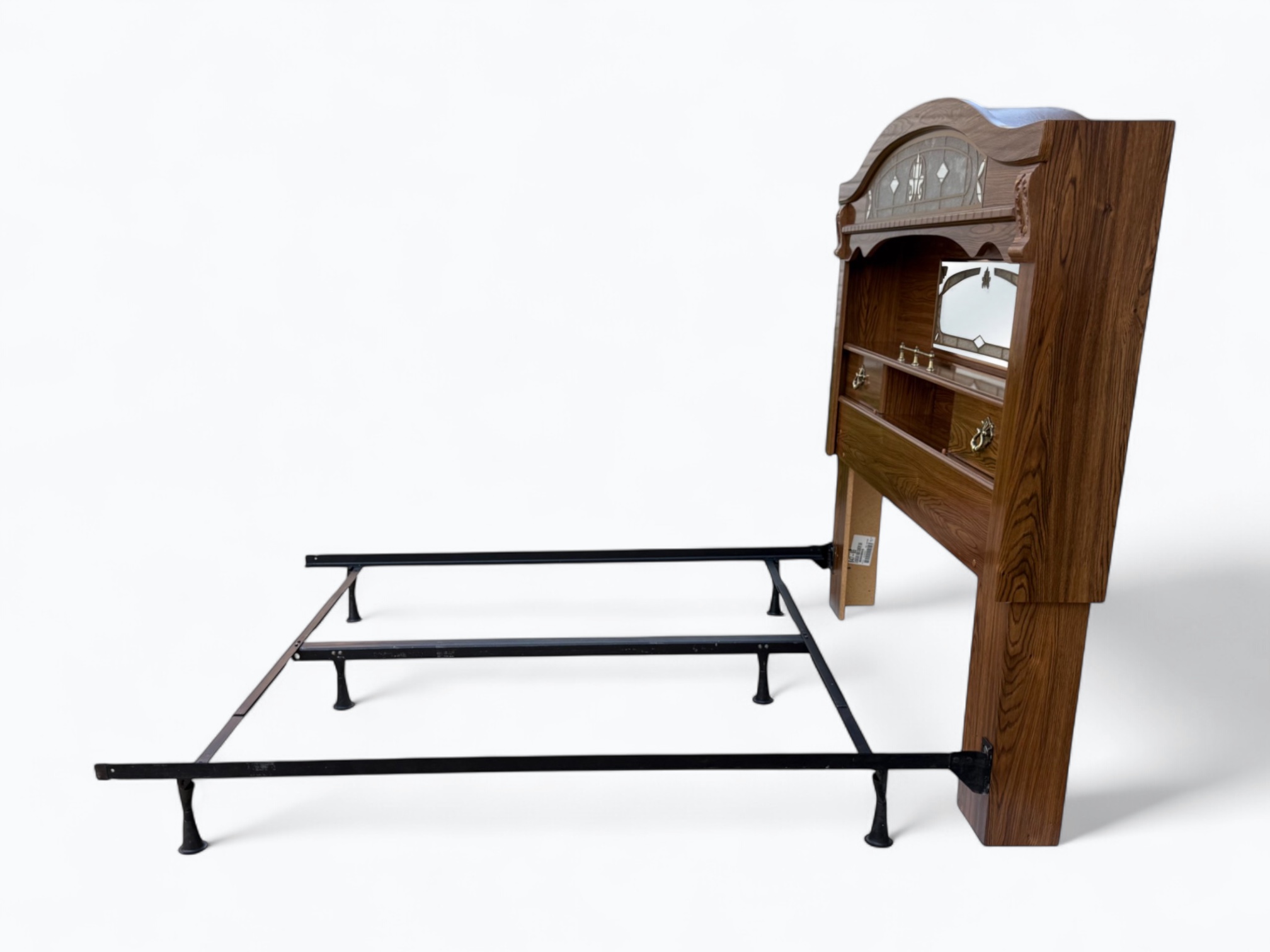 – Headboard: Arched top with glass; Small rectangular mirror on the center; Display shelf with 2 sliding doors, 3 cubbies and a decorative railing in the middle; L-shaped legs can be disassembled for easy transportation or storage; Can be used with a full or queen size bed frame