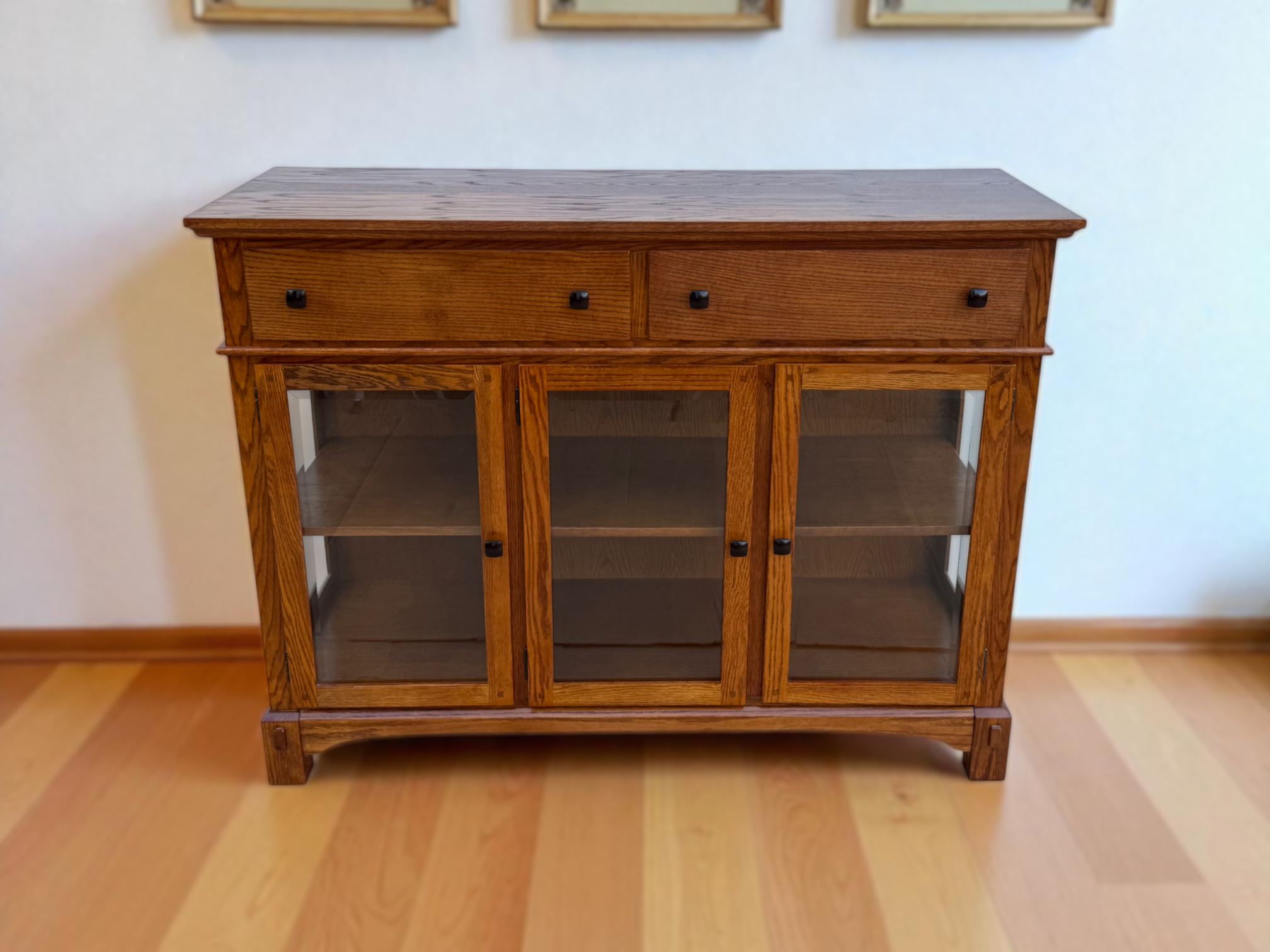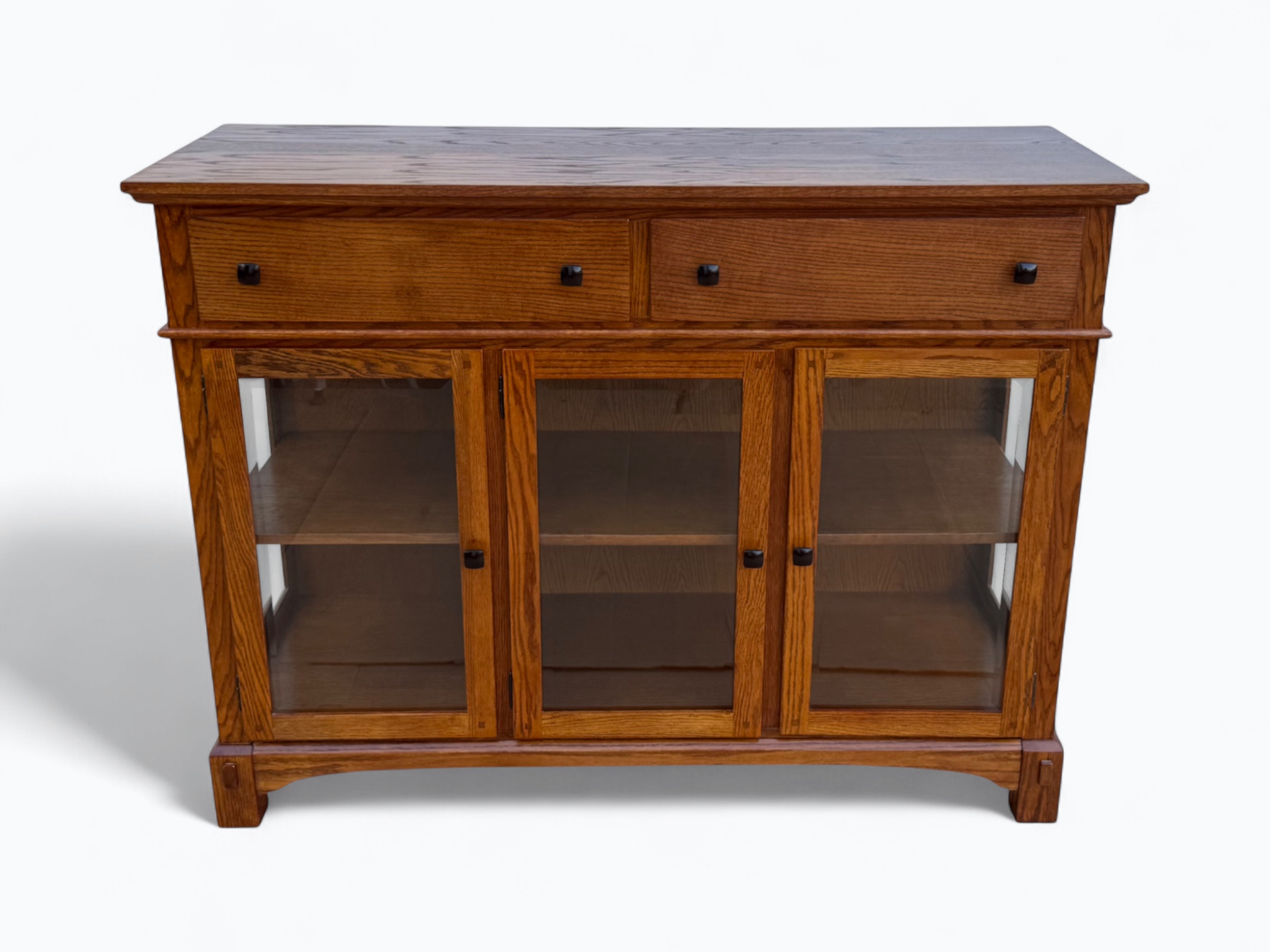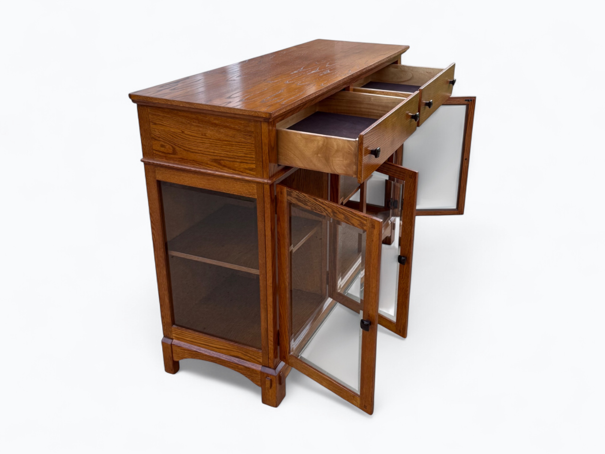 • [Features]: 2 drawers at the top with felt lining, English dovetail drawer construction with corner block braces and full extension metal glides; 3-panel beveled glass doors with 2 adjustable shelves; Beveled glass sides; Mortise and tenon detailing; Short legs with adjustable levelers; Solid and heavy construction