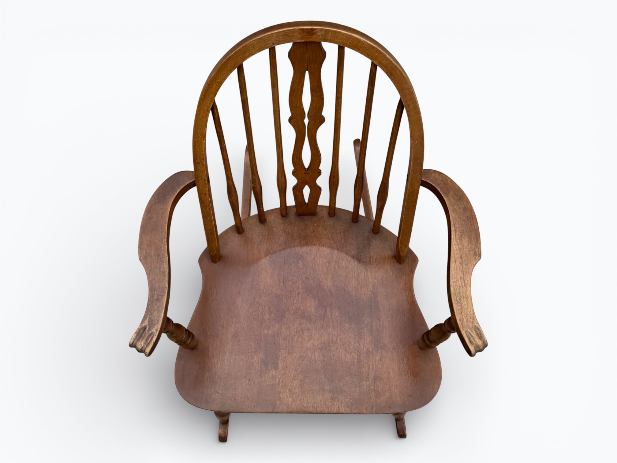 • [Features]: Windsor spindle back style; Central shaped decorative splat; Saddle seat; Carved claw arms; Turned legs and stretchers