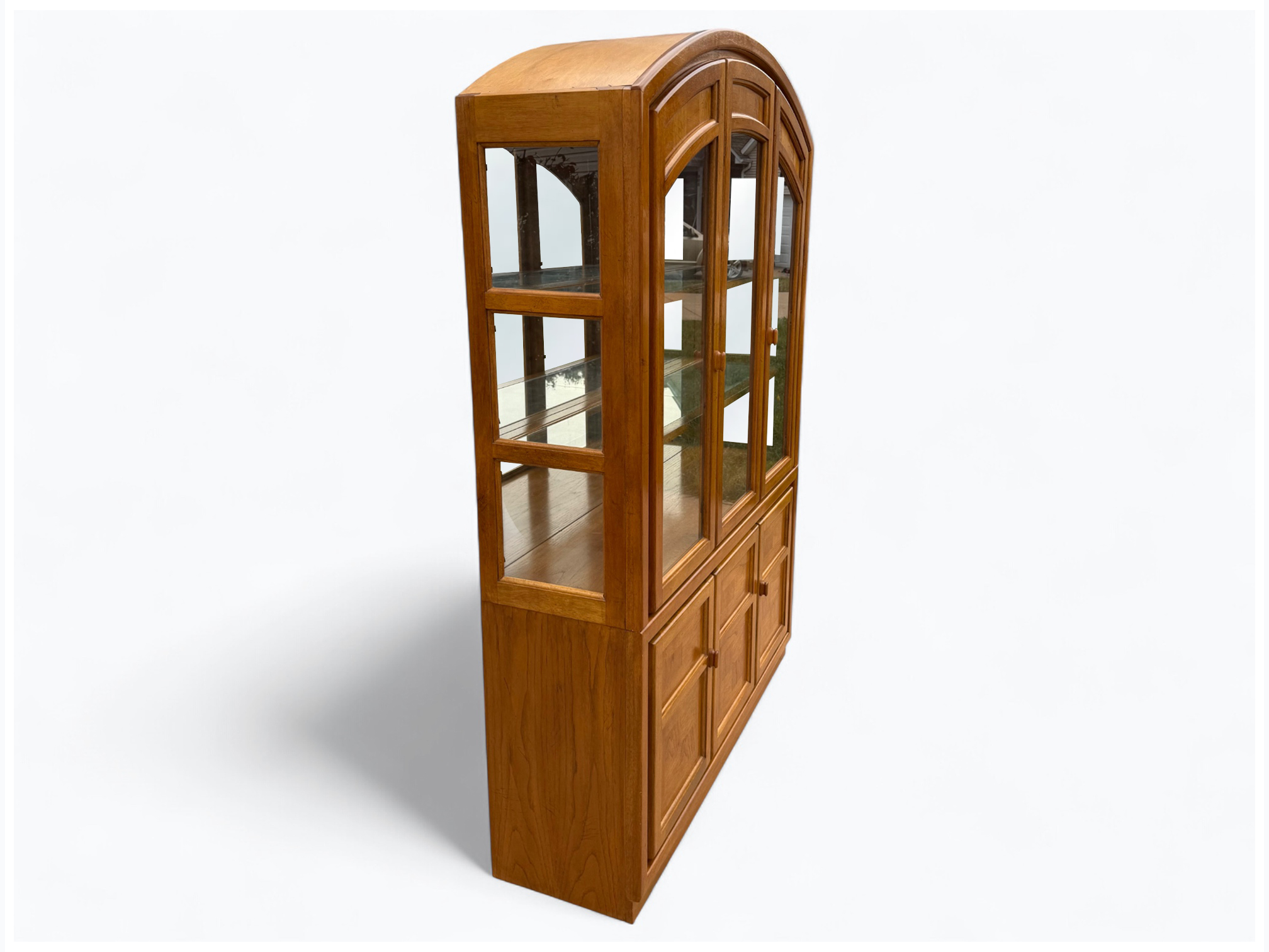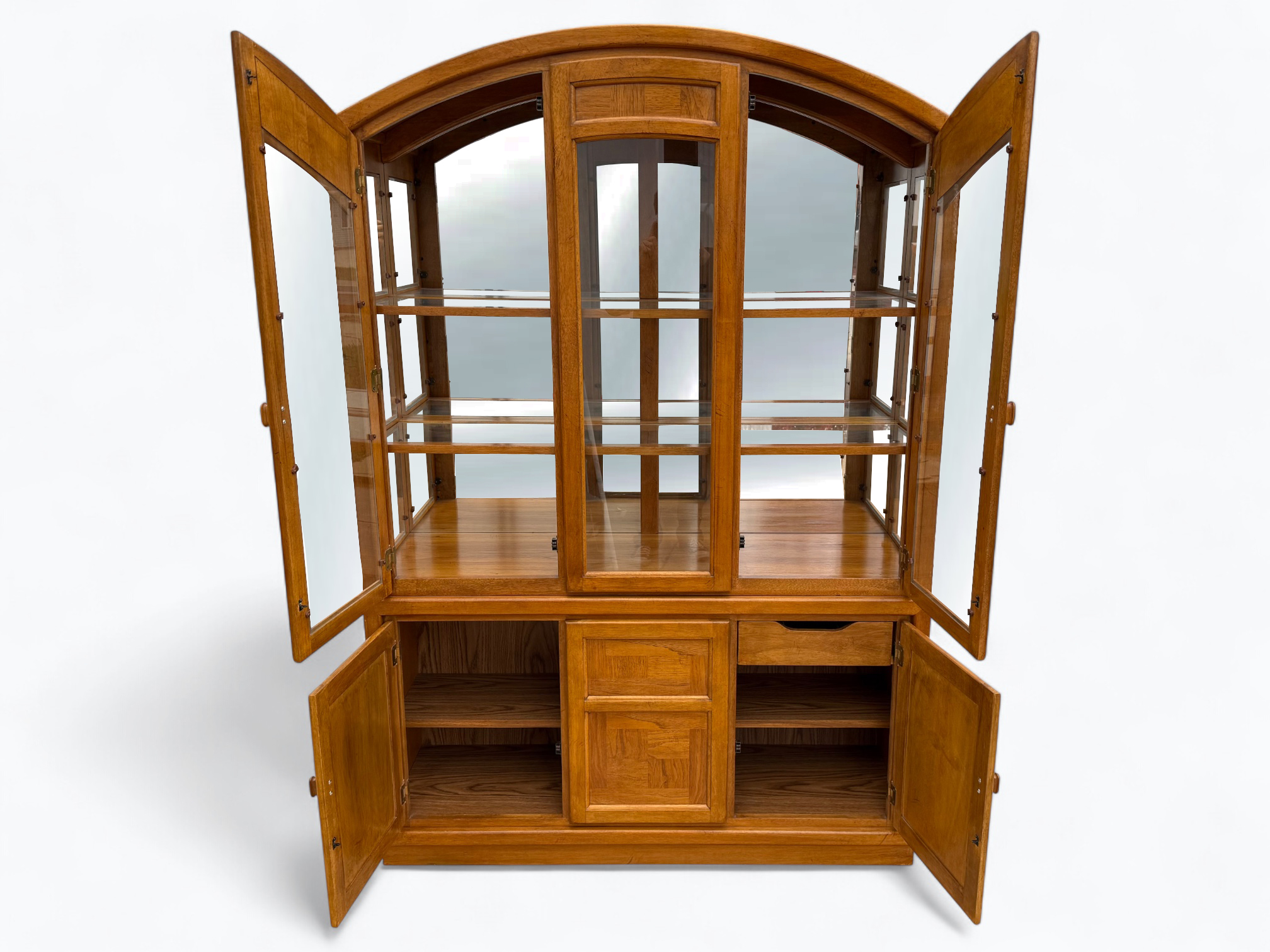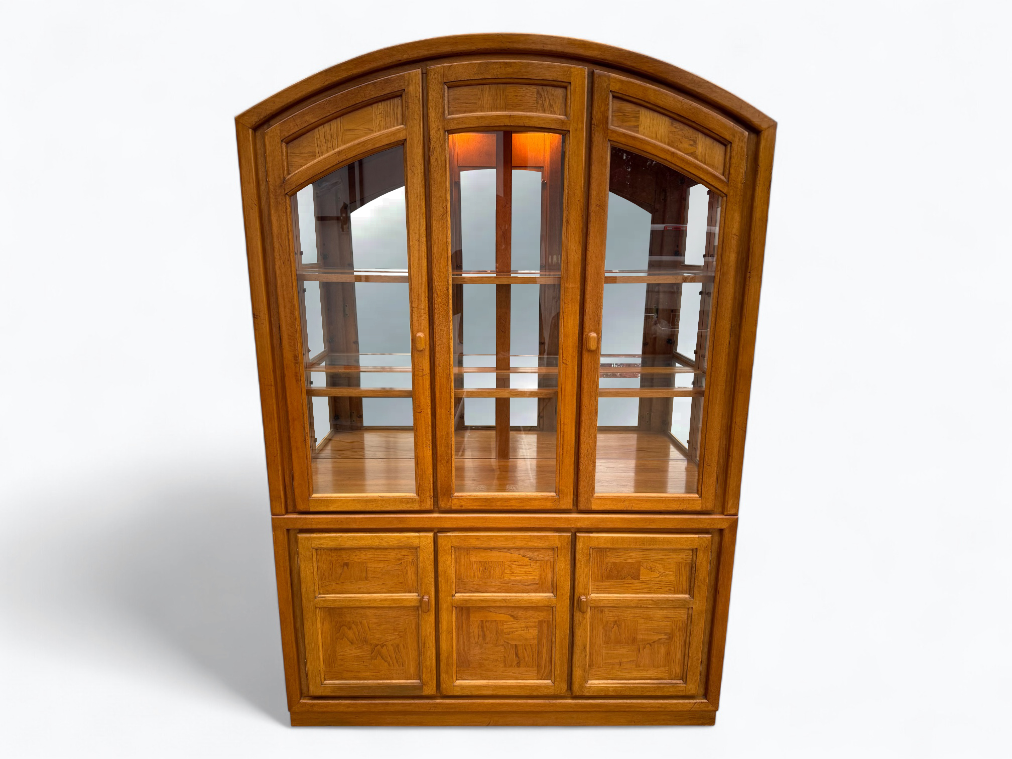 – Hutch: Fixed wood shelves with glass shelf inserts; Mirrored back glass; Glass sides and cabinet doors; Center door does not open; Arched top; Inner light