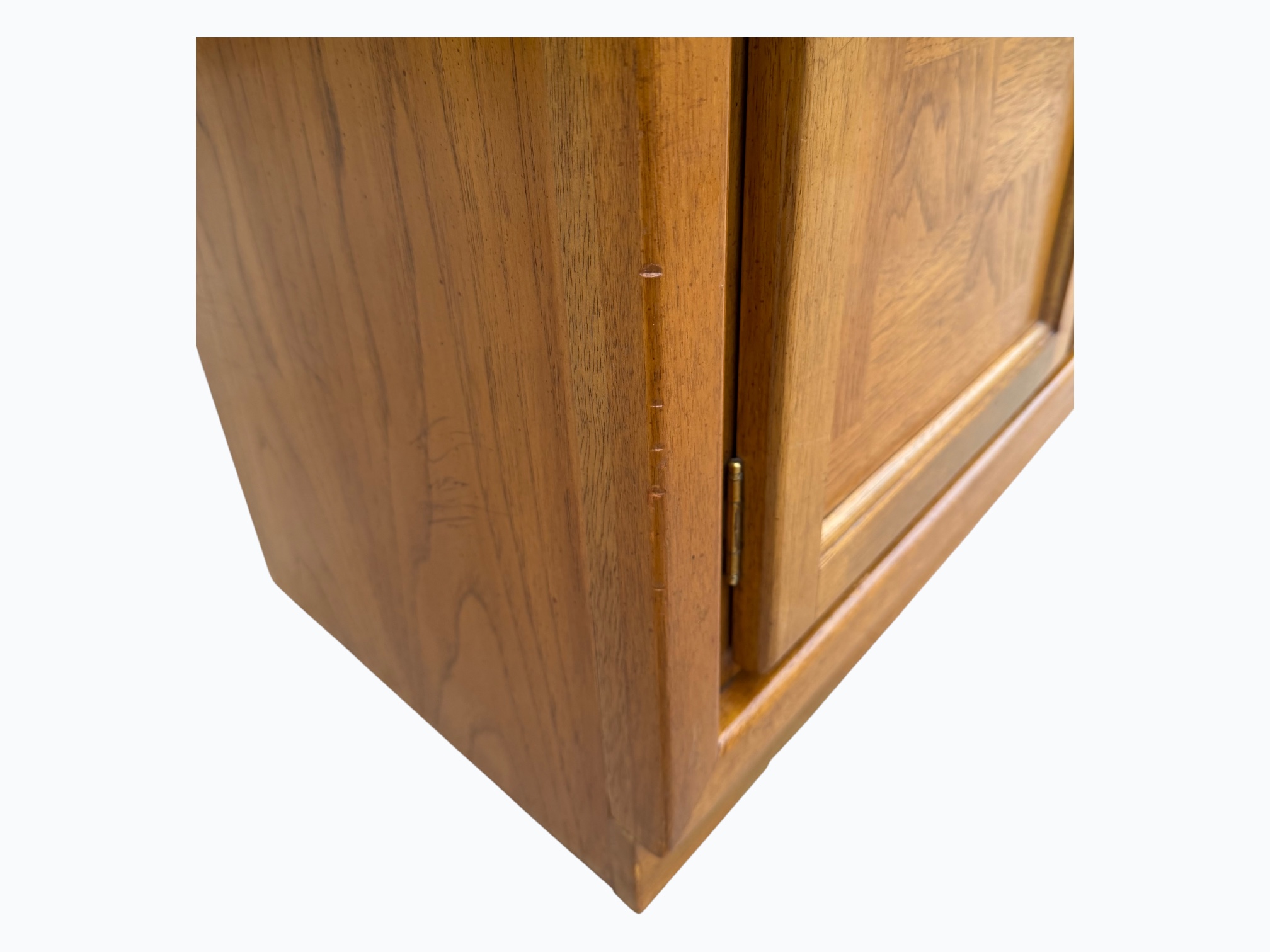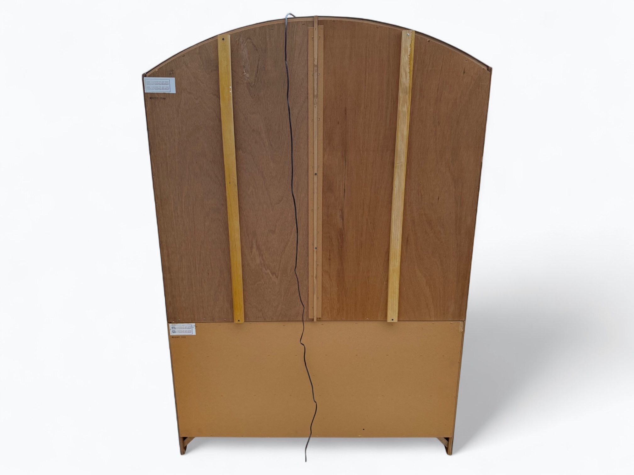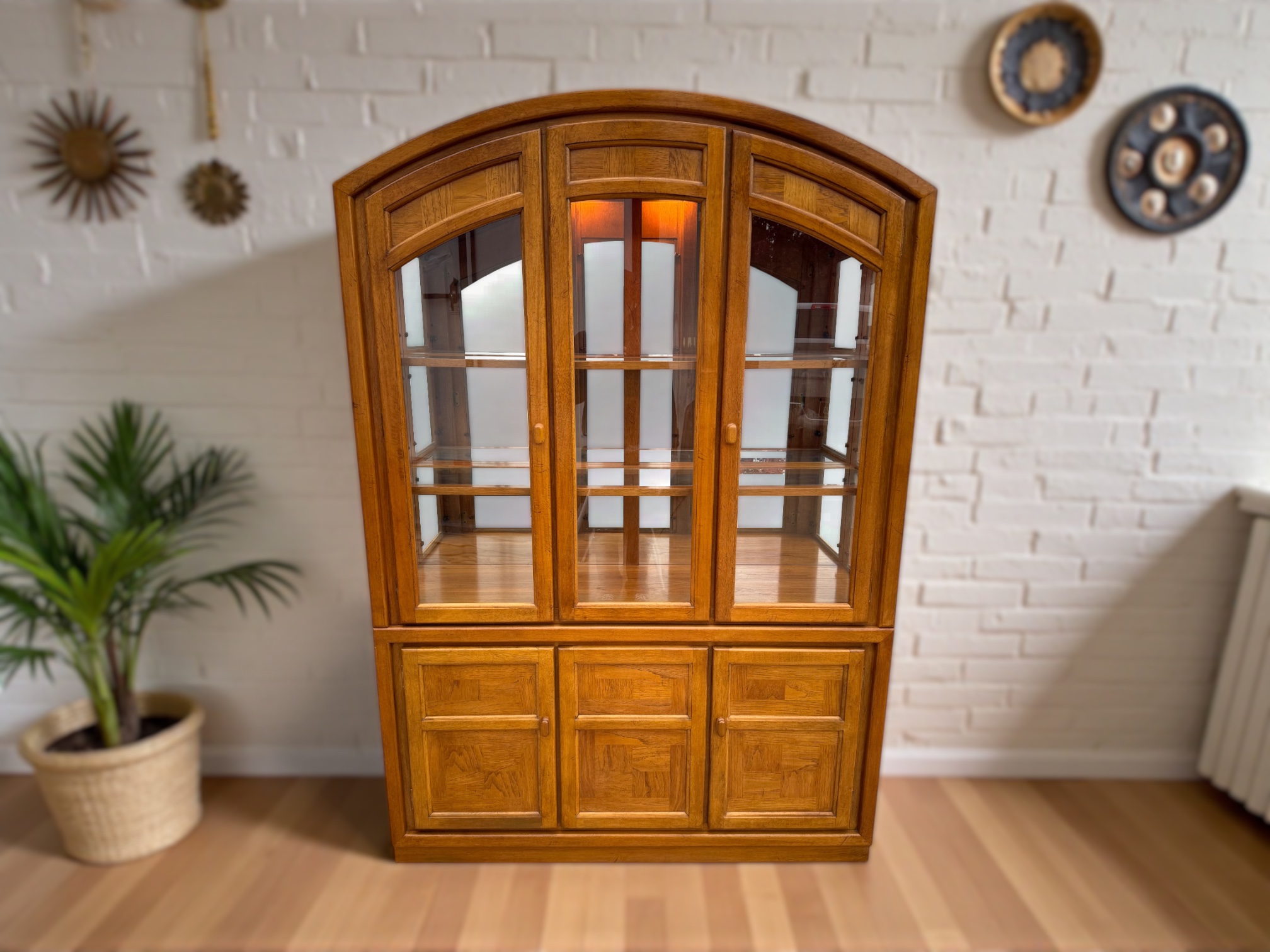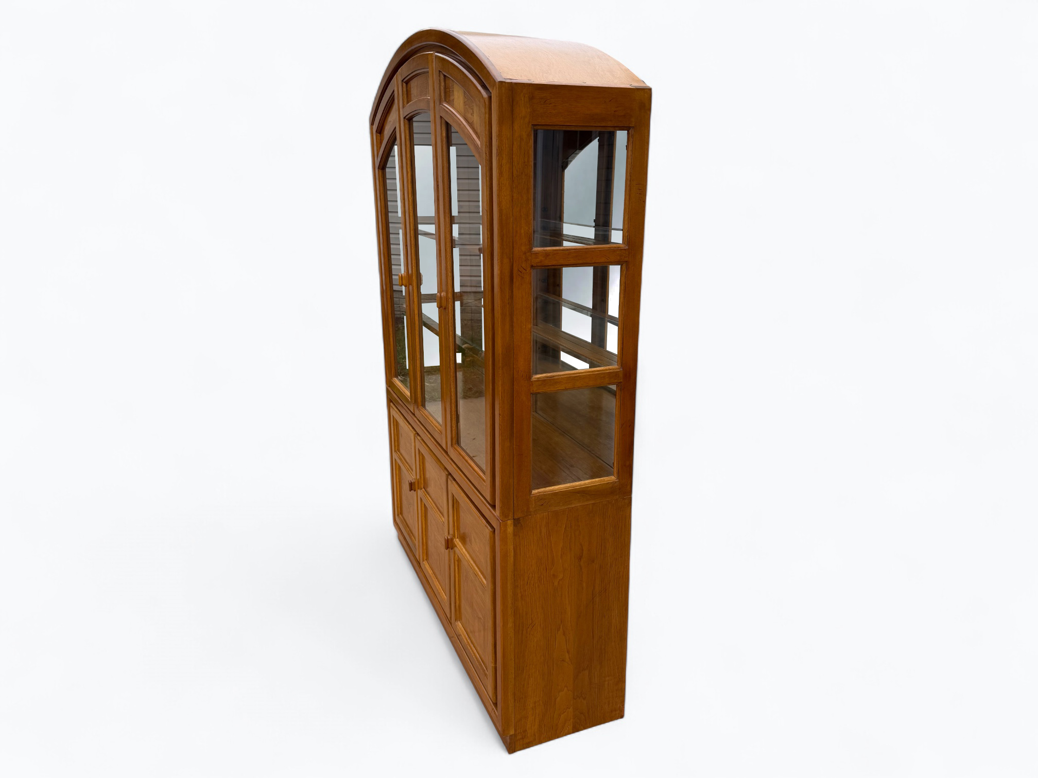 – Hutch: Fixed wood shelves with glass shelf inserts; Mirrored back glass; Glass sides and cabinet doors; Center door does not open; Arched top; Inner light