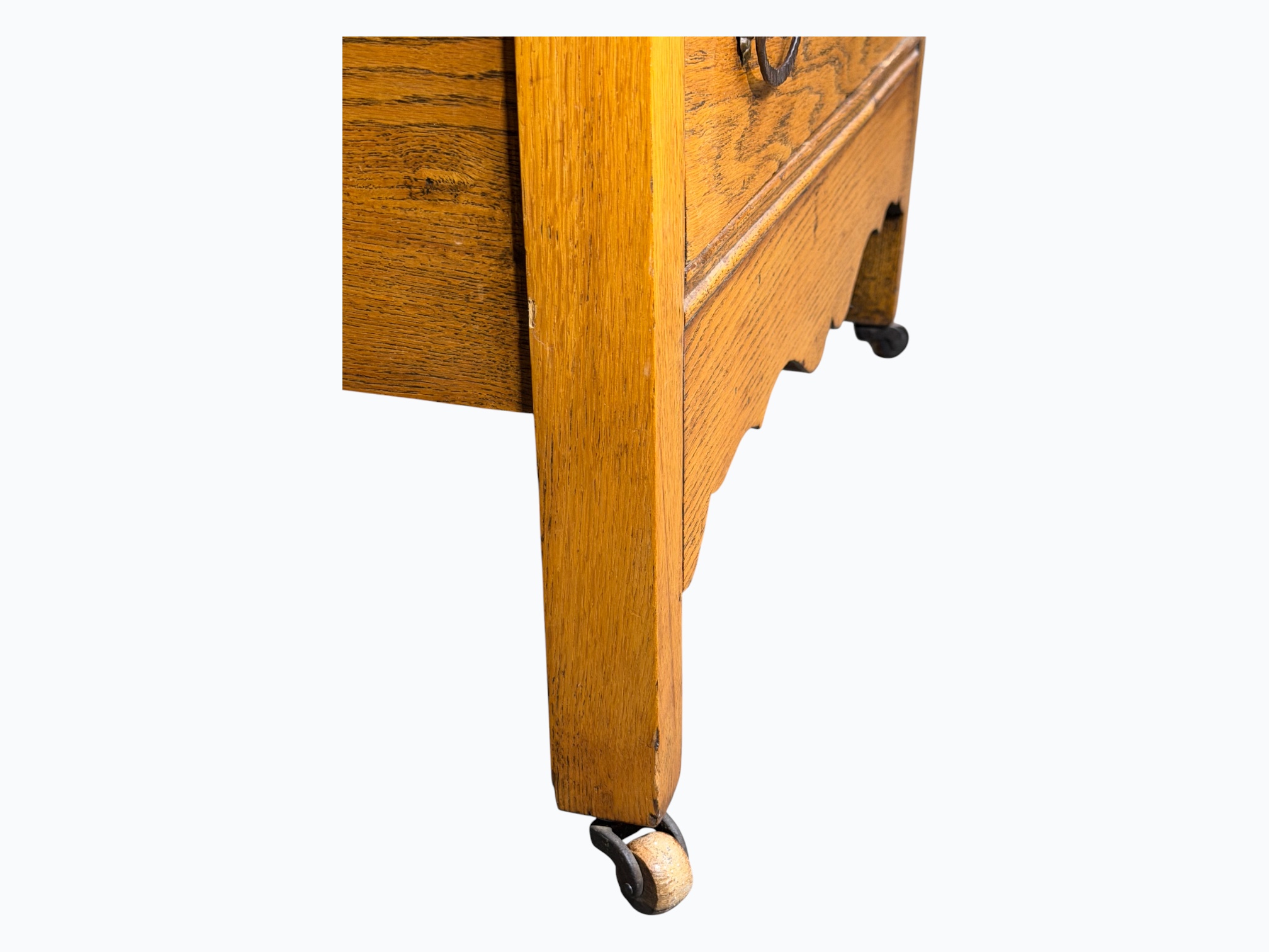 • [Features]: 5 drawers with wood drawer stoppers integrated into the frame; Thin bail style drawer pulls; Center lock at the top of each drawer; On castor wheels; Dovetail and joinery construction; Overhanging cornice top; Scalloped apron; Original square nut hardware