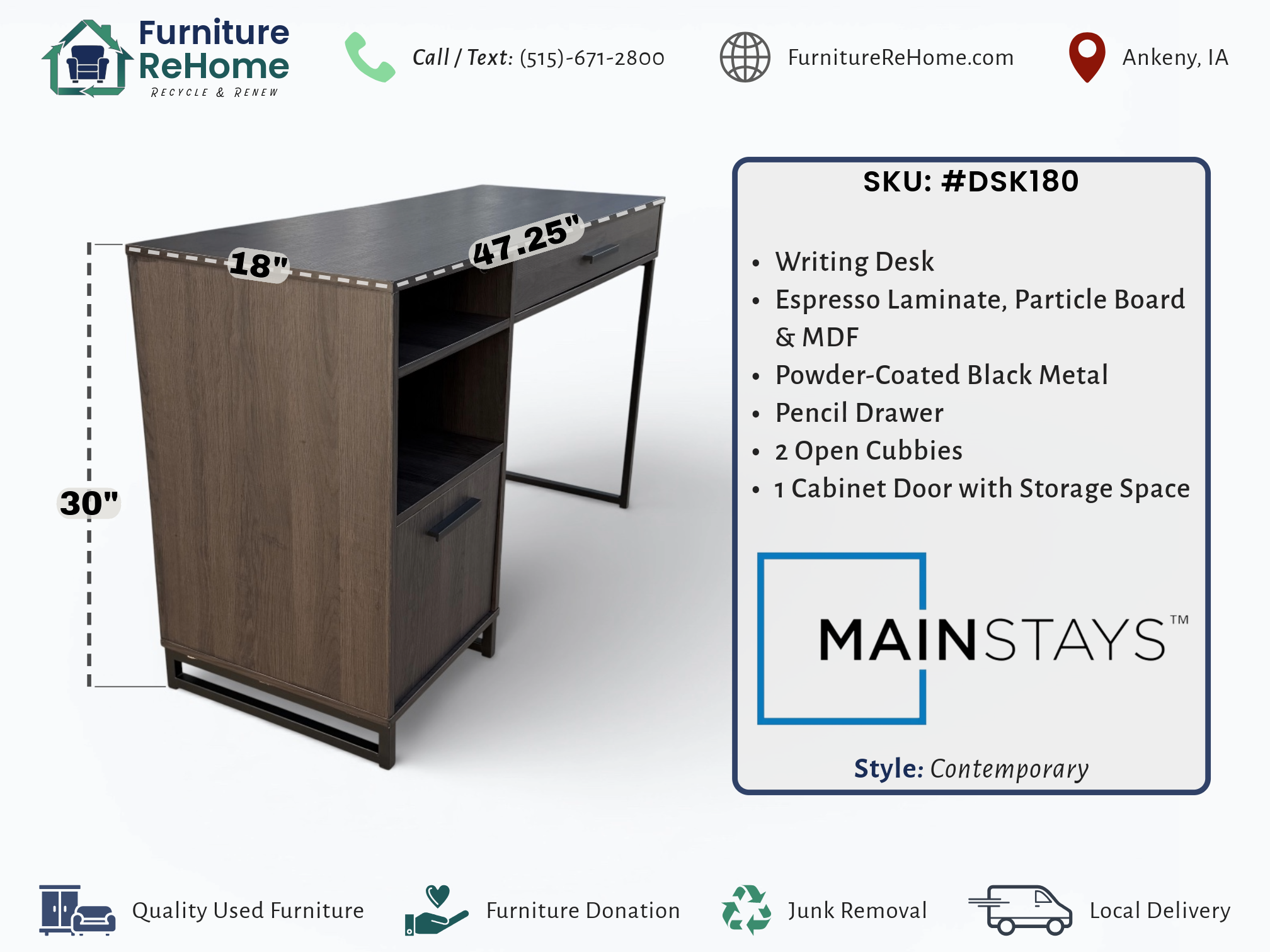 • [Dimensions]: 47.25” Length X 18” Depth X 30” Height
