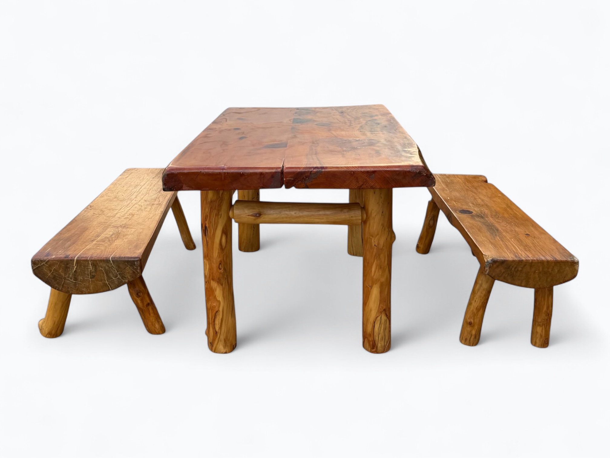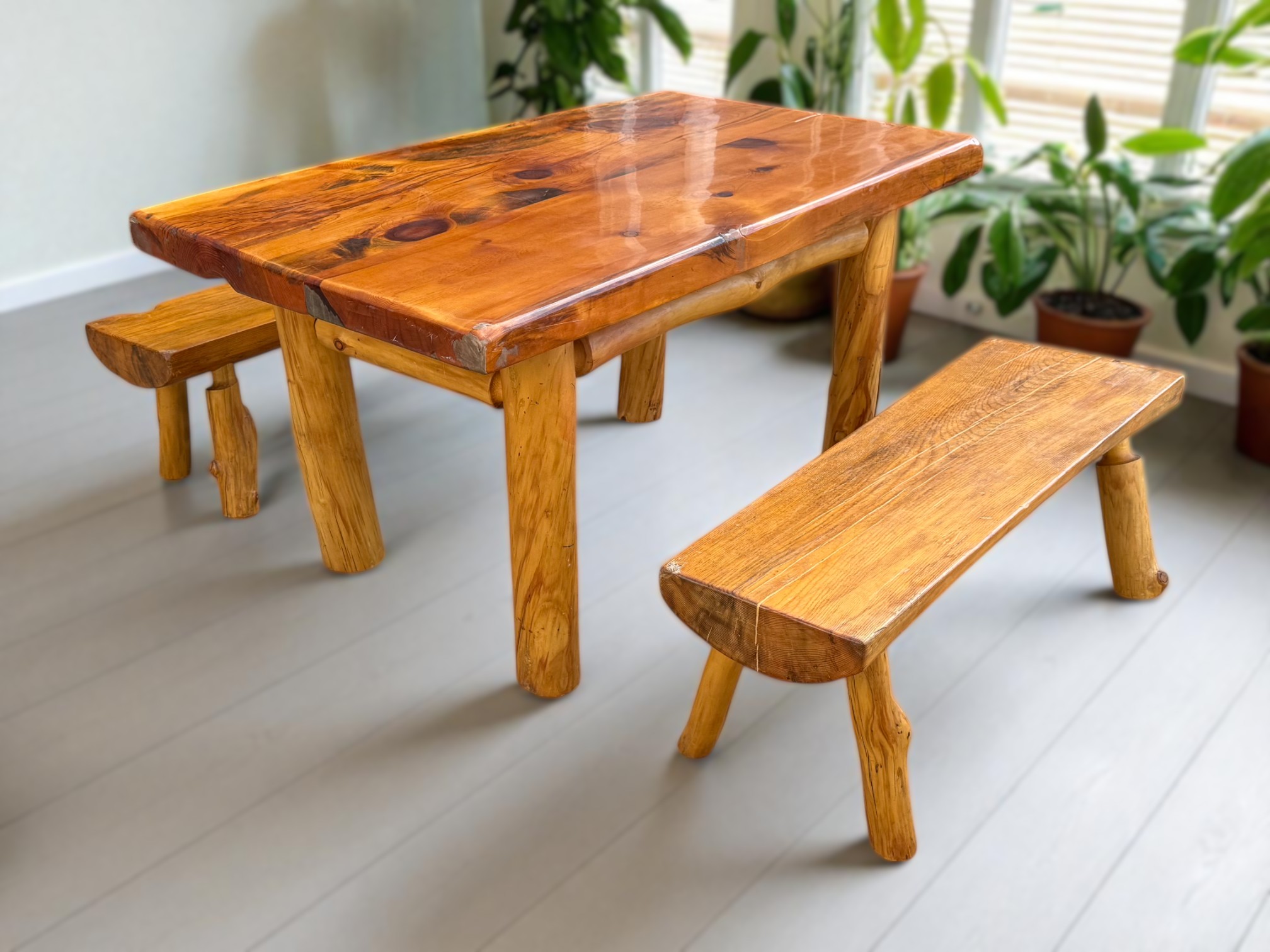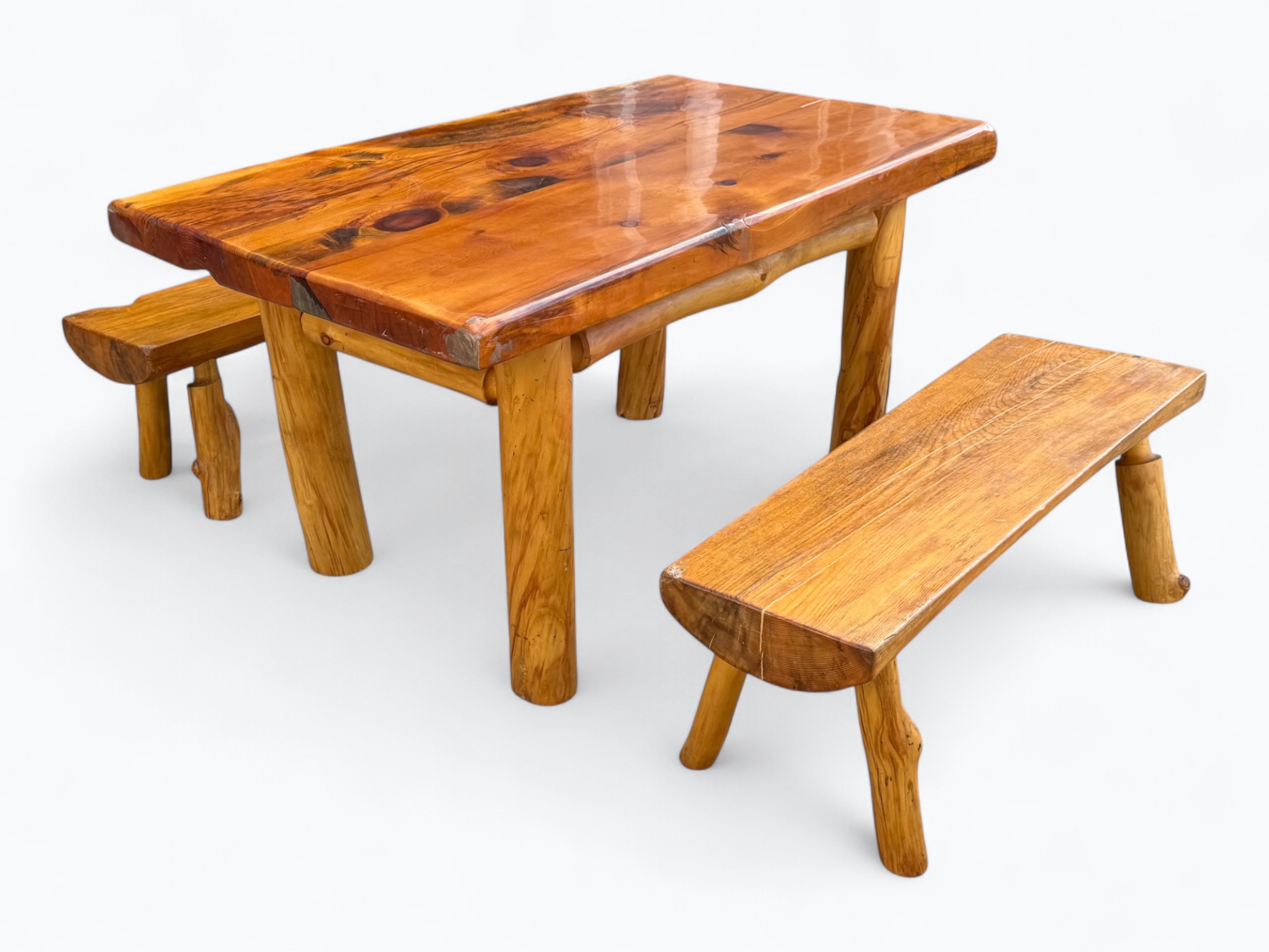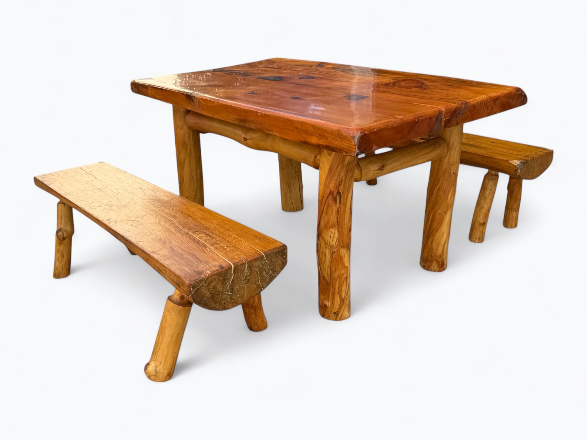 Artisan-Crafted Rustic Cedar Dining Table & 2 Split Log Benches