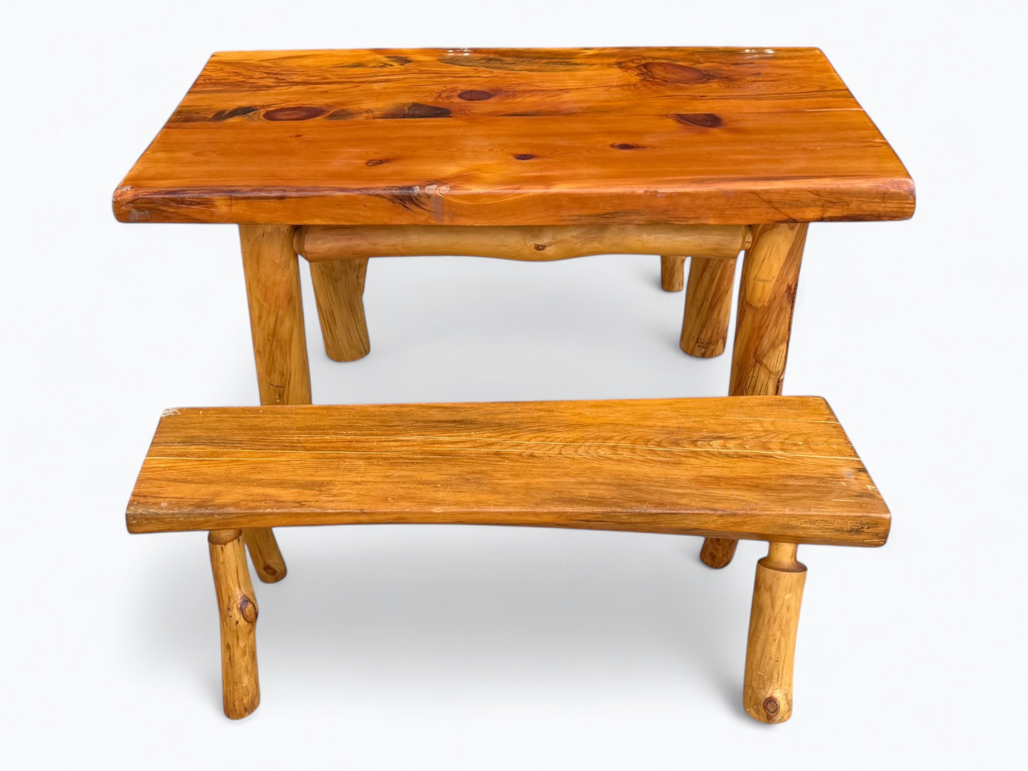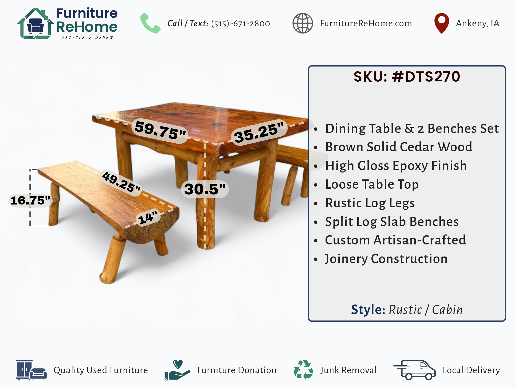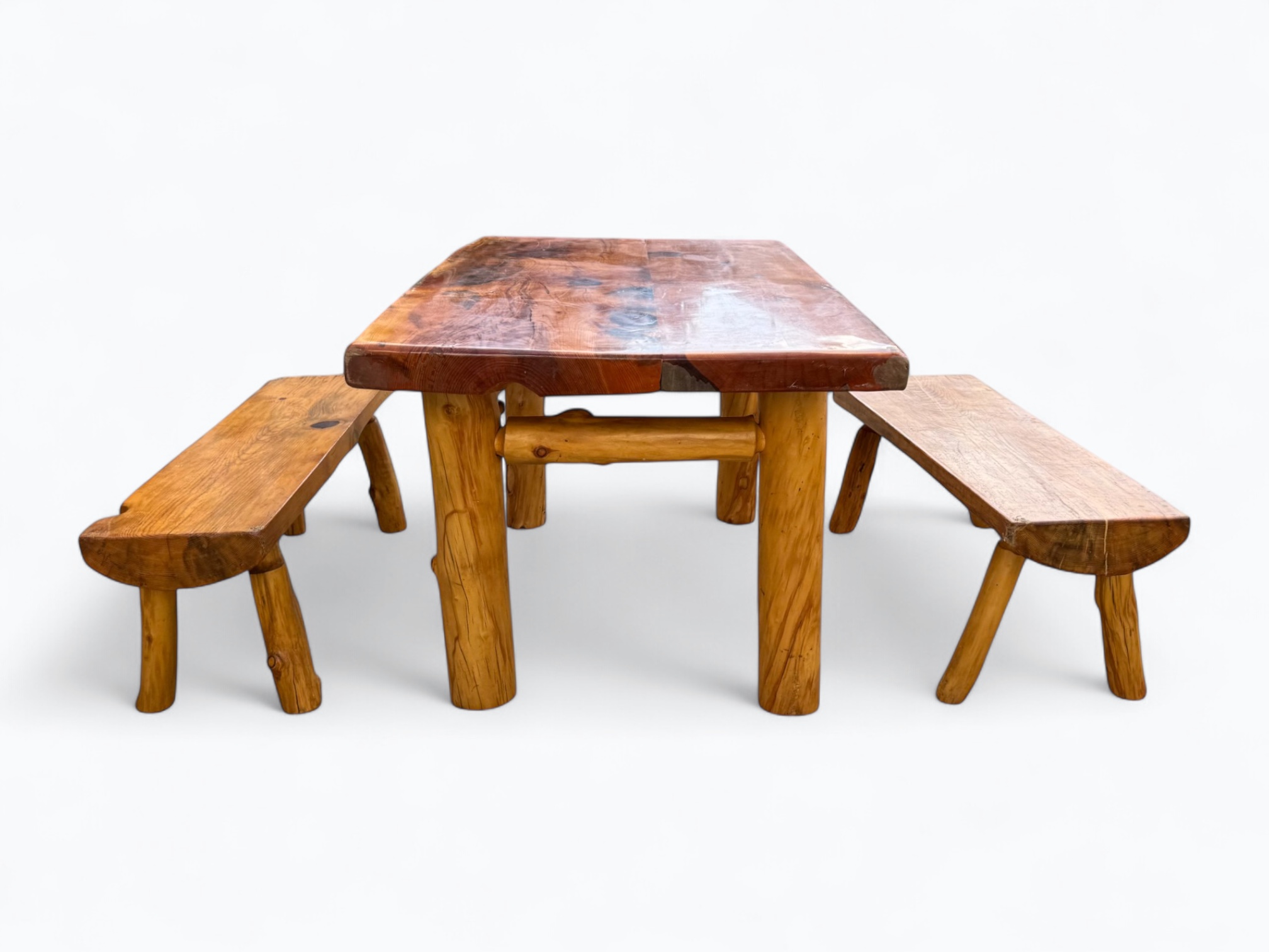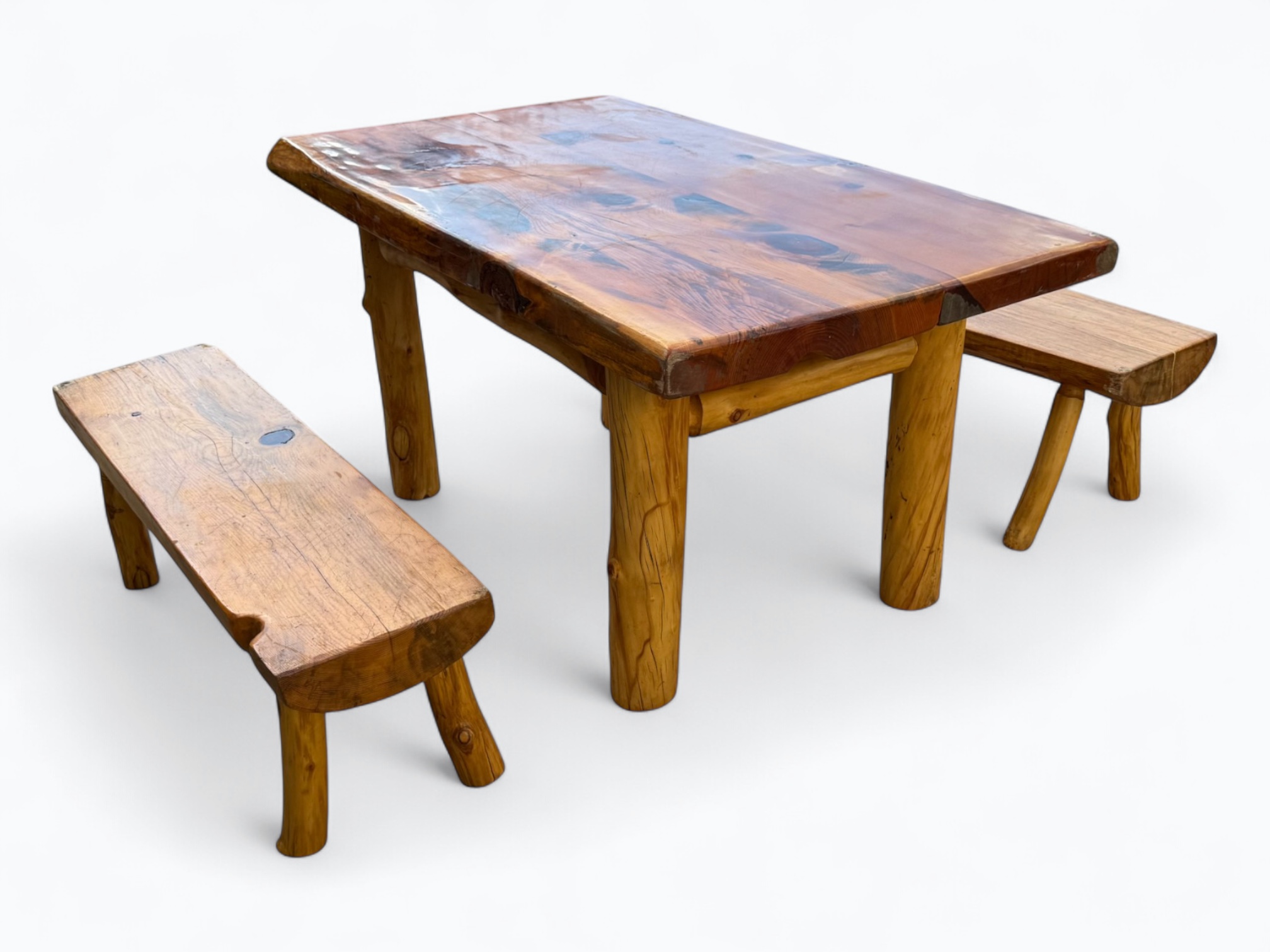 Artisan-Crafted Rustic Cedar Dining Table & 2 Split Log Benches