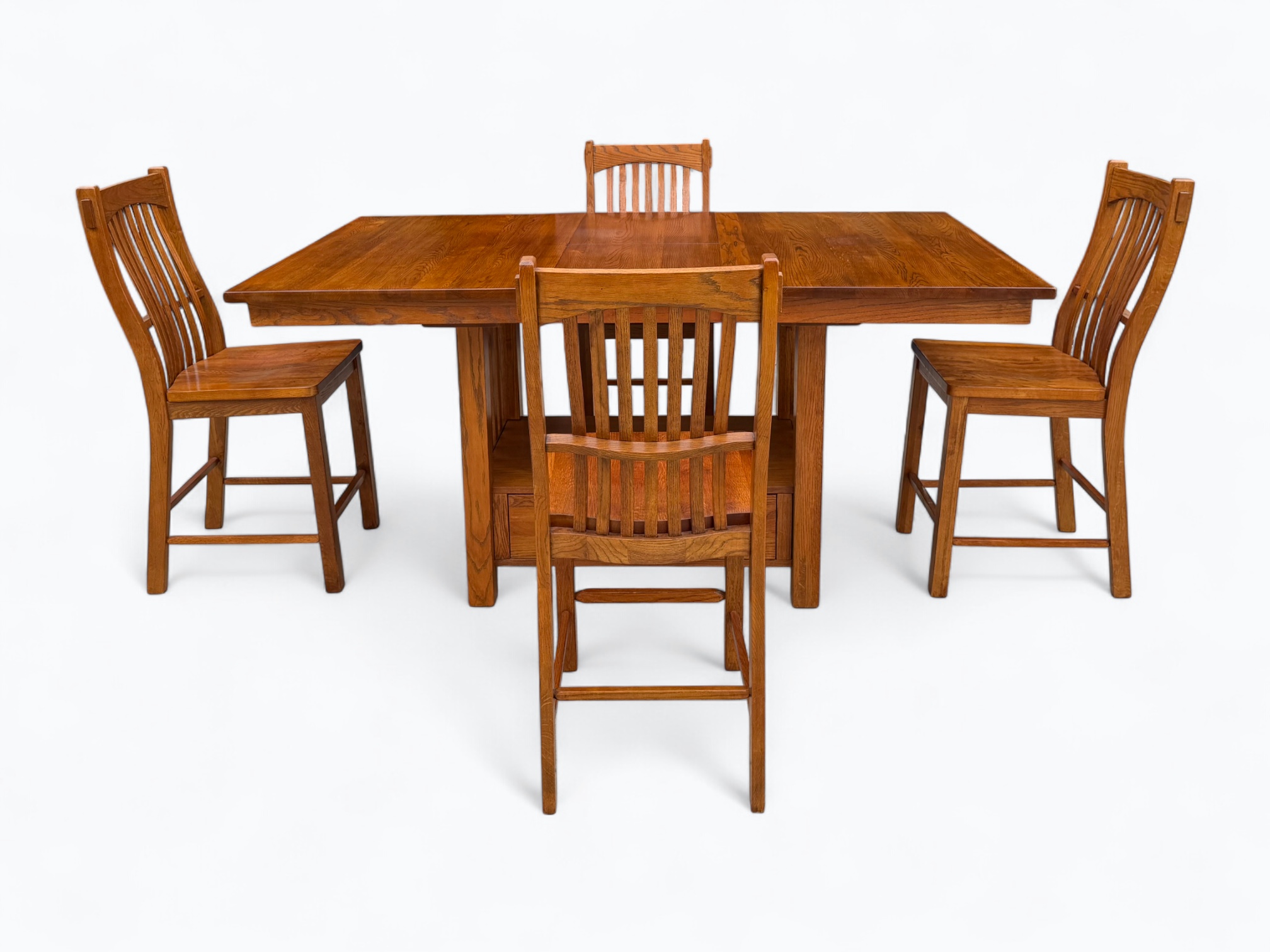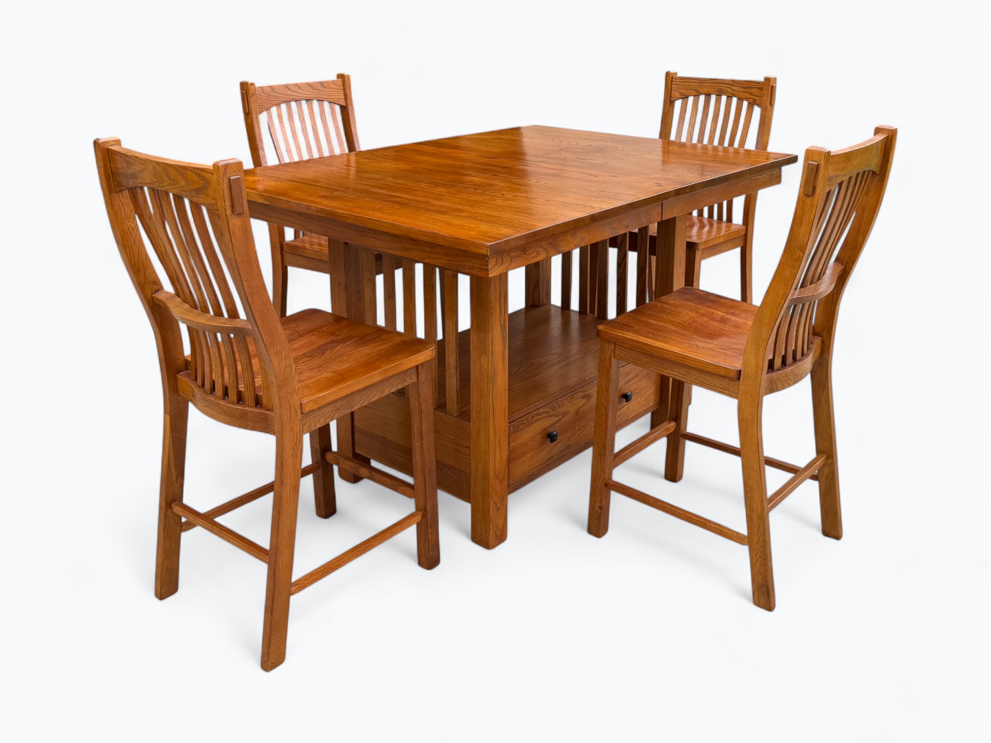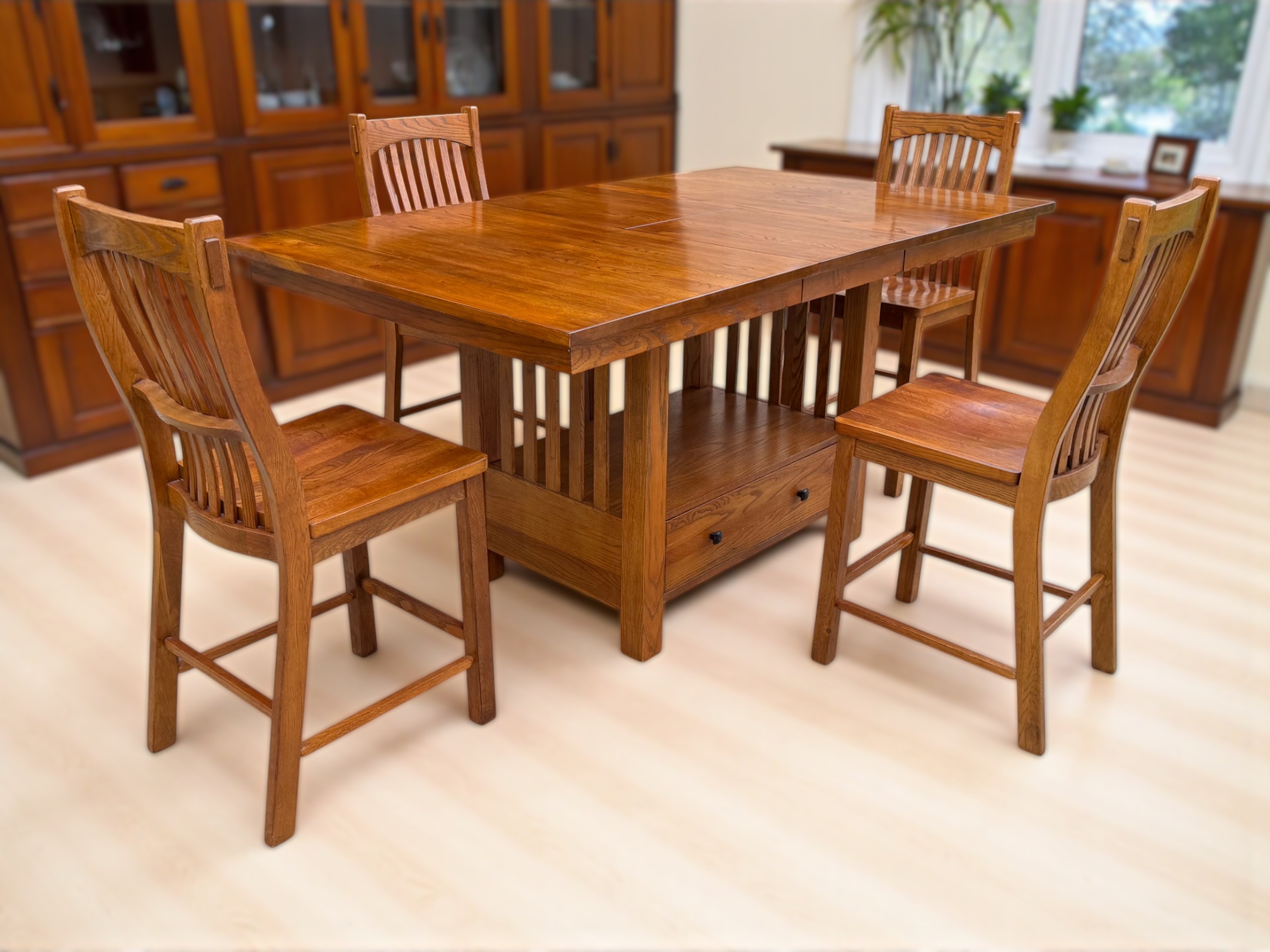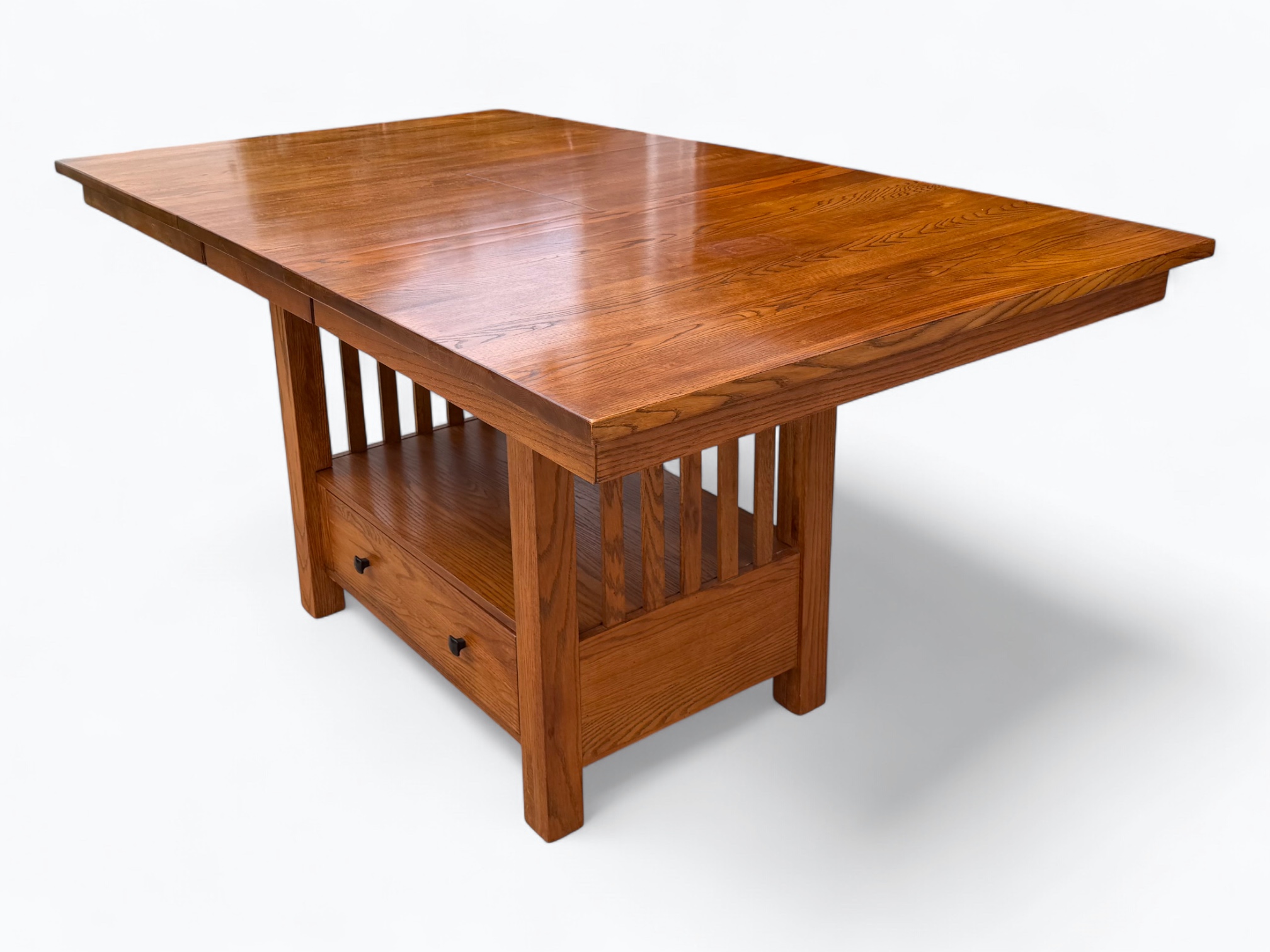 • [Features]: Equalizing metal ball bearing table glides; Self storing leaf with locking mechanisms; True pegged through tenon details; English dovetailed front and back drawer boxes; Table base has a shelf and 1 drawer; Slatted back dining chairs; Solid and heavy construction