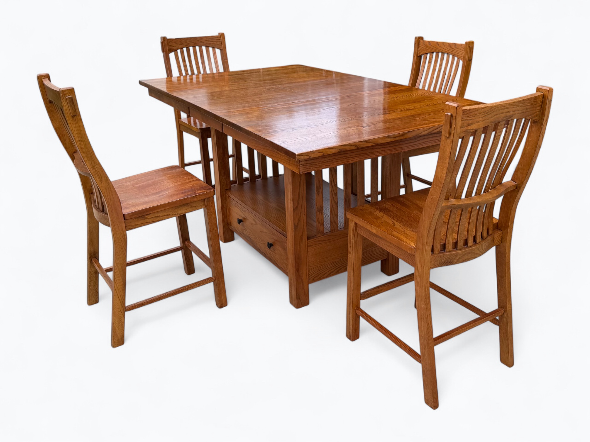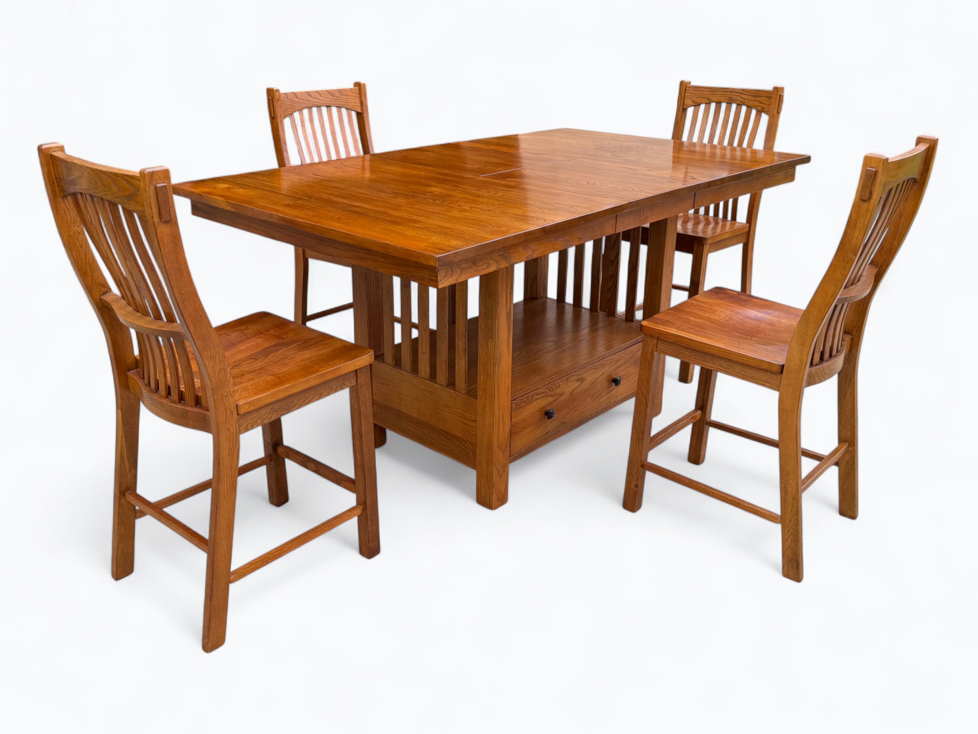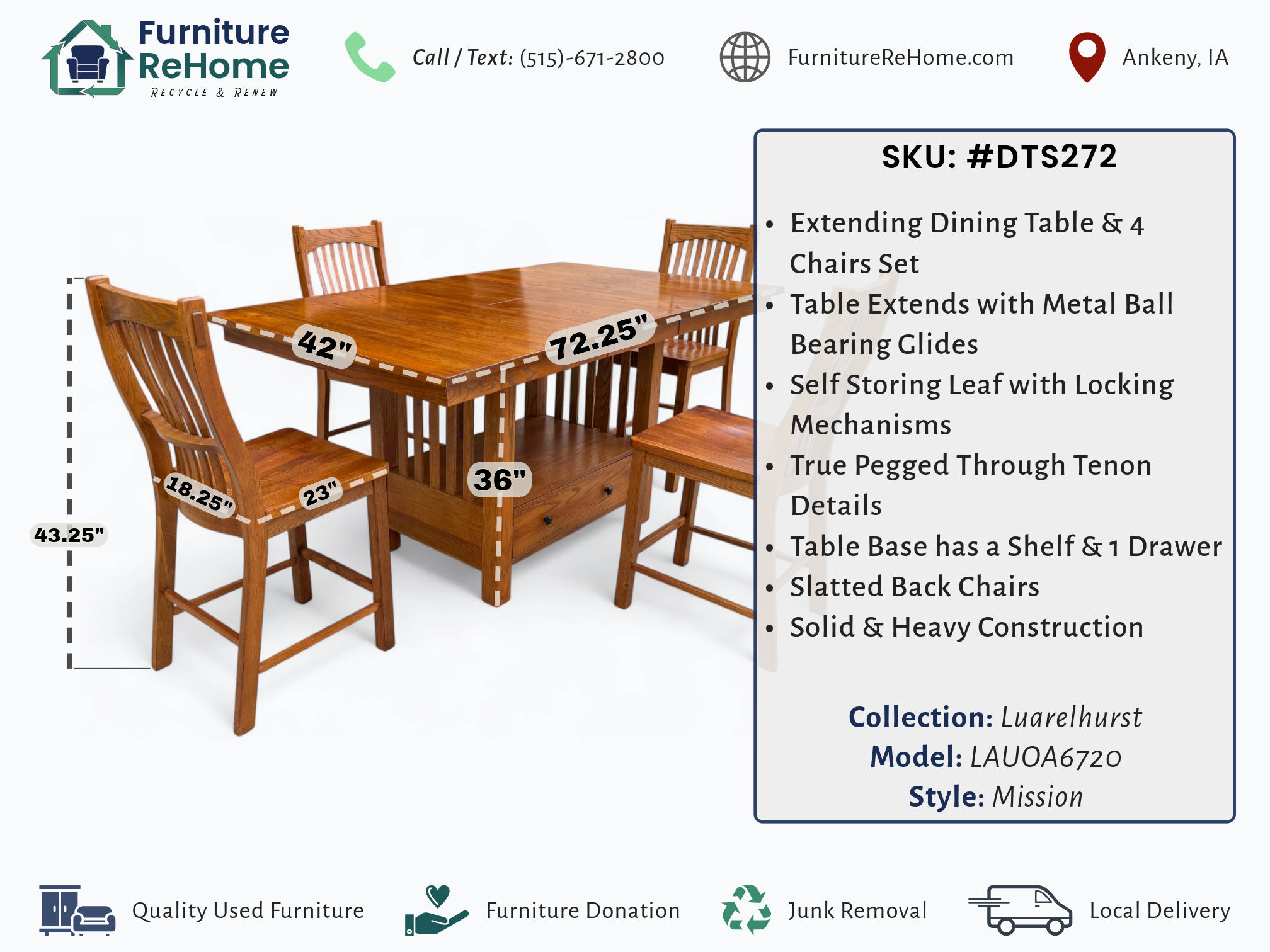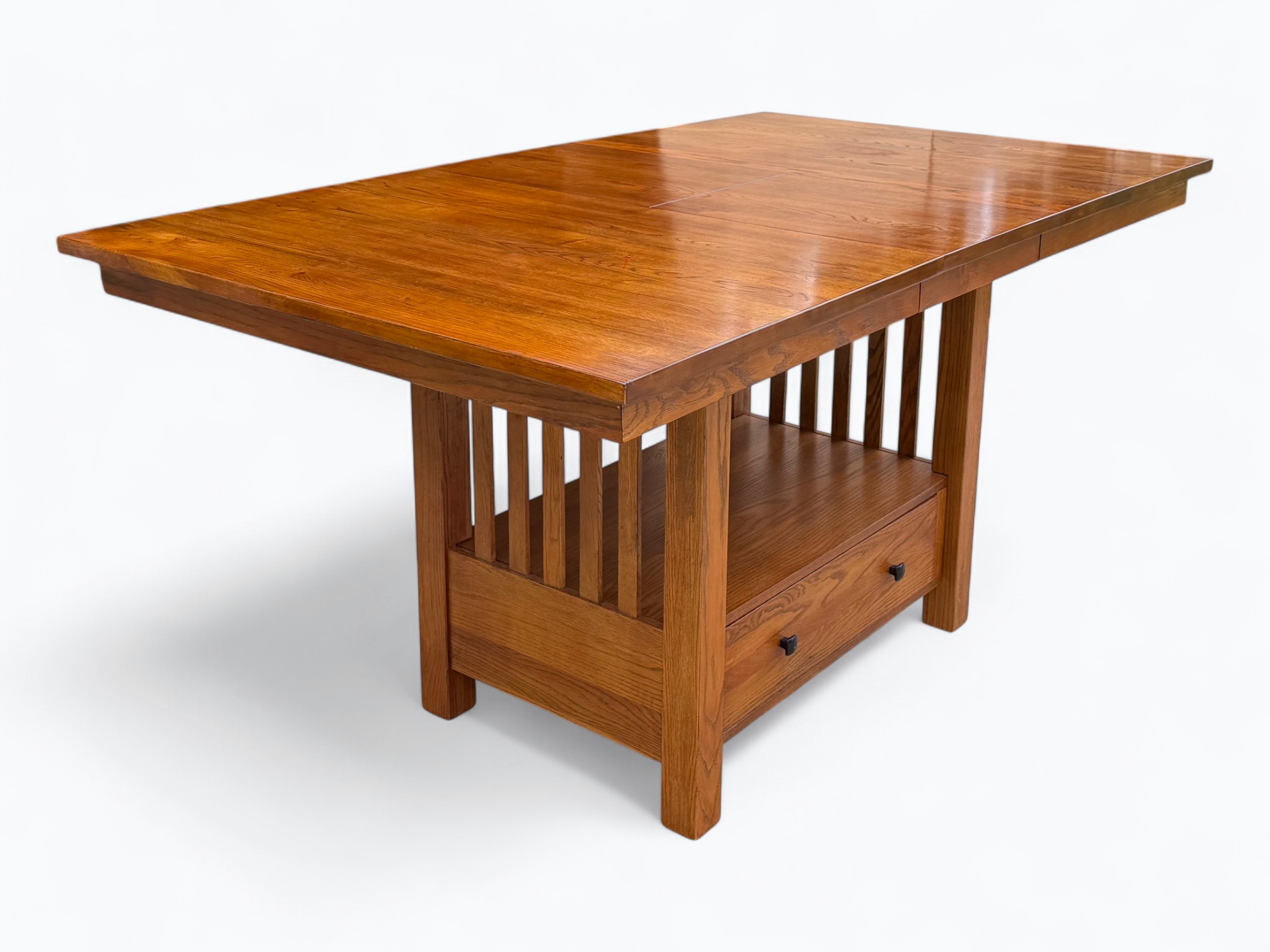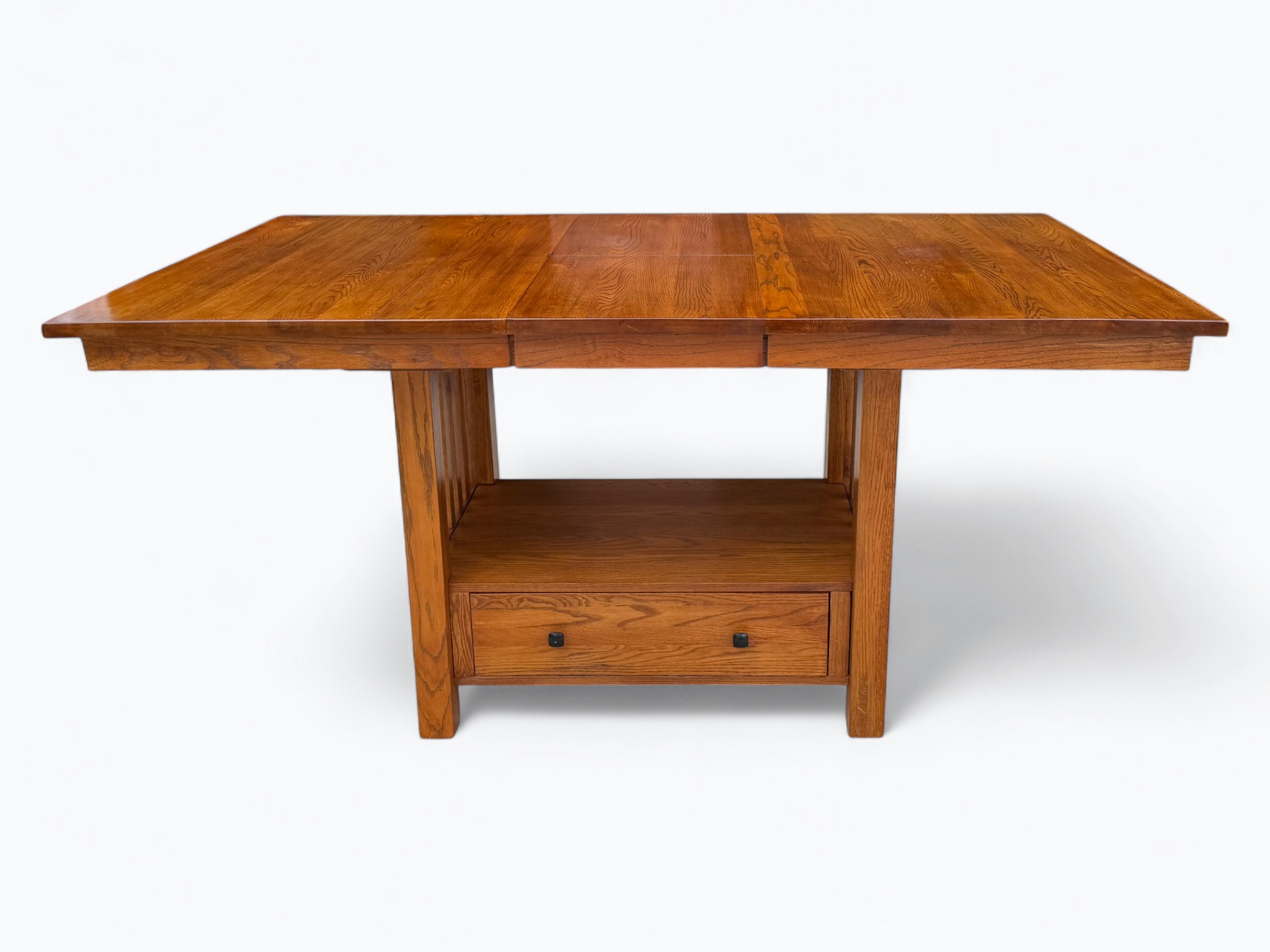• [Features]: Equalizing metal ball bearing table glides; Self storing leaf with locking mechanisms; True pegged through tenon details; English dovetailed front and back drawer boxes; Table base has a shelf and 1 drawer; Slatted back dining chairs; Solid and heavy construction