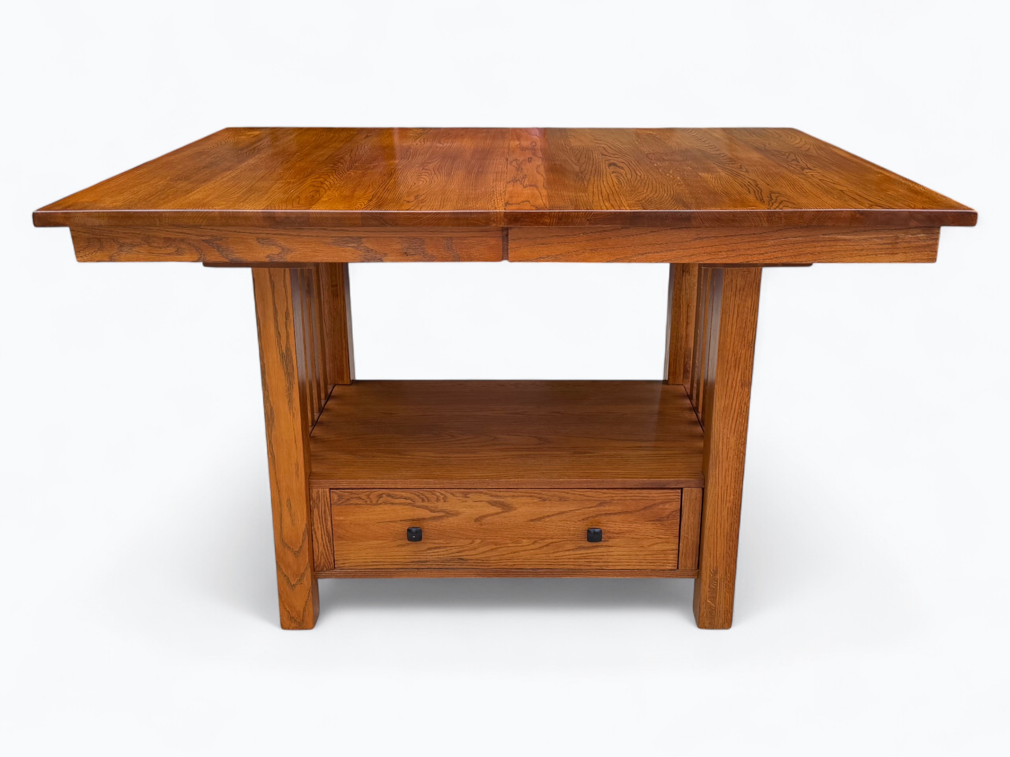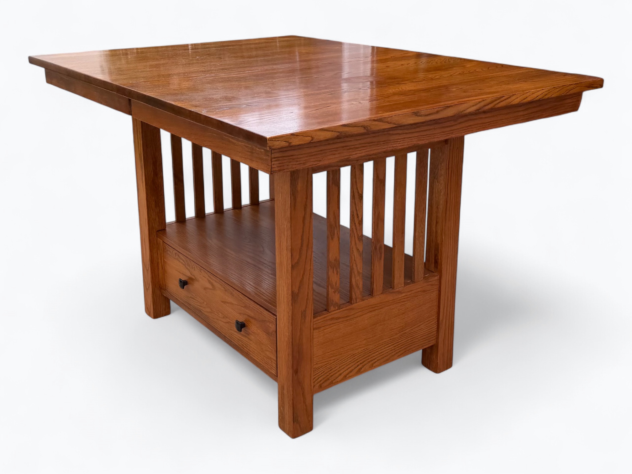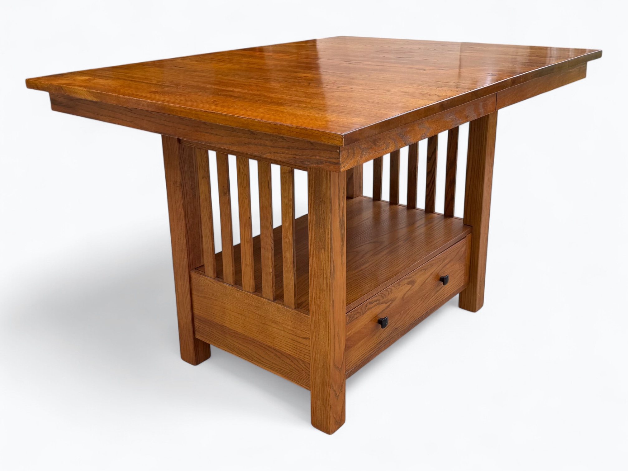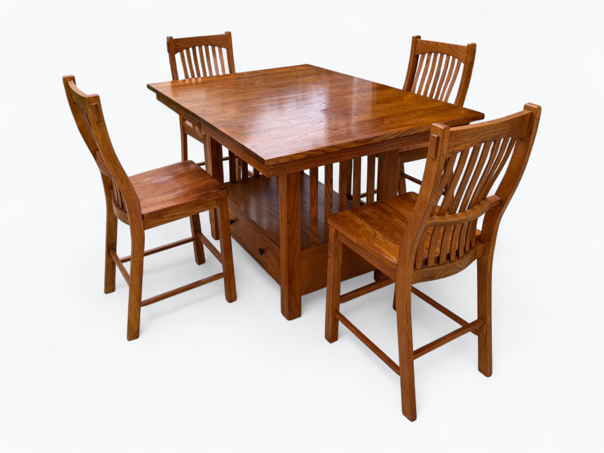 • [Features]: Equalizing metal ball bearing table glides; Self storing leaf with locking mechanisms; True pegged through tenon details; English dovetailed front and back drawer boxes; Table base has a shelf and 1 drawer; Slatted back dining chairs; Solid and heavy construction