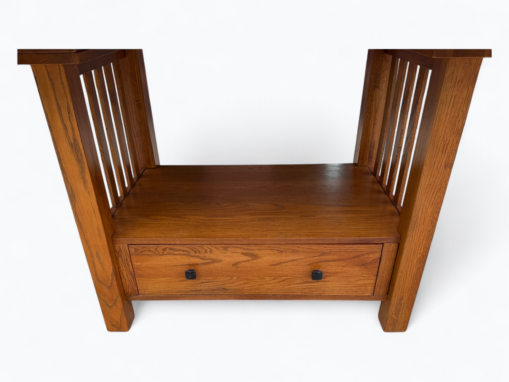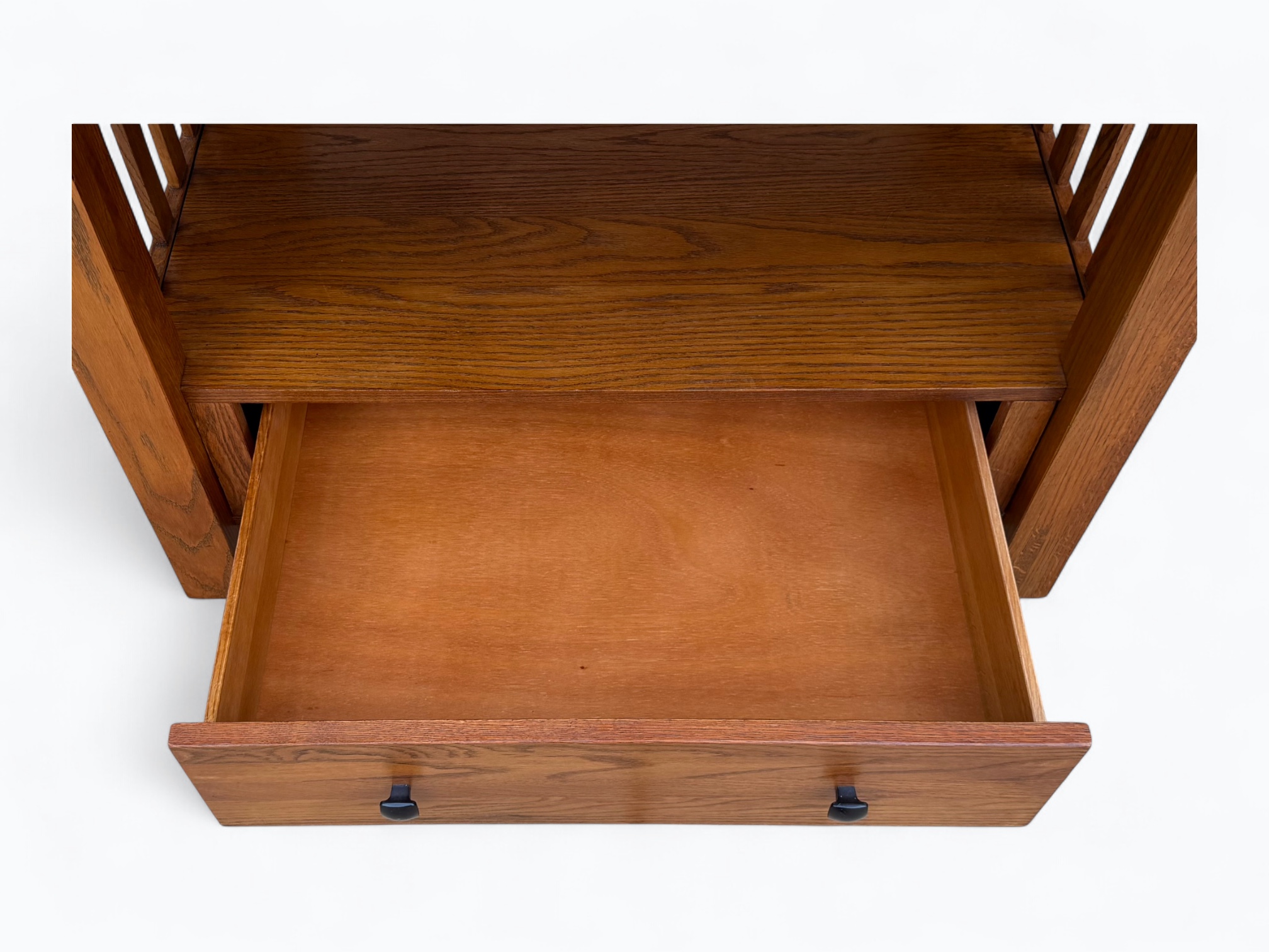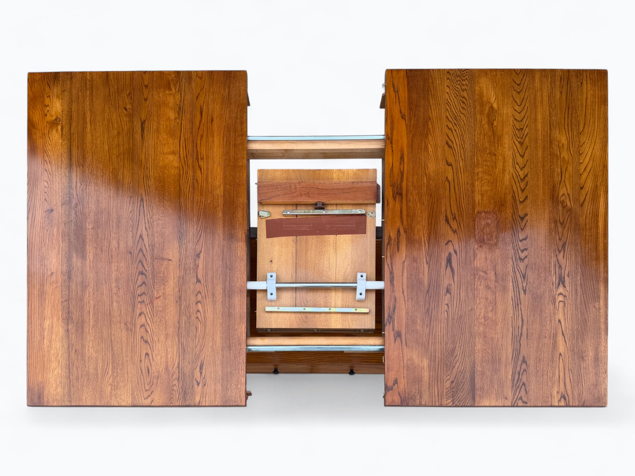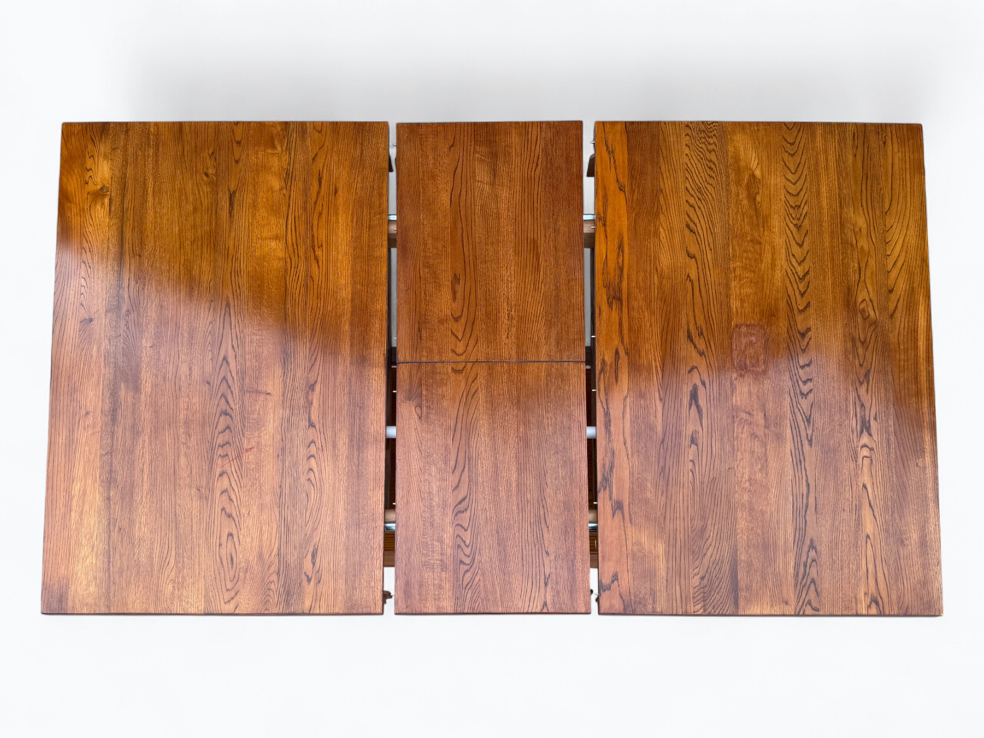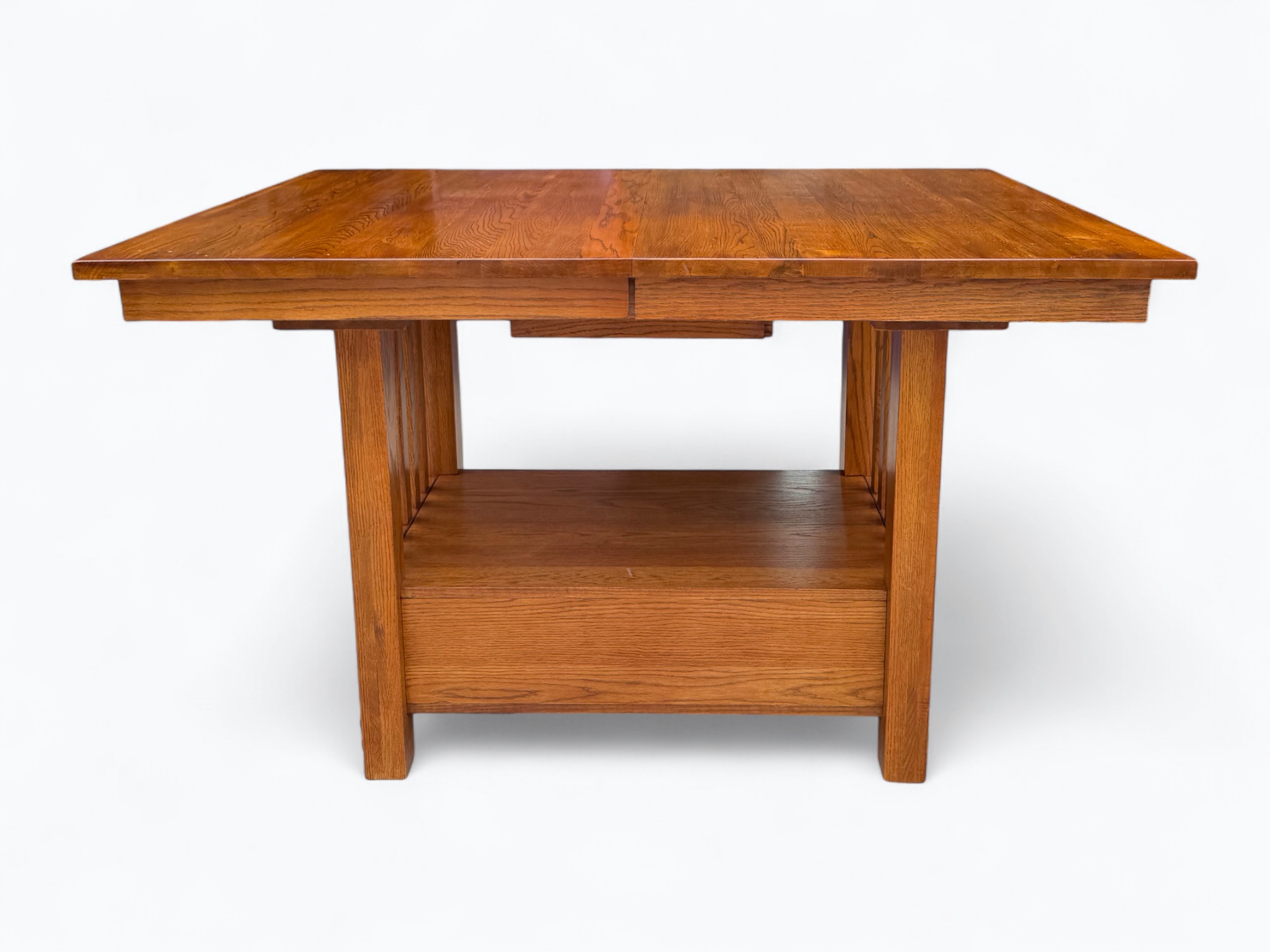 • [Features]: Equalizing metal ball bearing table glides; Self storing leaf with locking mechanisms; True pegged through tenon details; English dovetailed front and back drawer boxes; Table base has a shelf and 1 drawer; Slatted back dining chairs; Solid and heavy construction