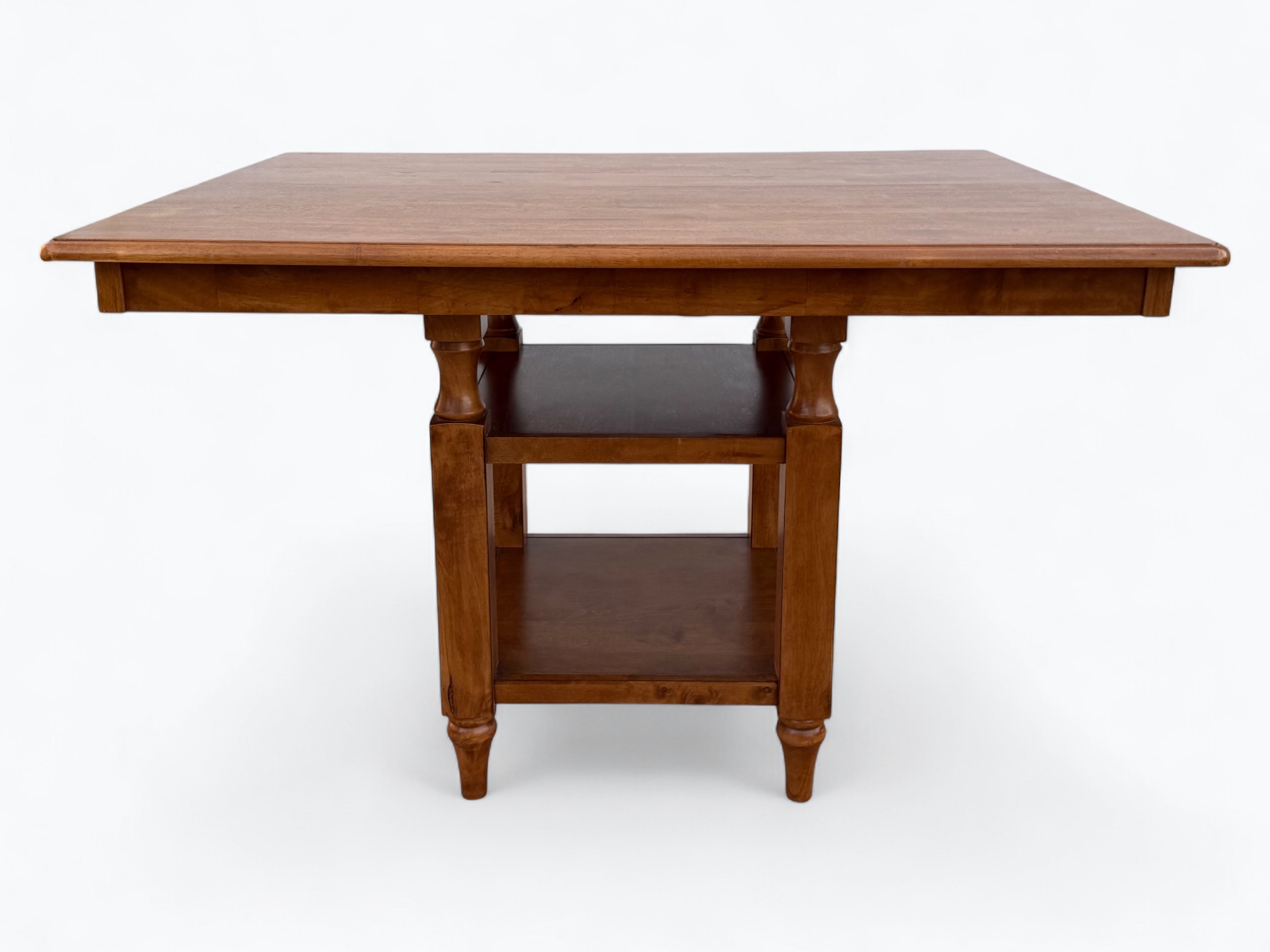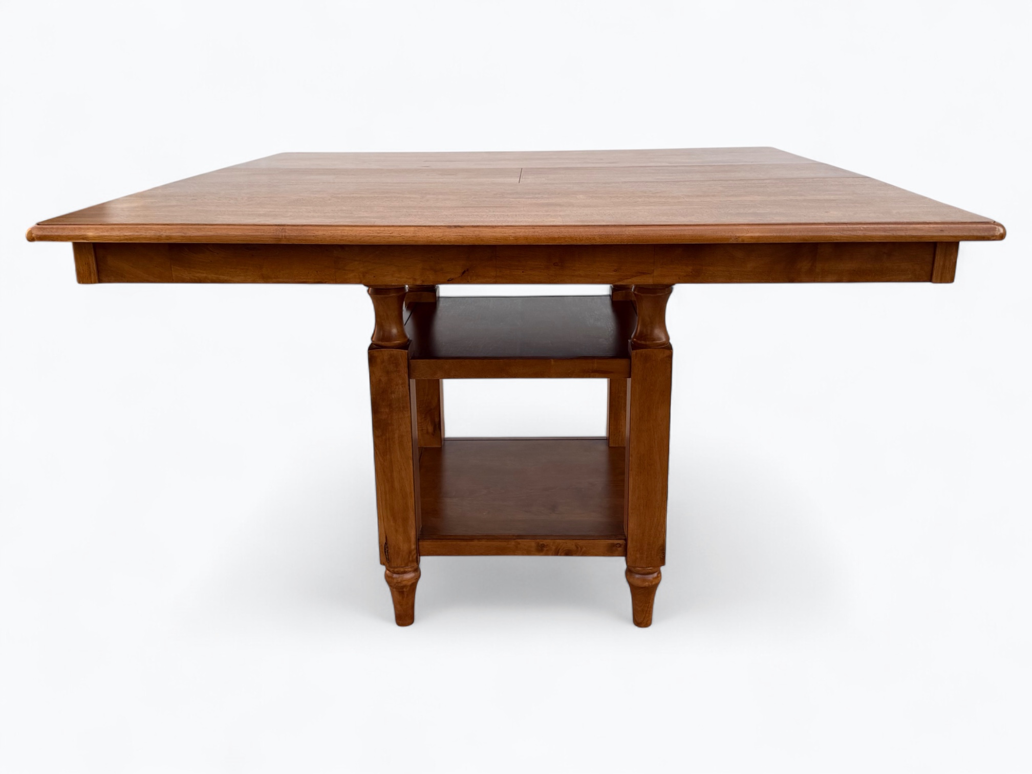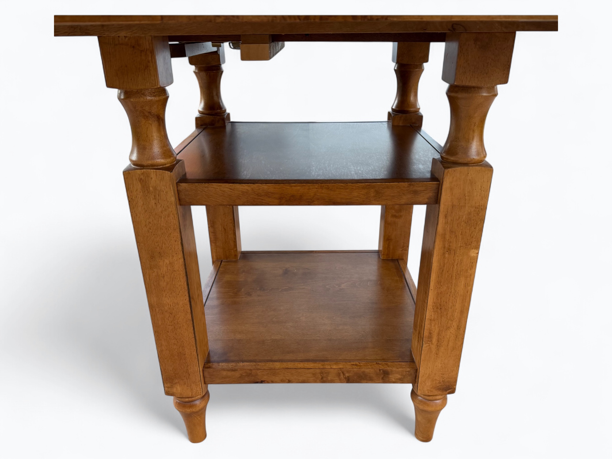 • [Features]: Storage base with 2-tier shelves; Table has beveled edges and turned legs; Self-storing butterfly table leaf with leaf locks; Slat-back chairs with footrests