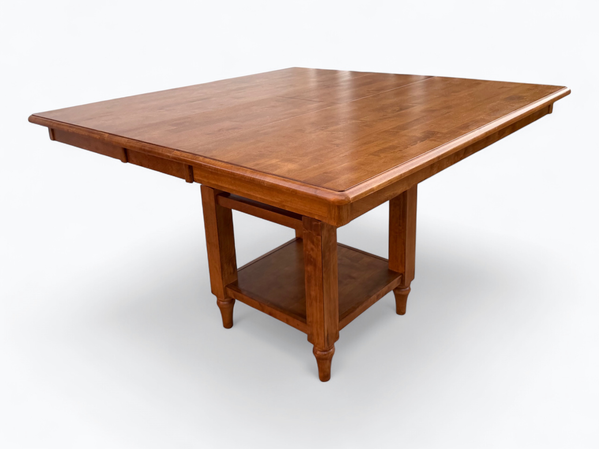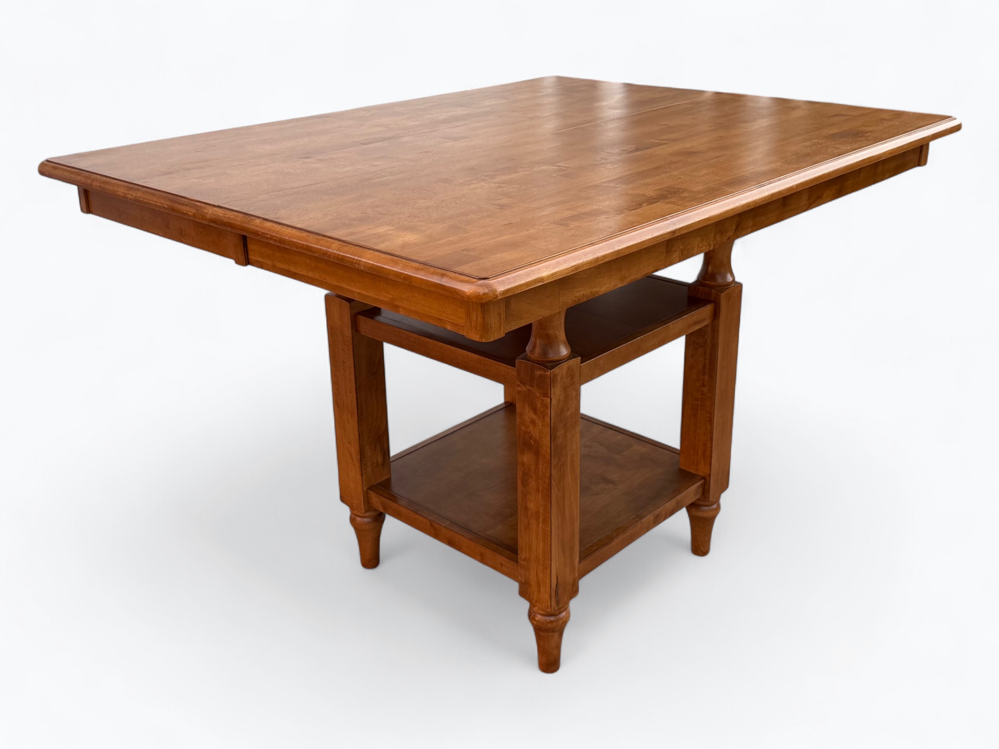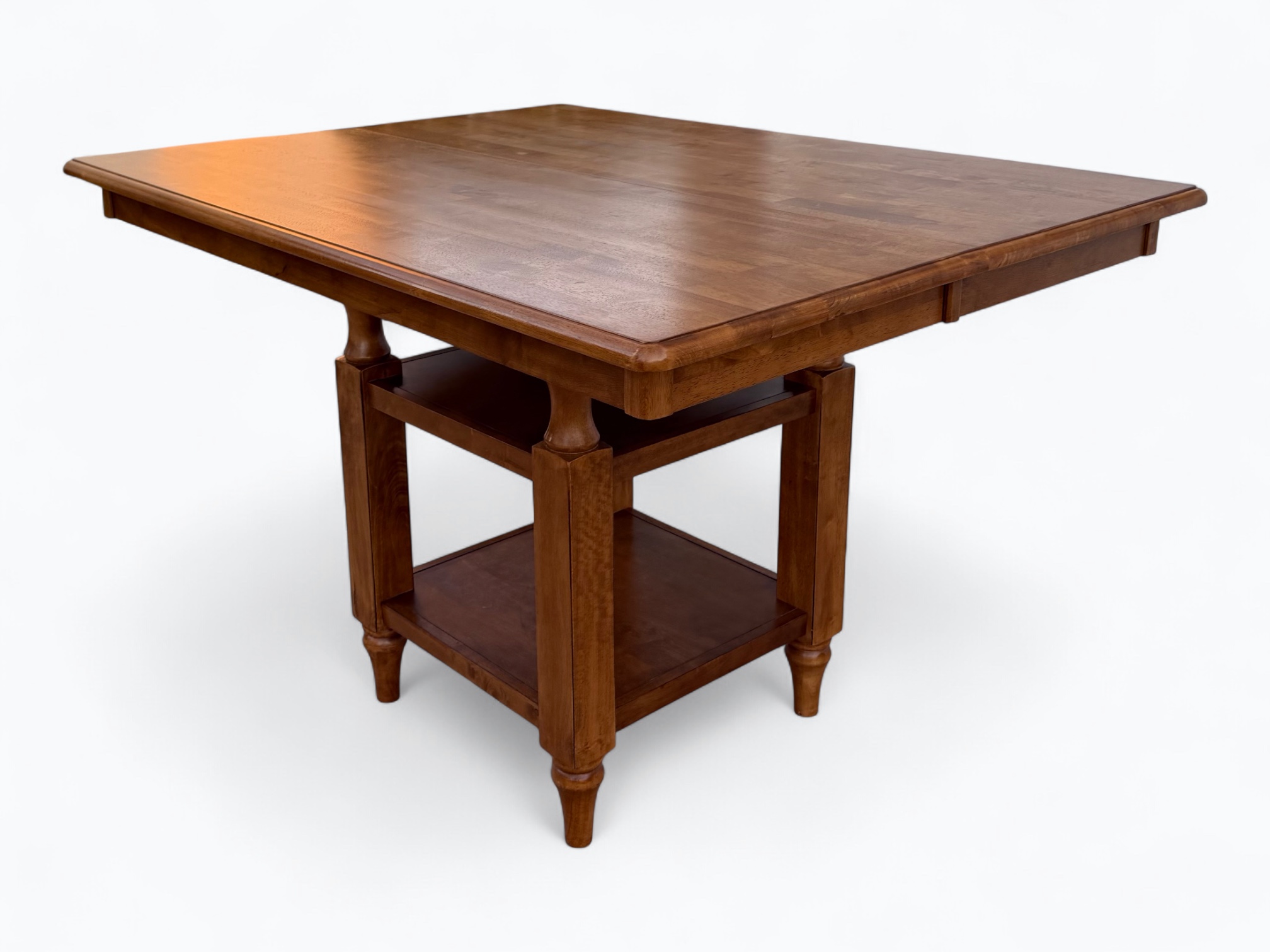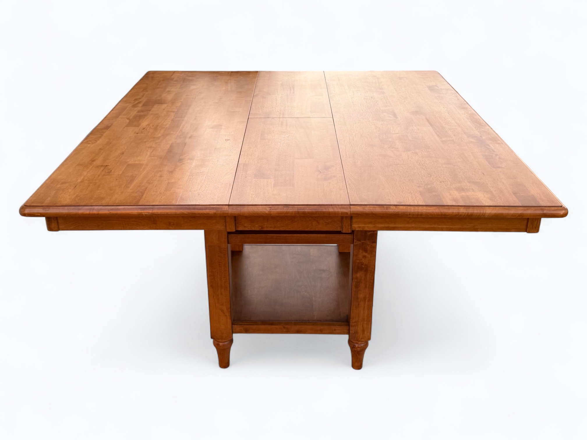 • [Features]: Storage base with 2-tier shelves; Table has beveled edges and turned legs; Self-storing butterfly table leaf with leaf locks; Slat-back chairs with footrests