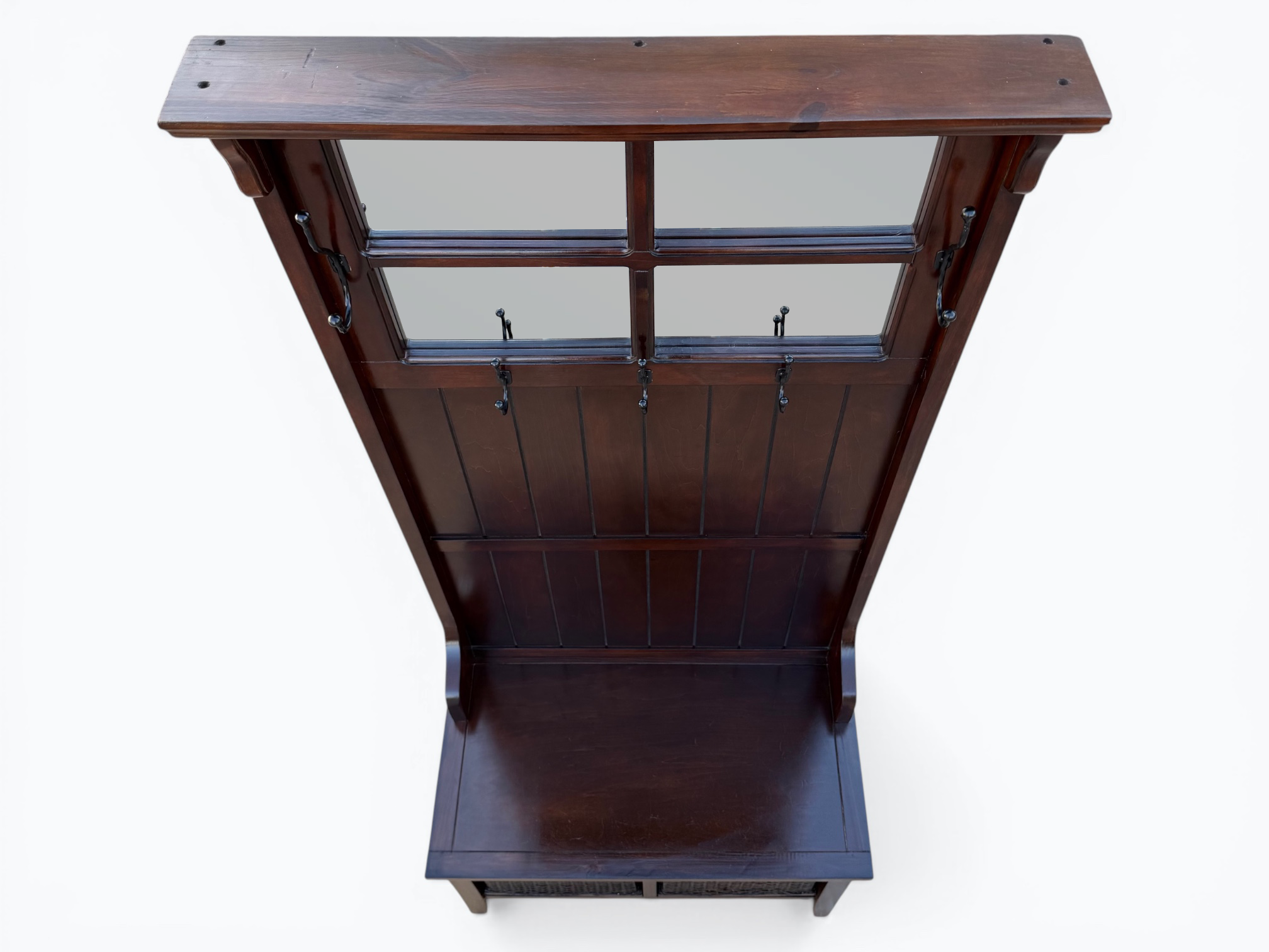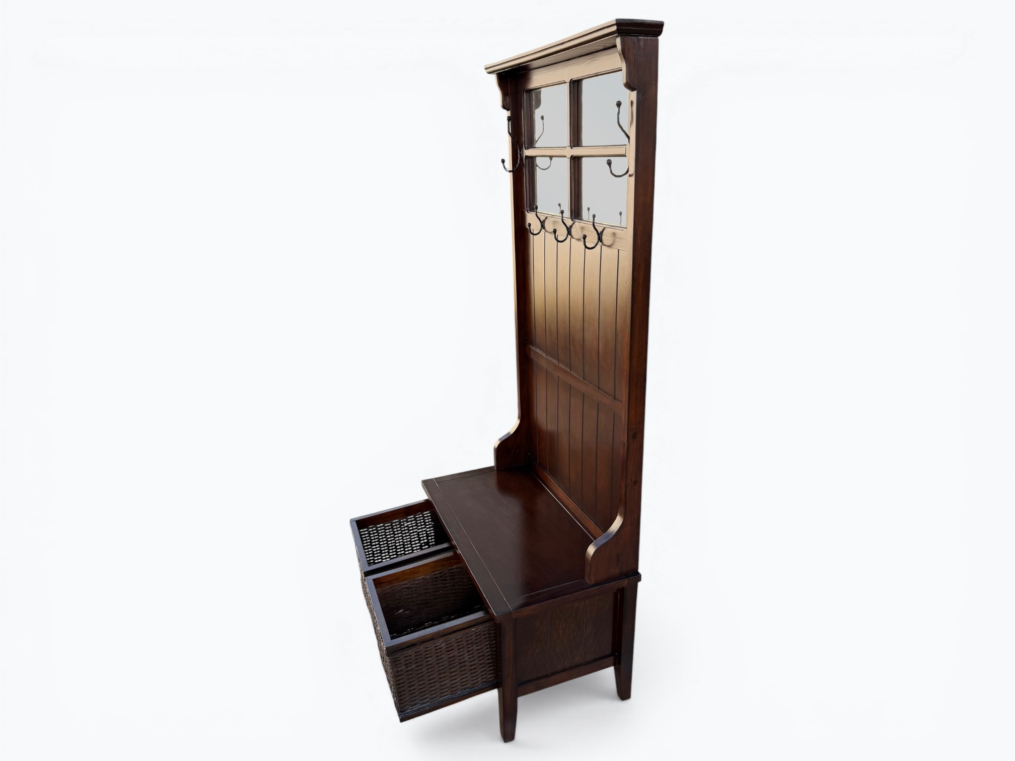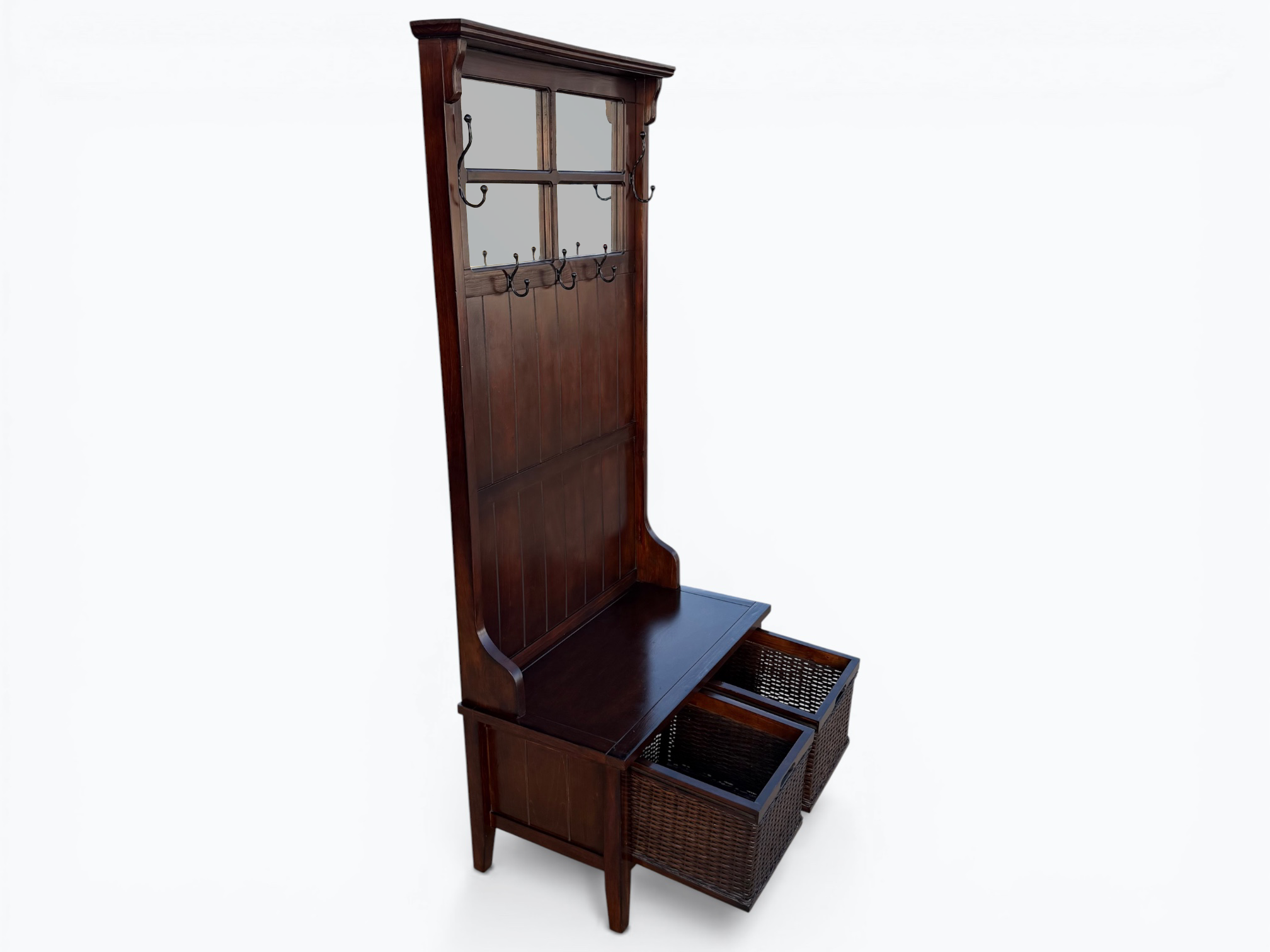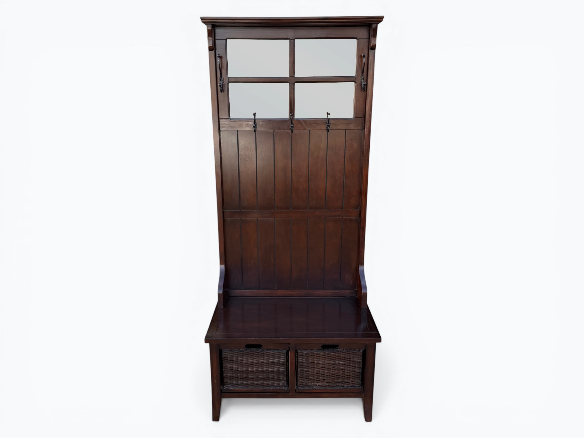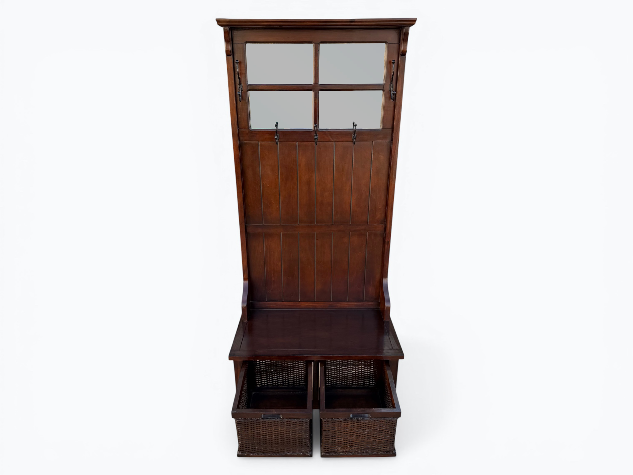 [Features]: 2 sliding wood-framed wicker storage baskets; 5 double coat hooks; 4-panel mirror; Crown-style top cap; Bench seat