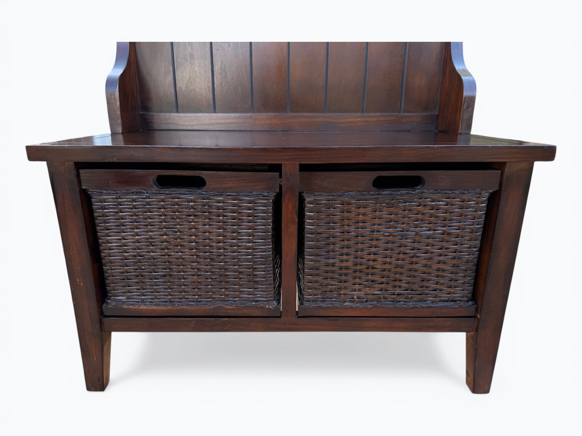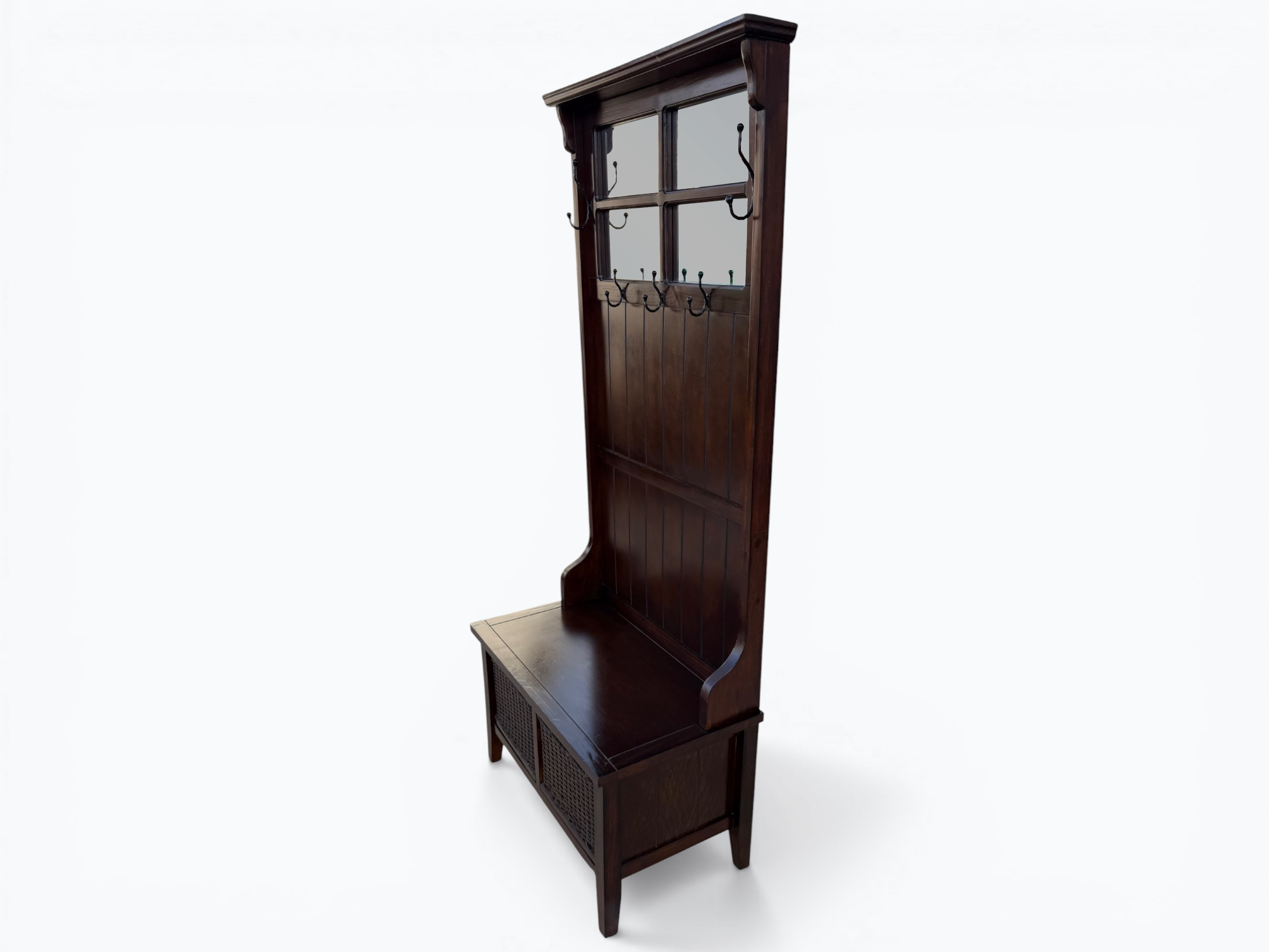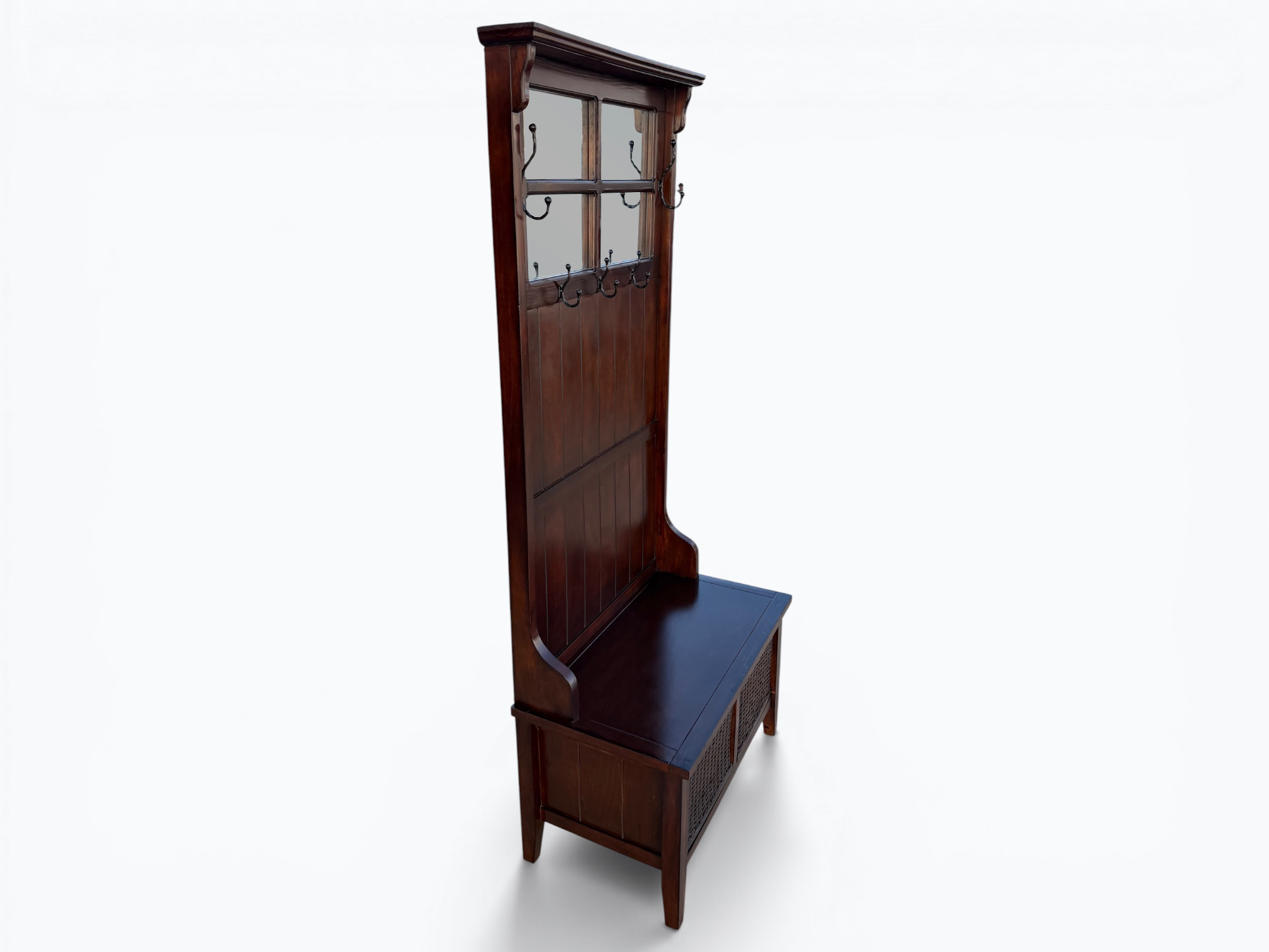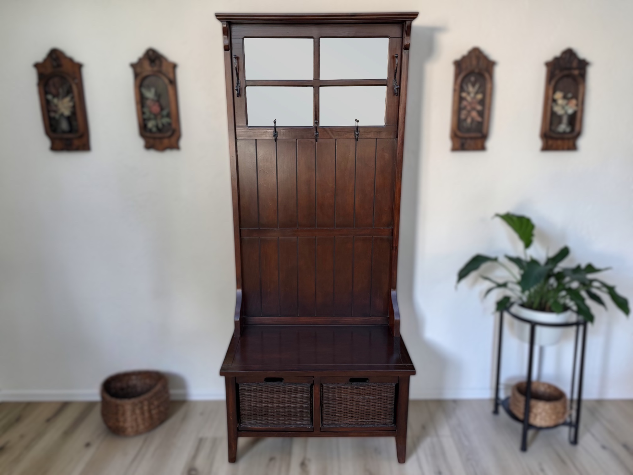 [Features]: 2 sliding wood-framed wicker storage baskets; 5 double coat hooks; 4-panel mirror; Crown-style top cap; Bench seat