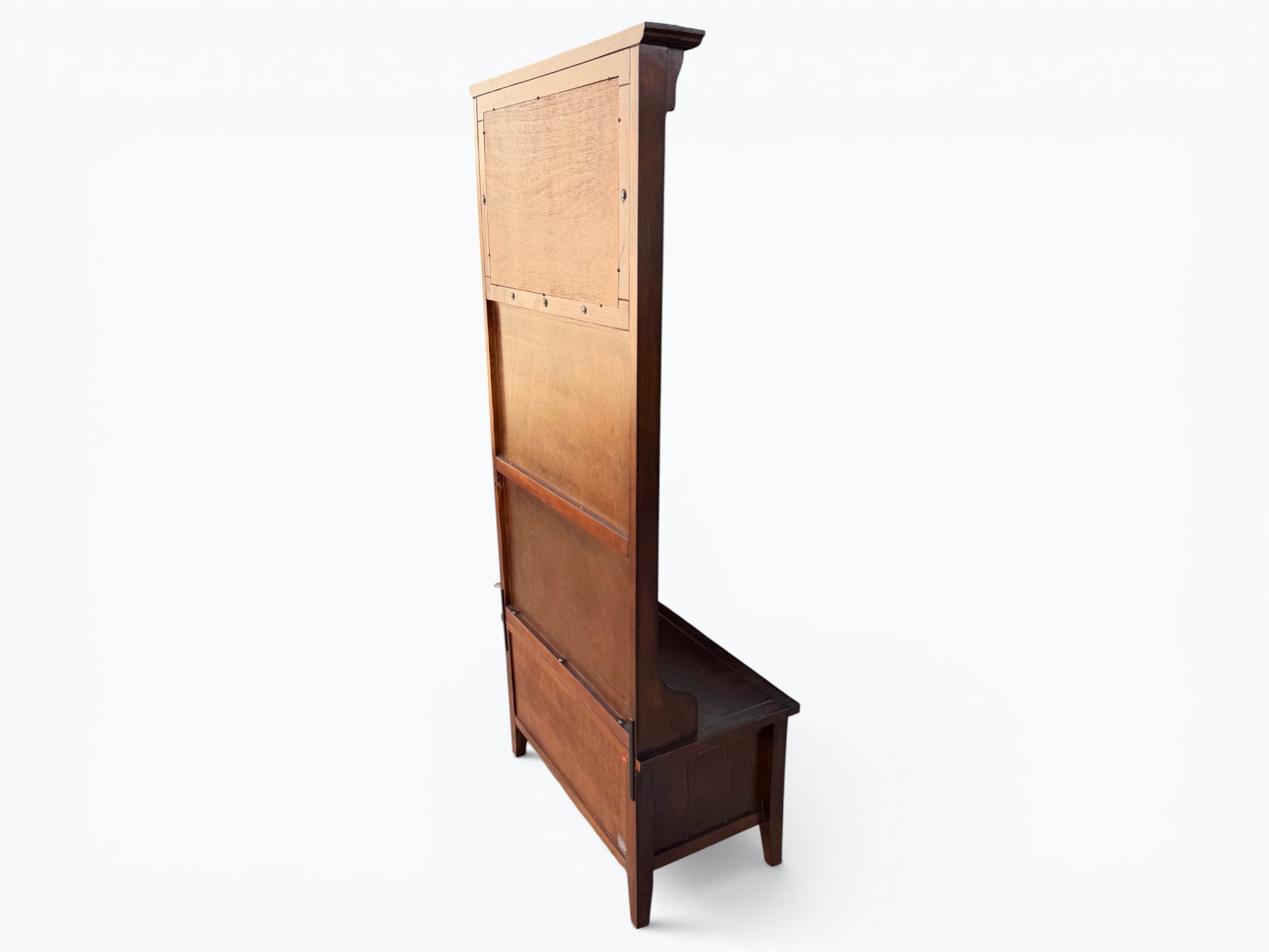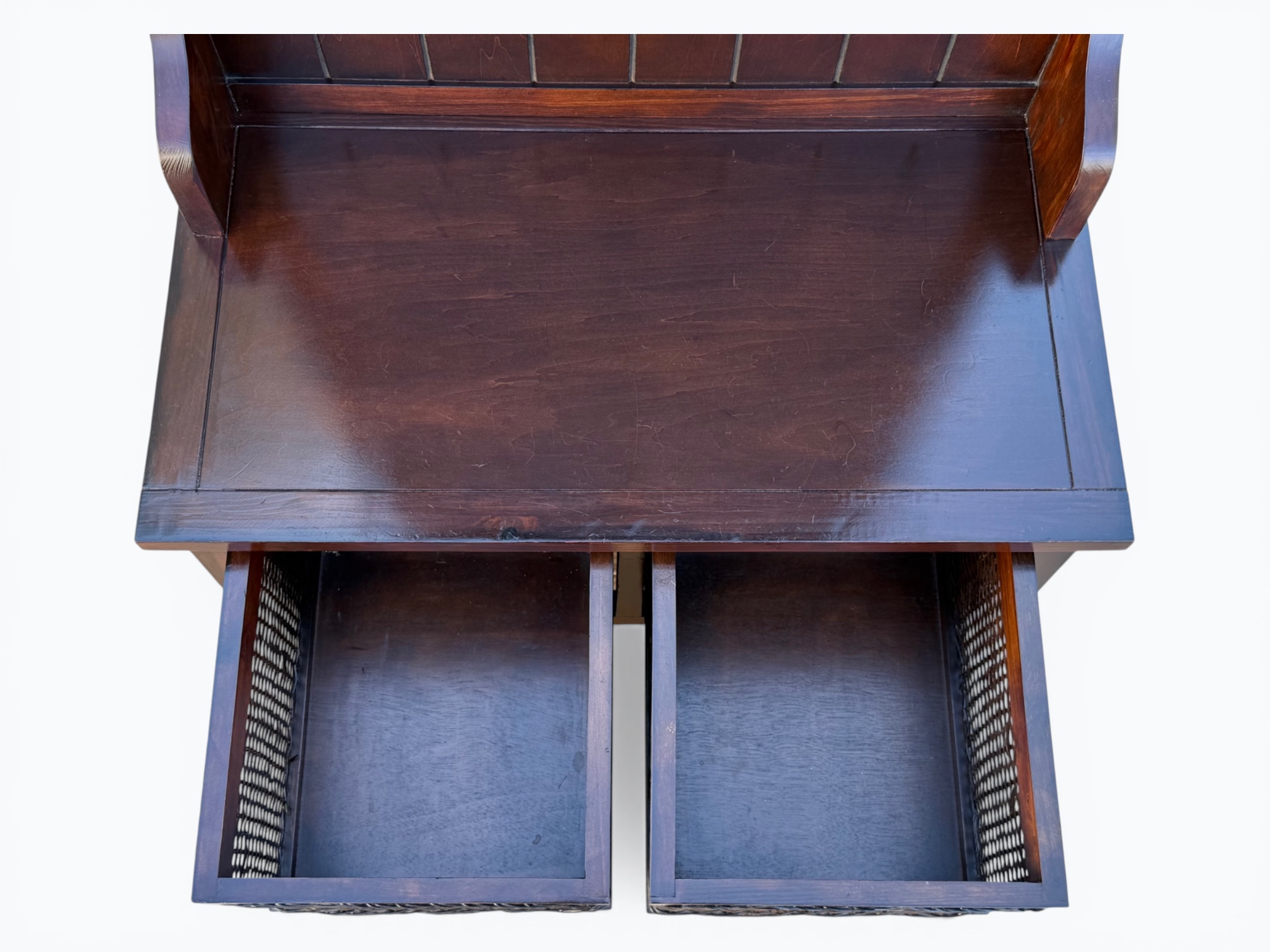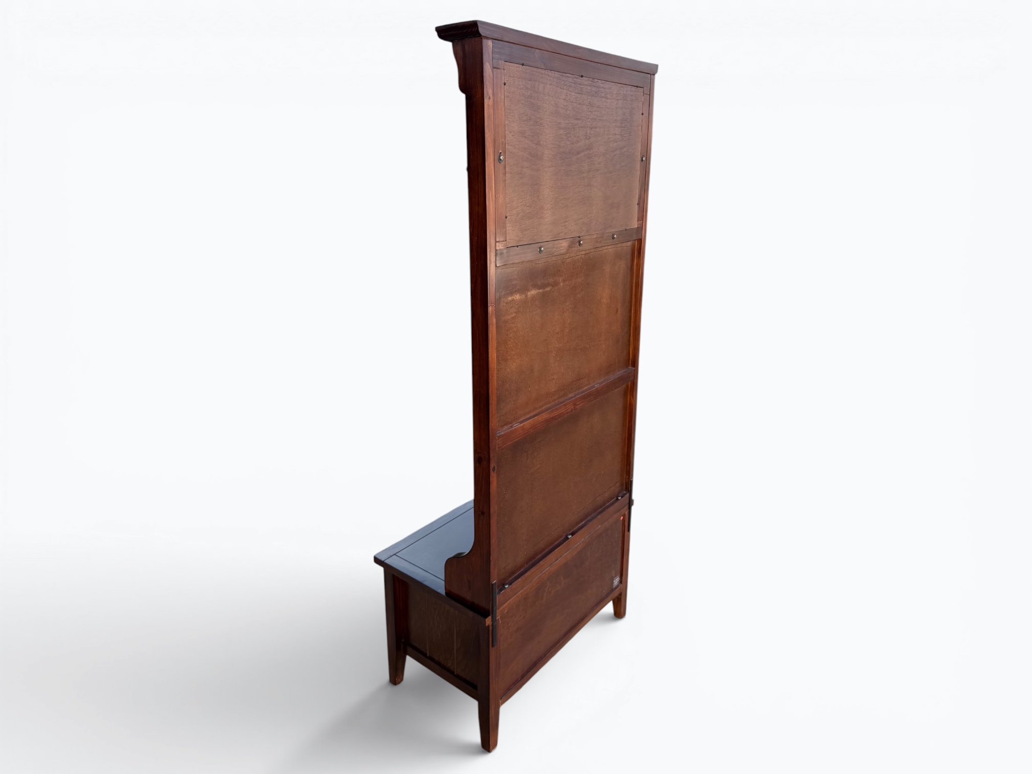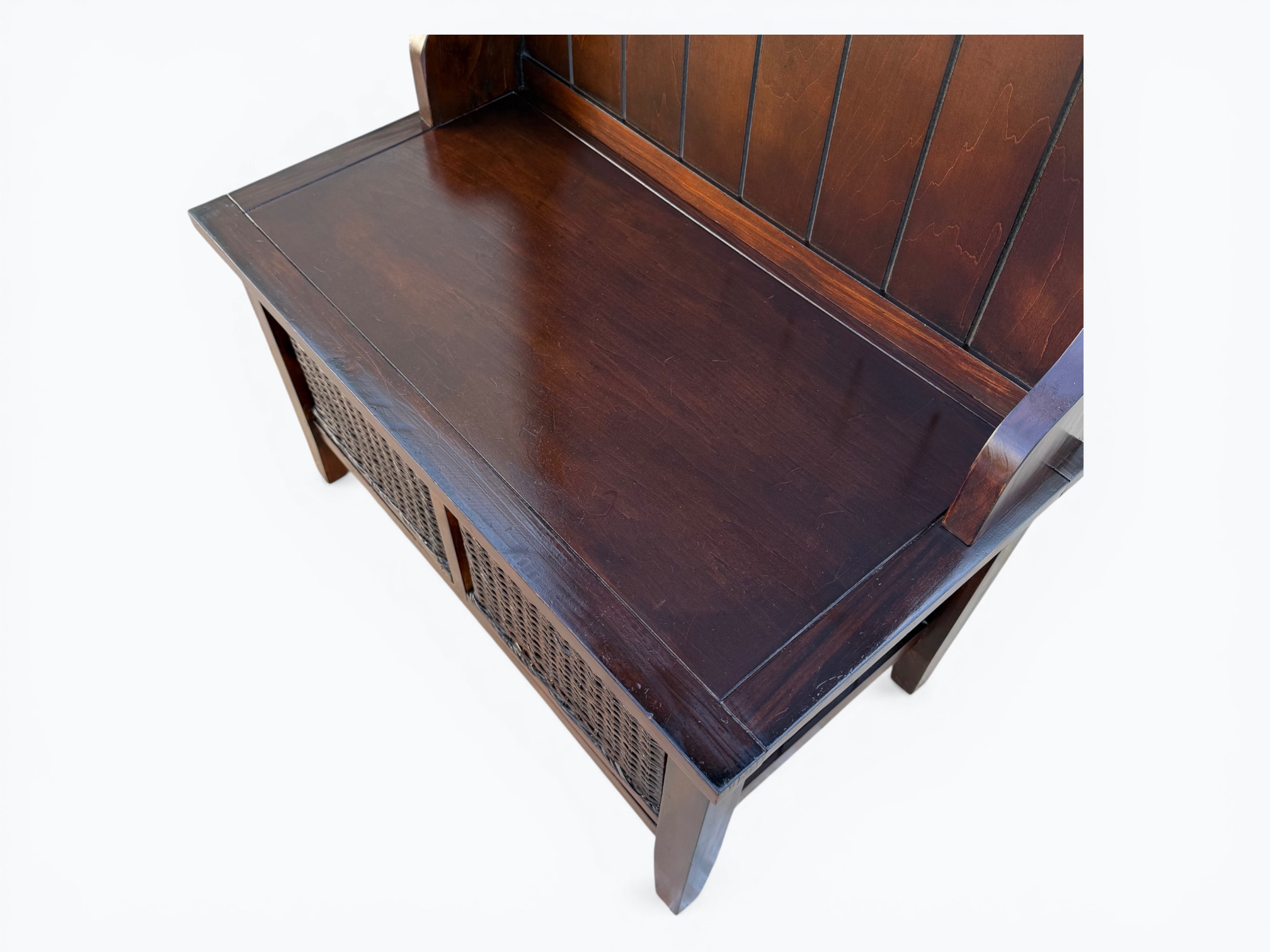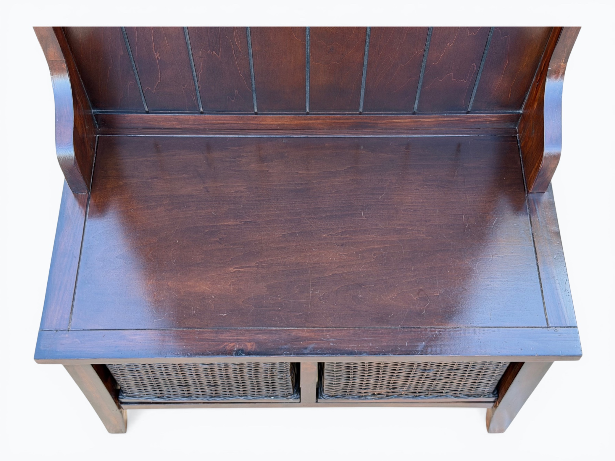 [Features]: 2 sliding wood-framed wicker storage baskets; 5 double coat hooks; 4-panel mirror; Crown-style top cap; Bench seat