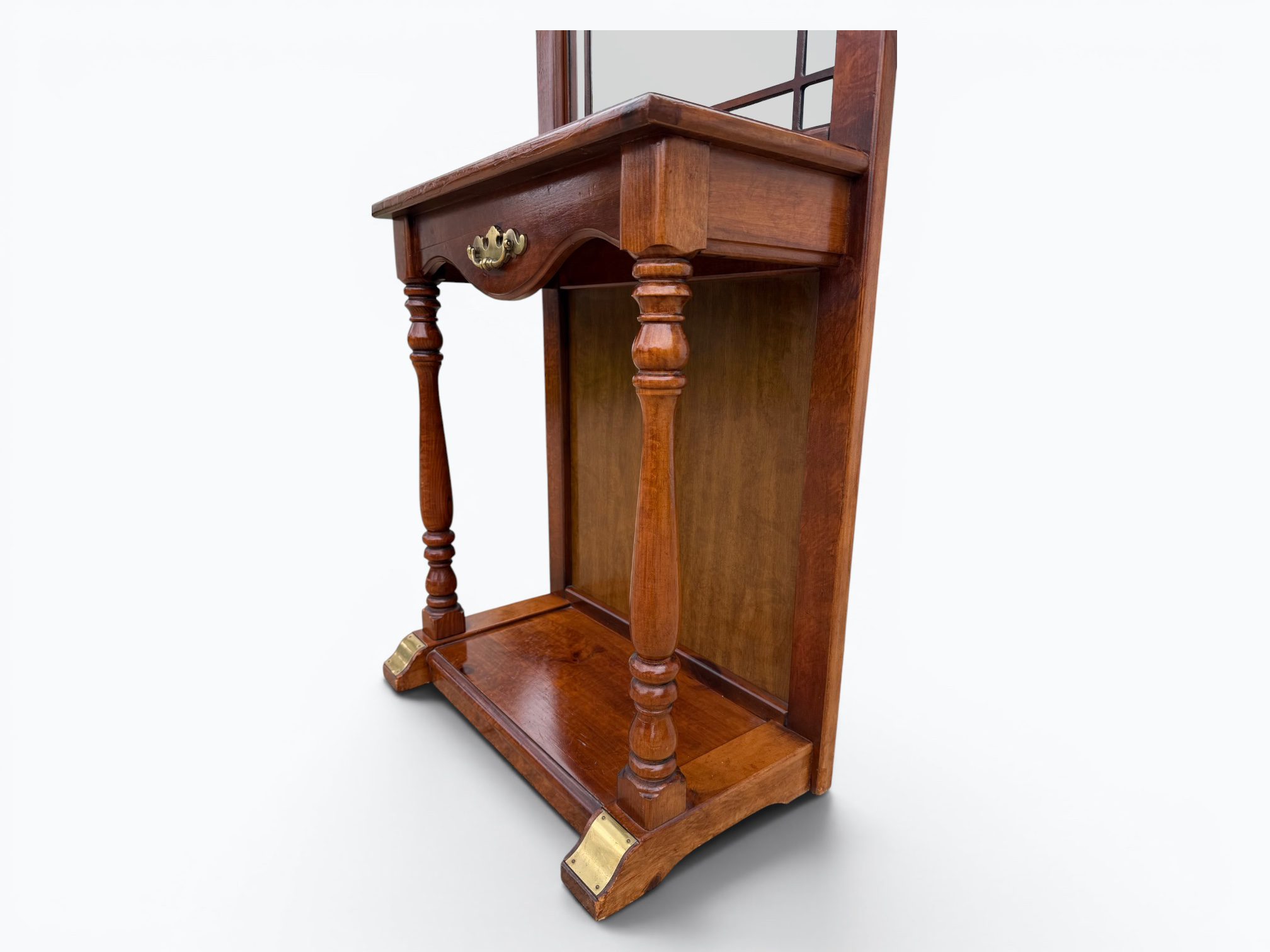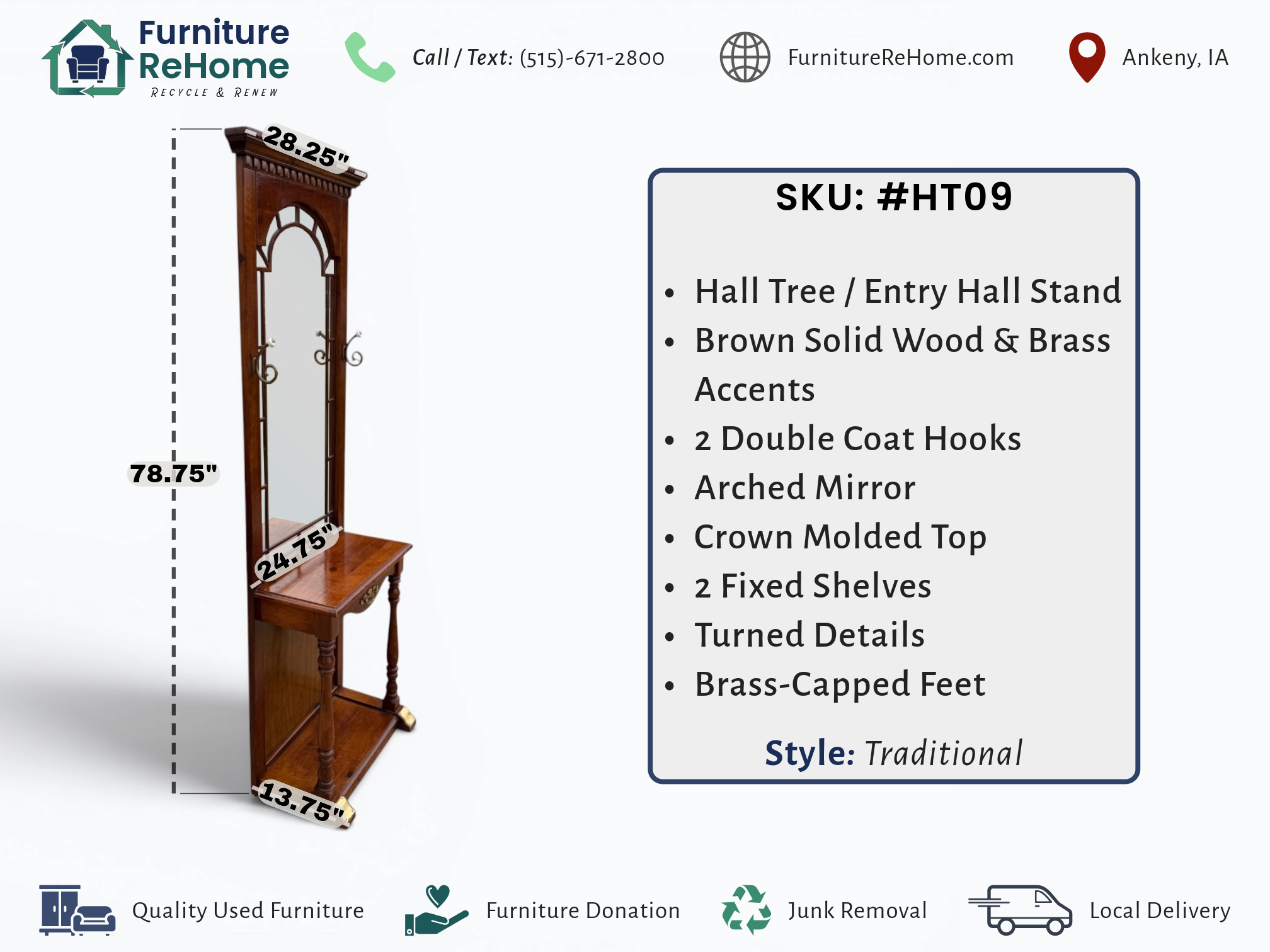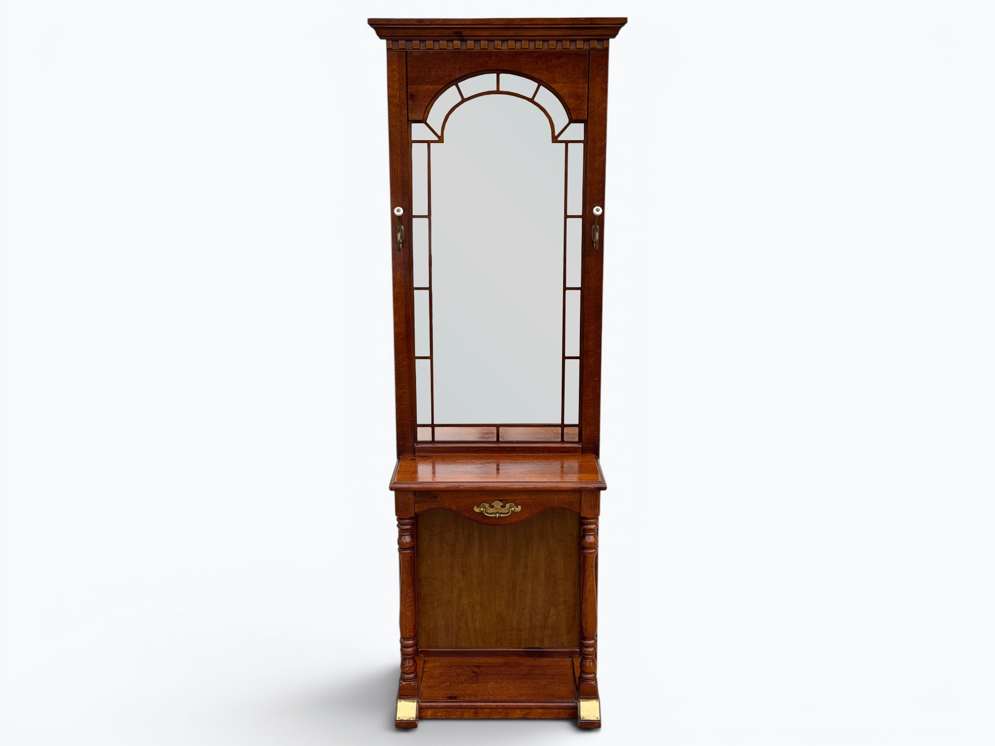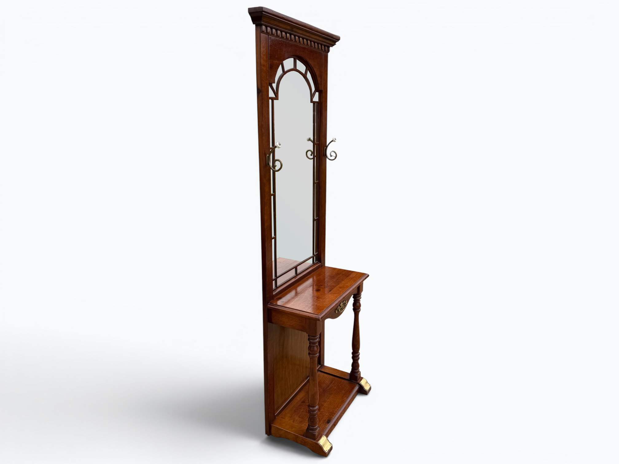 Brown Hall Tree with Arched Mirror, 2 Fixed Shelves & Brass Accents