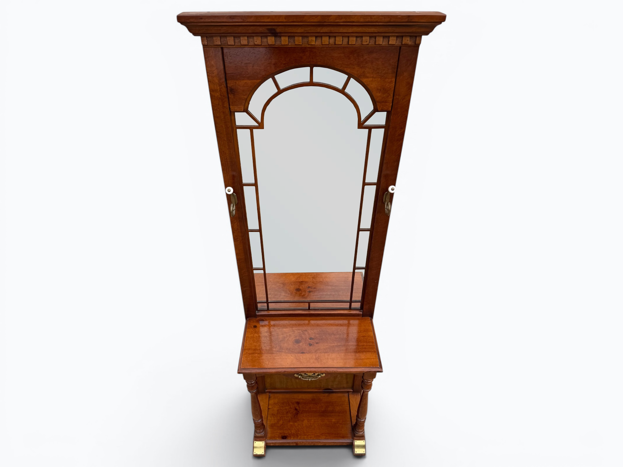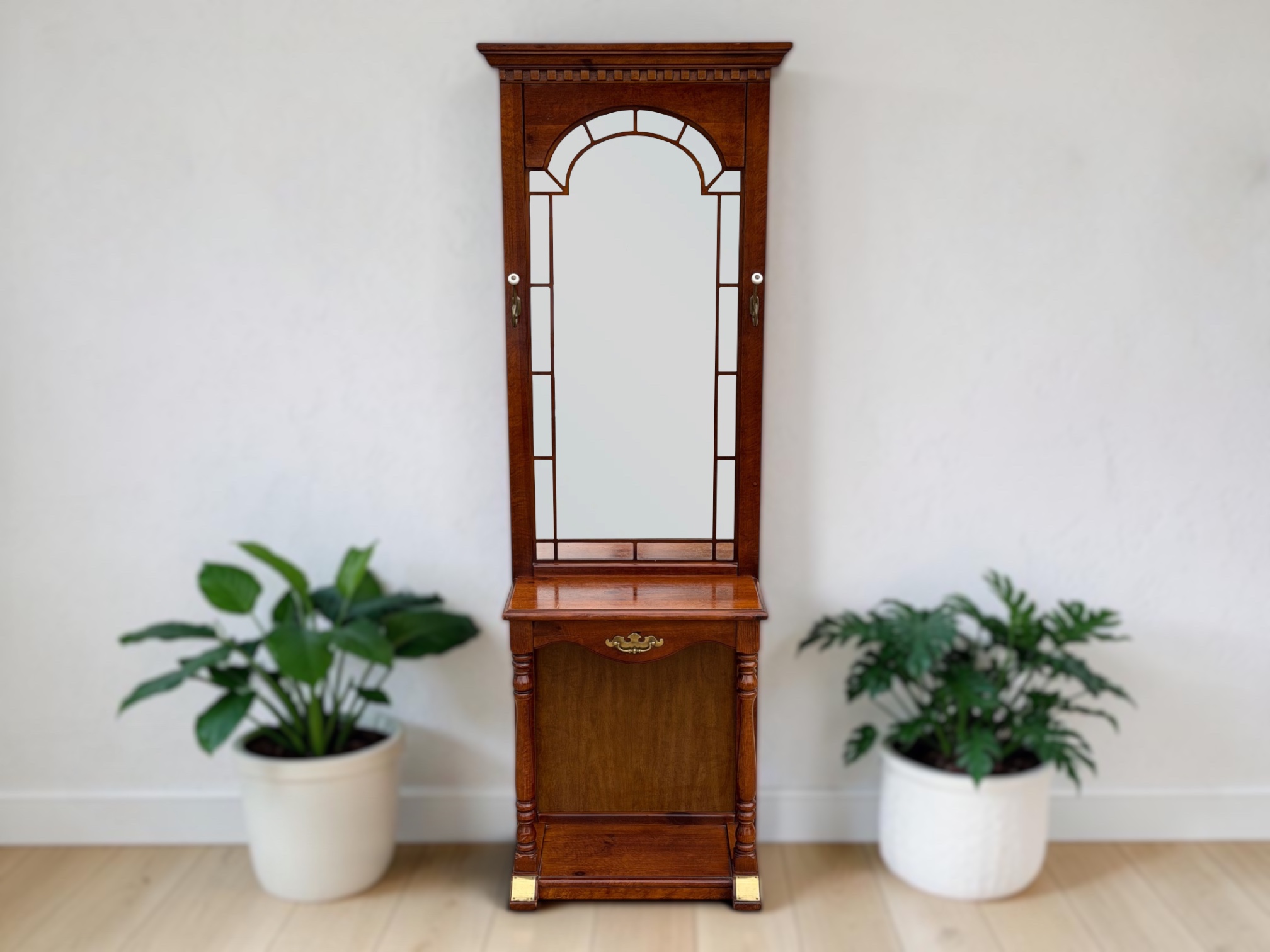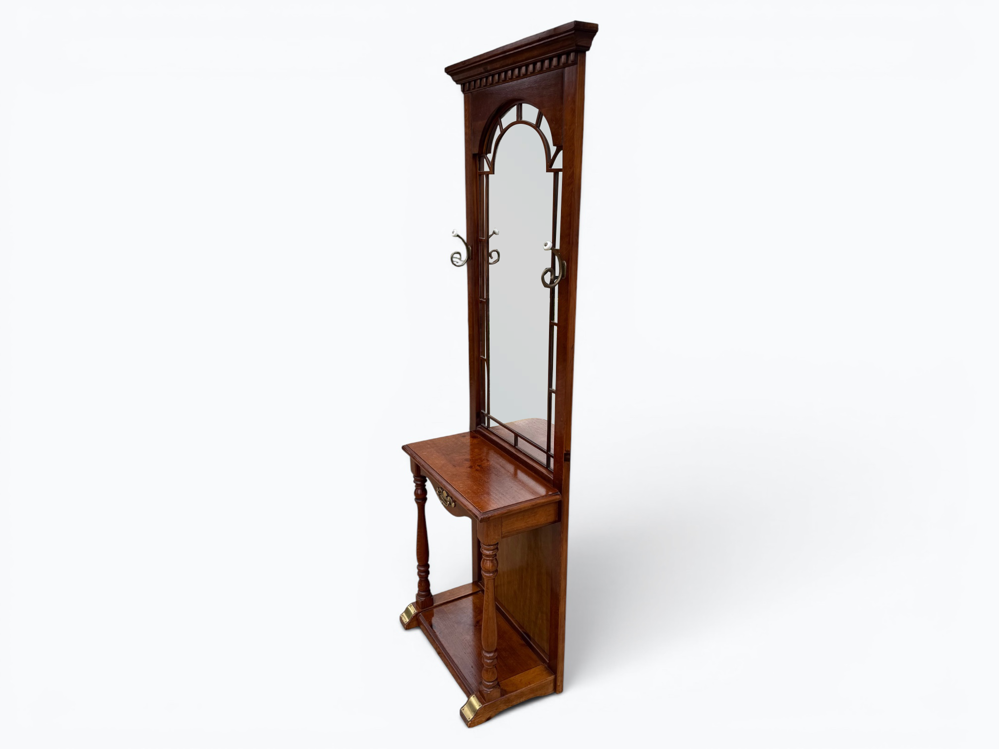 • [Features]: 2 double coat hooks; 2 fixed shelves; Arched mirror with crown molded top; Turned details; Brass-capped feet