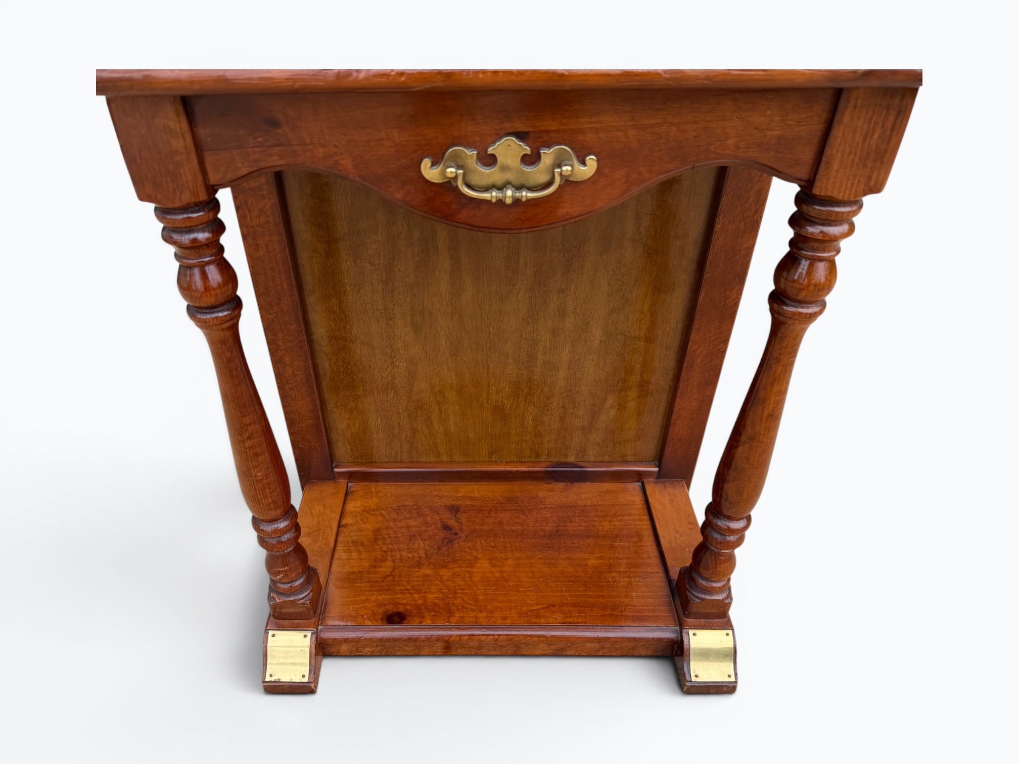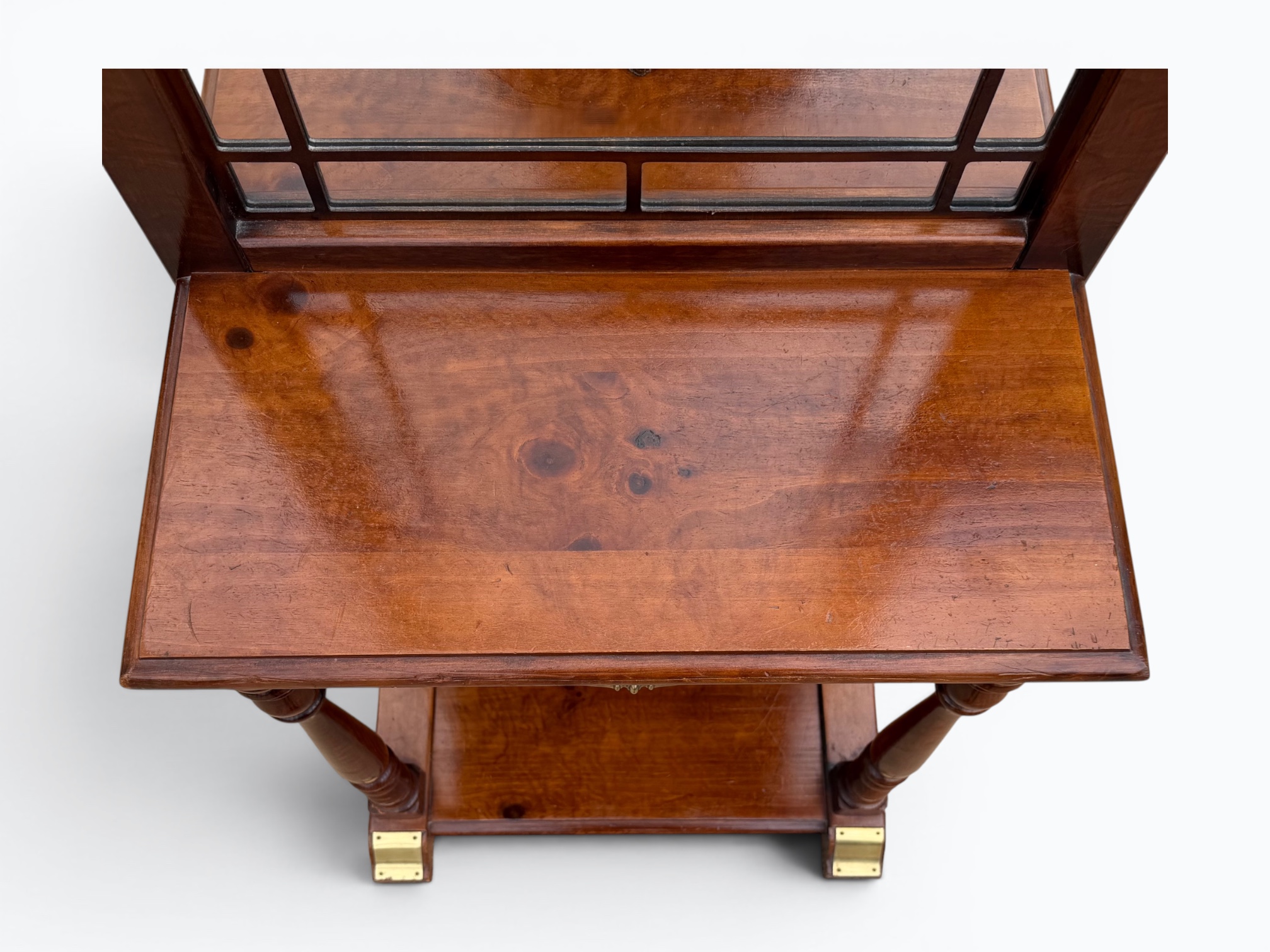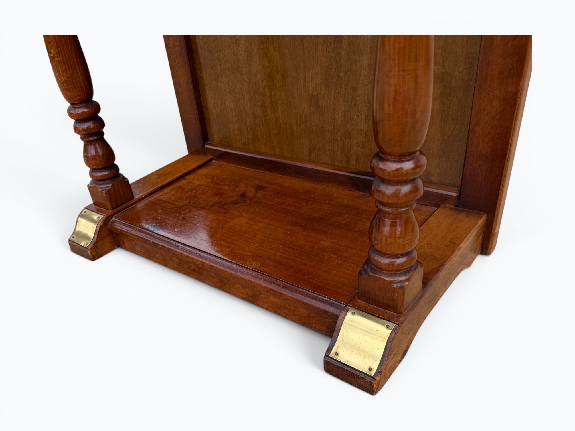 • [Features]: 2 double coat hooks; 2 fixed shelves; Arched mirror with crown molded top; Turned details; Brass-capped feet