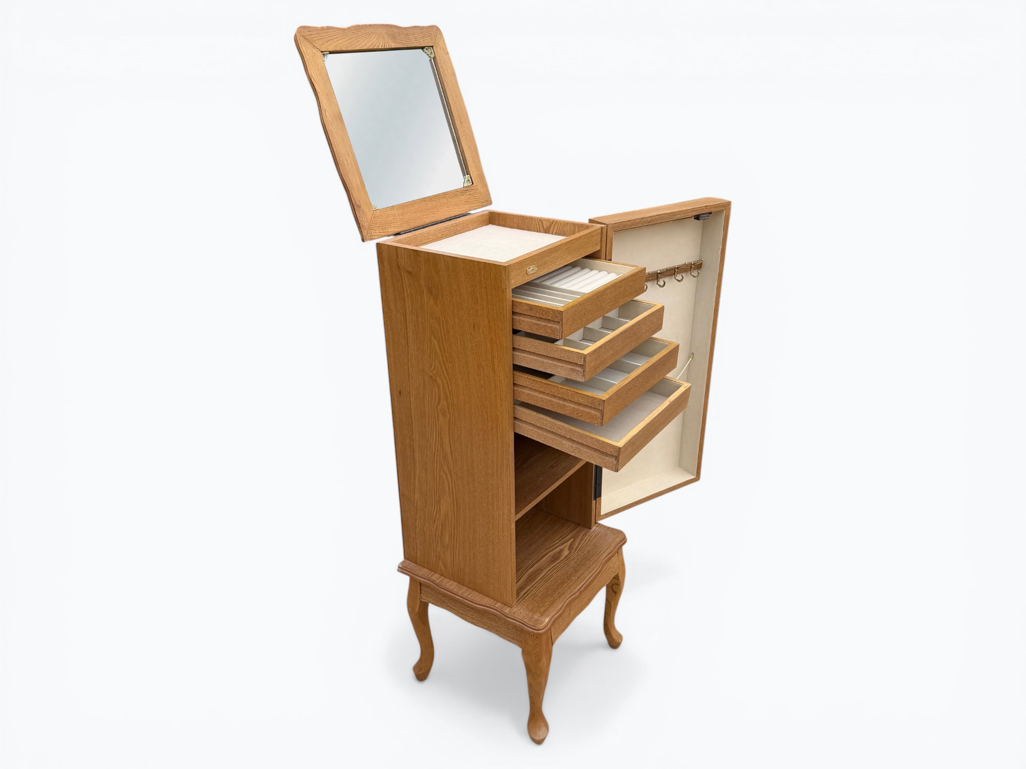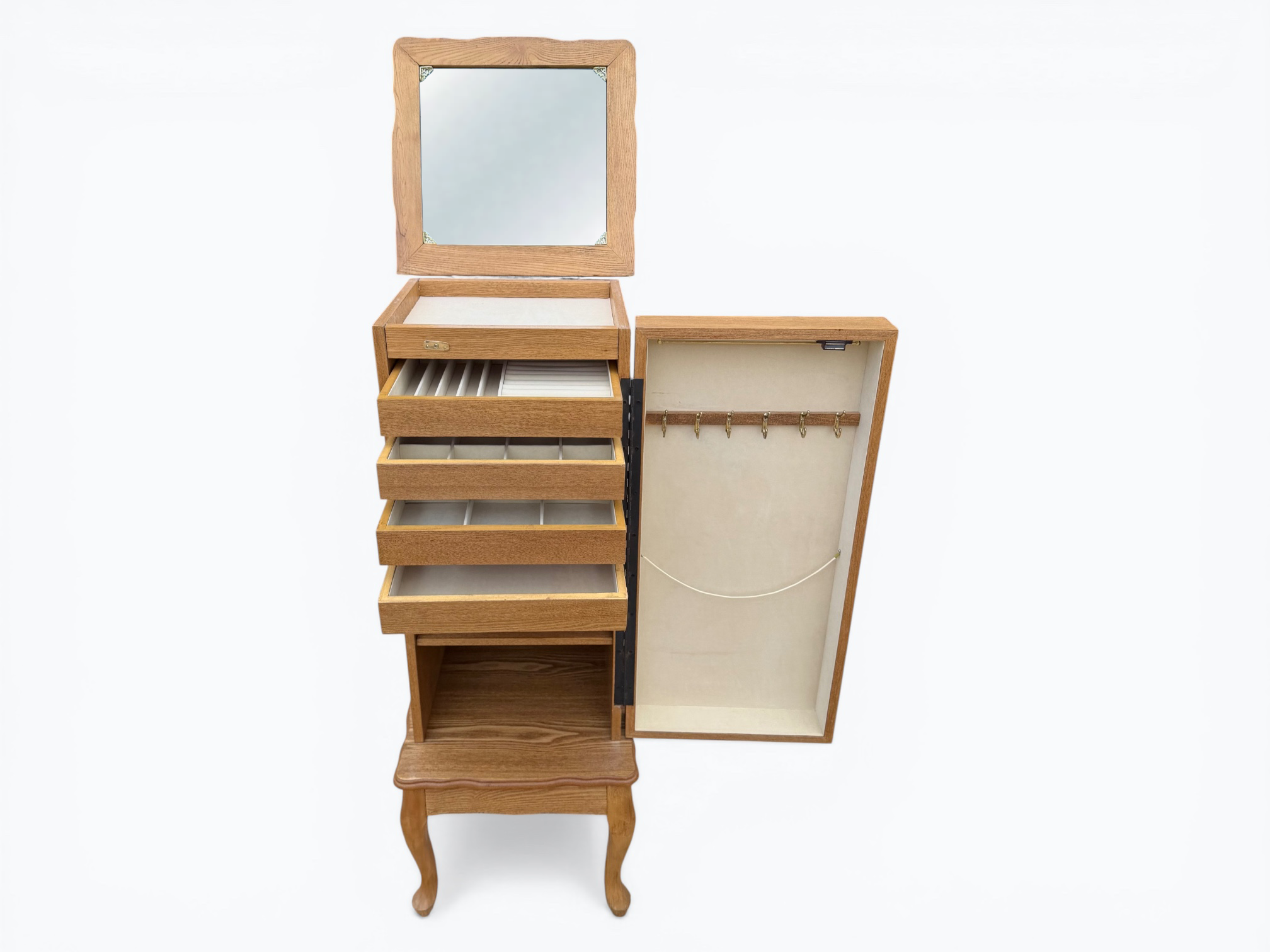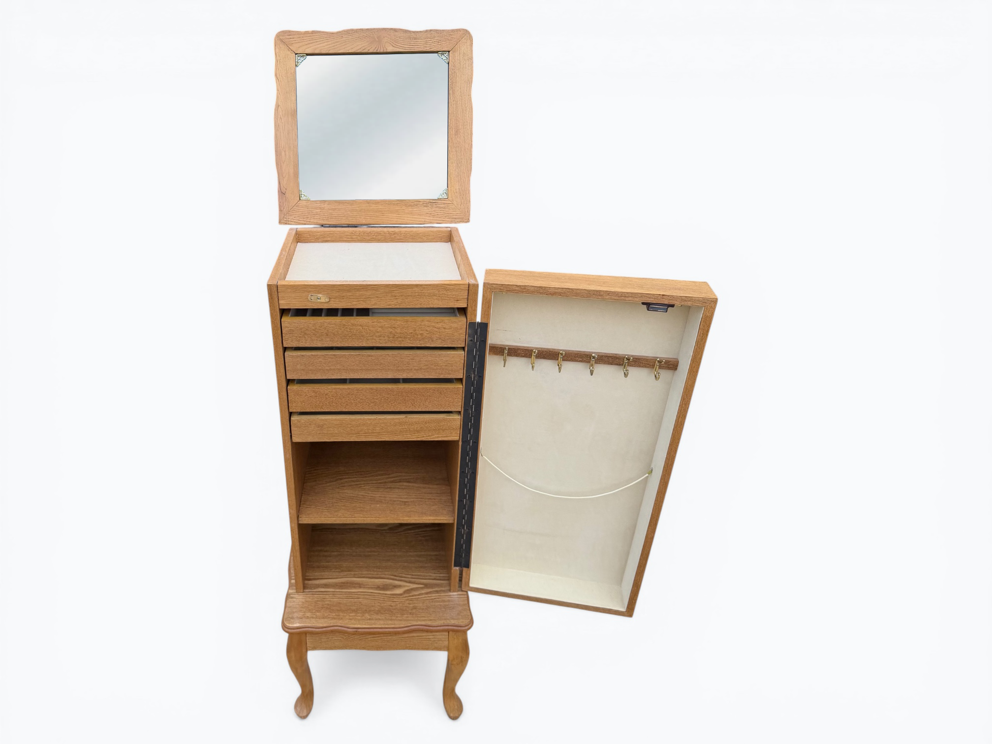 • [Features]: Top flips open and has a mirror and felt-lined storage compartment; 4 felt-lined drawer jewelry organizers; Cabinet door with necklace hangers; 2 lower fixed shelves; Cabriole legs