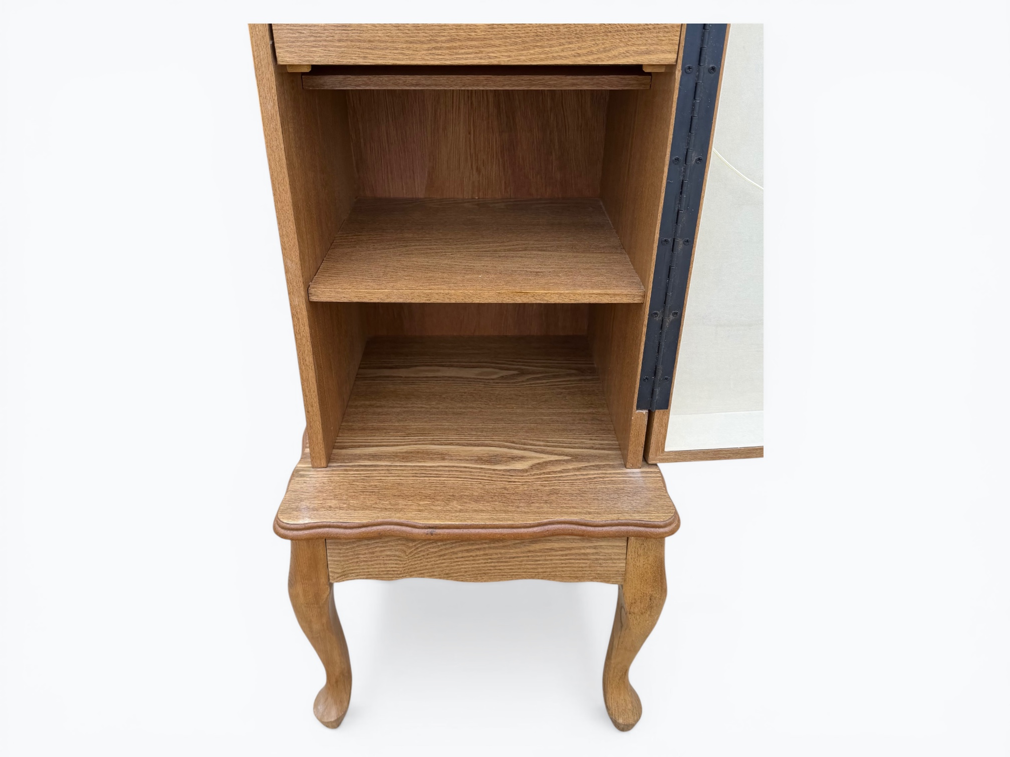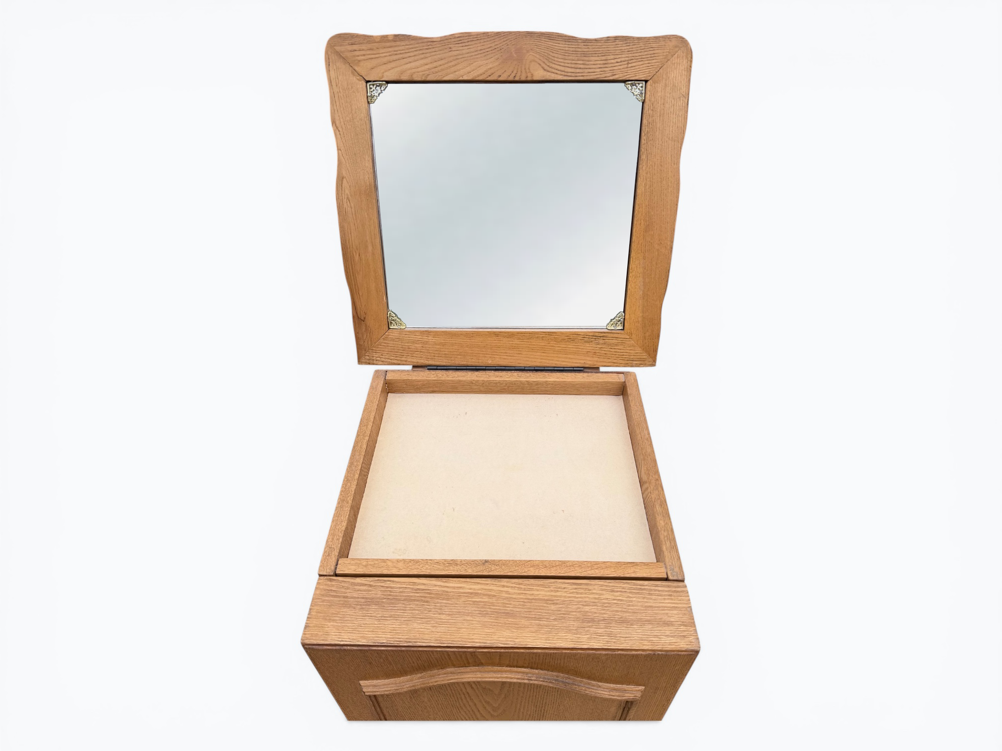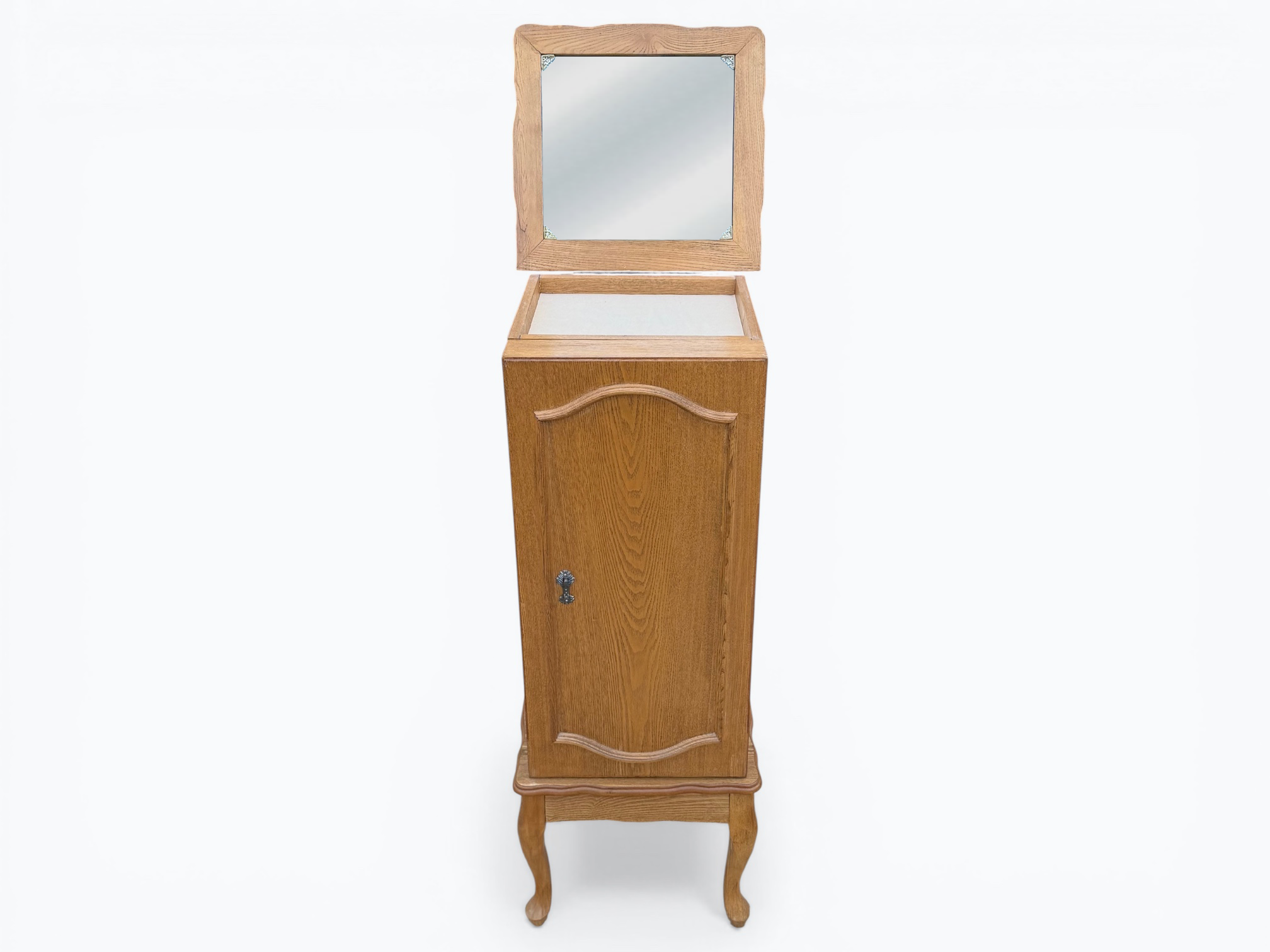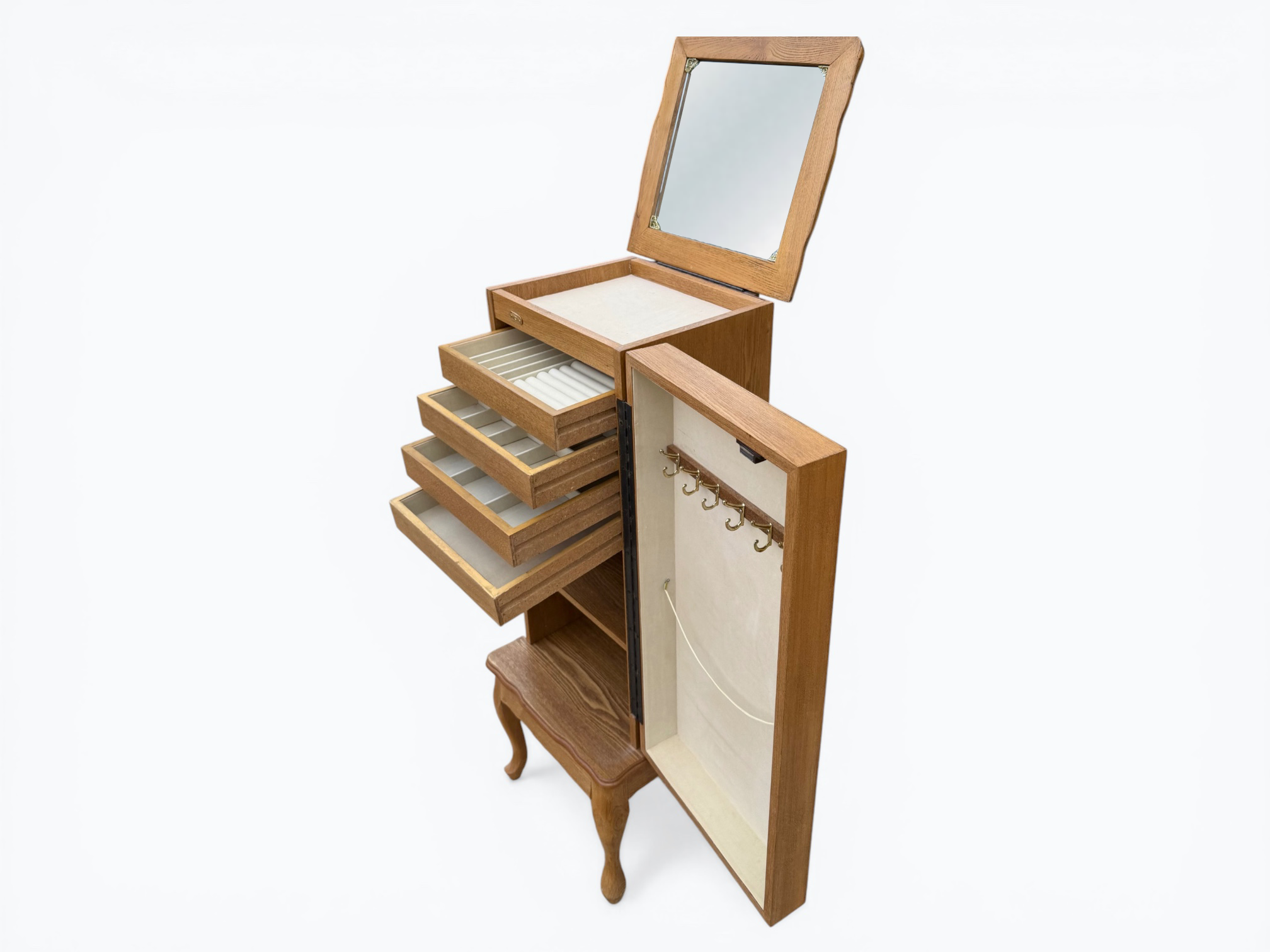 • [Features]: Top flips open and has a mirror and felt-lined storage compartment; 4 felt-lined drawer jewelry organizers; Cabinet door with necklace hangers; 2 lower fixed shelves; Cabriole legs