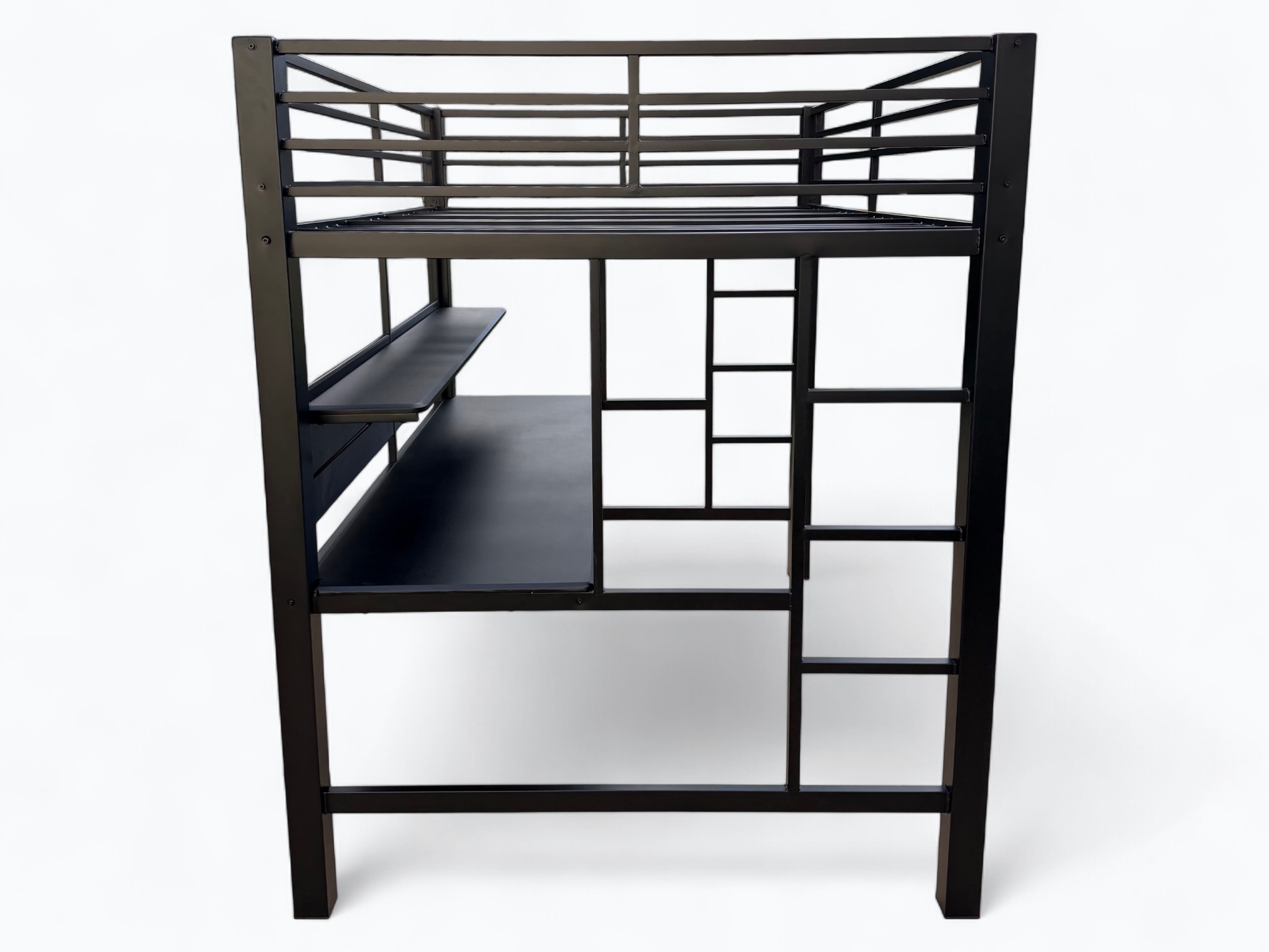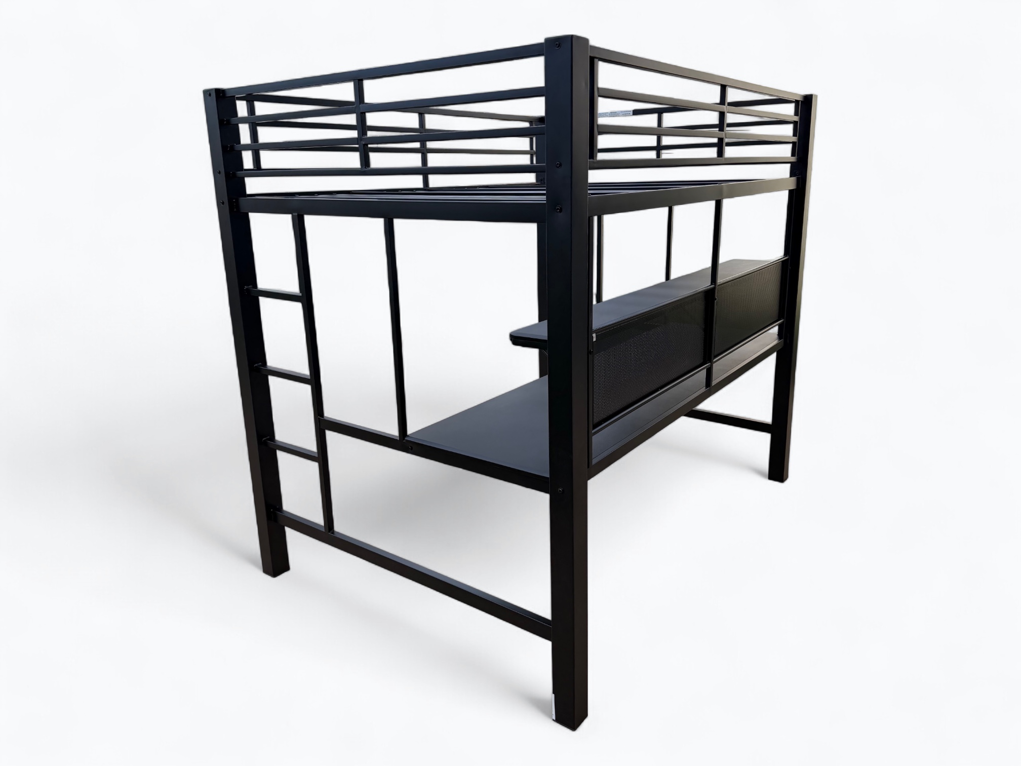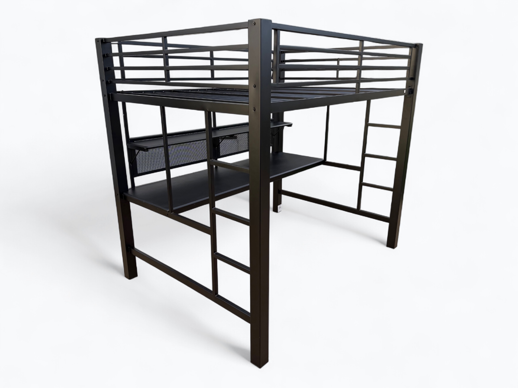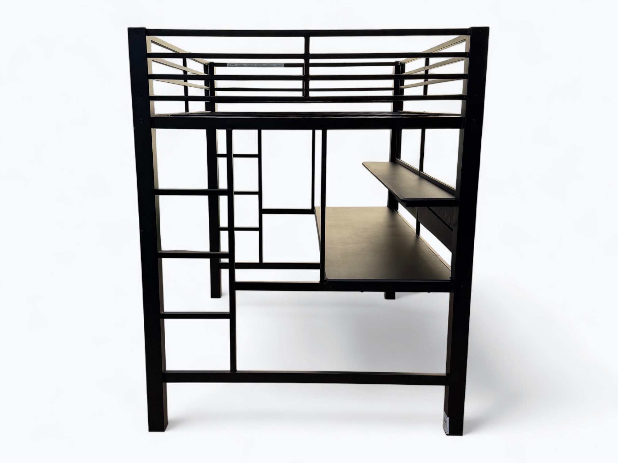 • [Features]: Lower workstation has a spacious full-length desk top, sliding keyboard tray, and storage shelf; Full-length guardrails and ladder on both sides; Fits a full size mattress