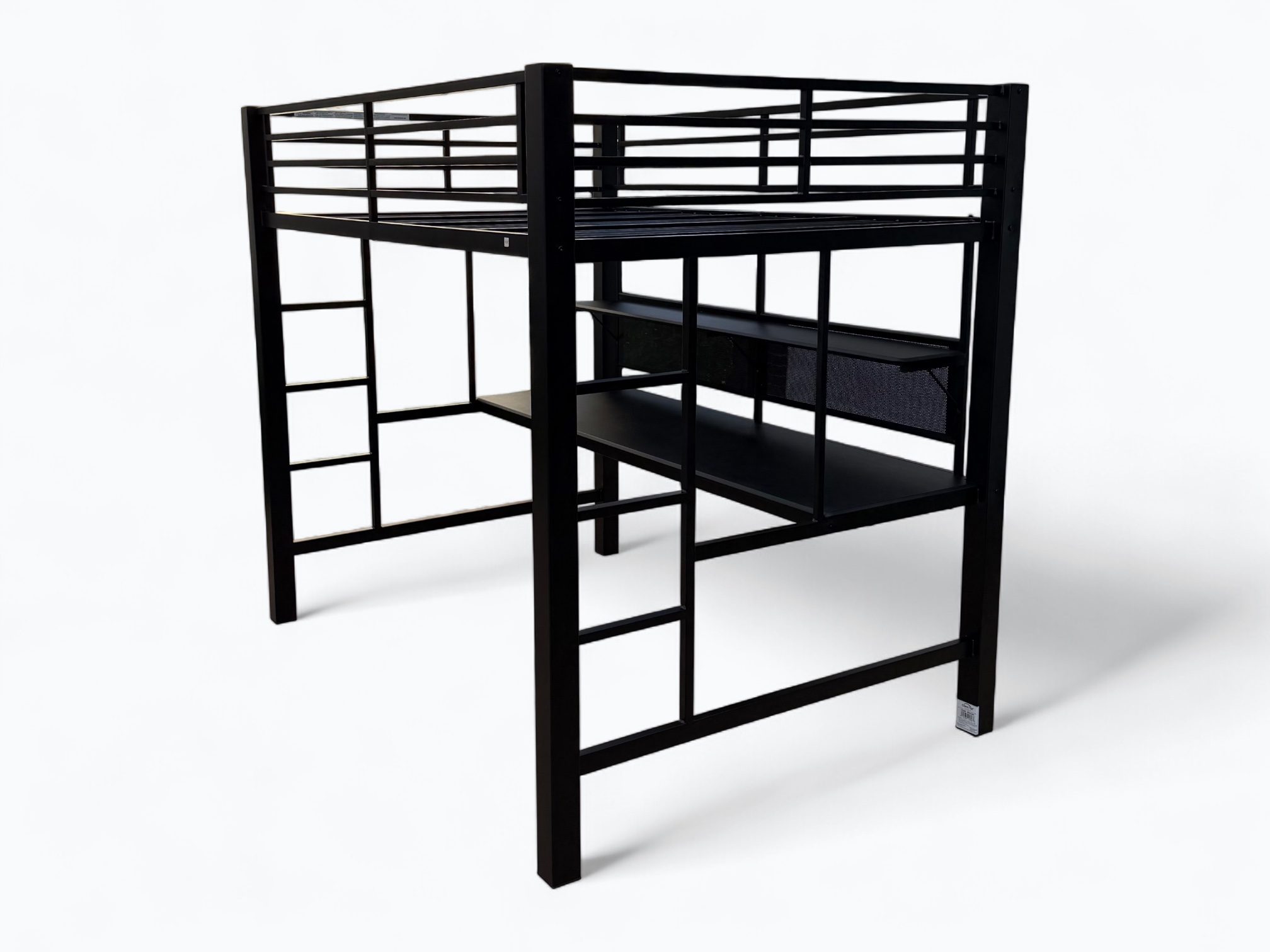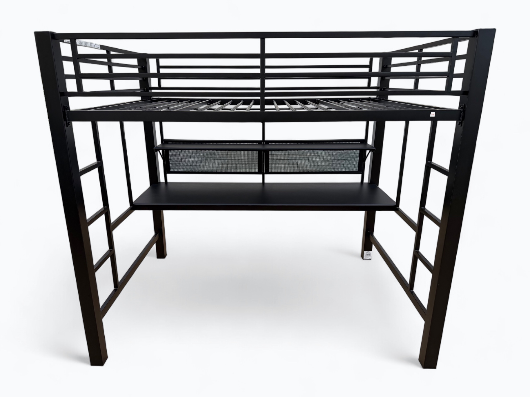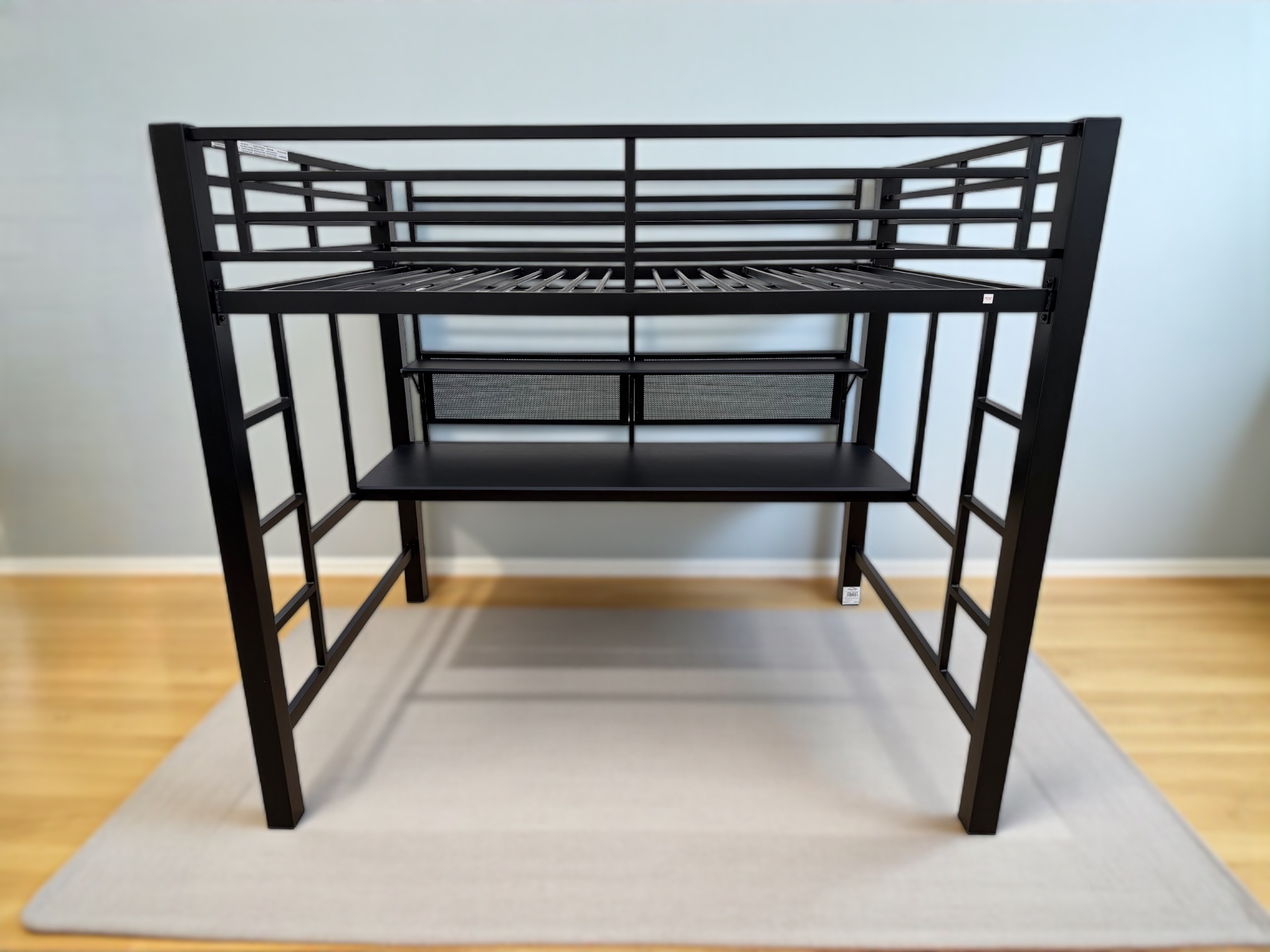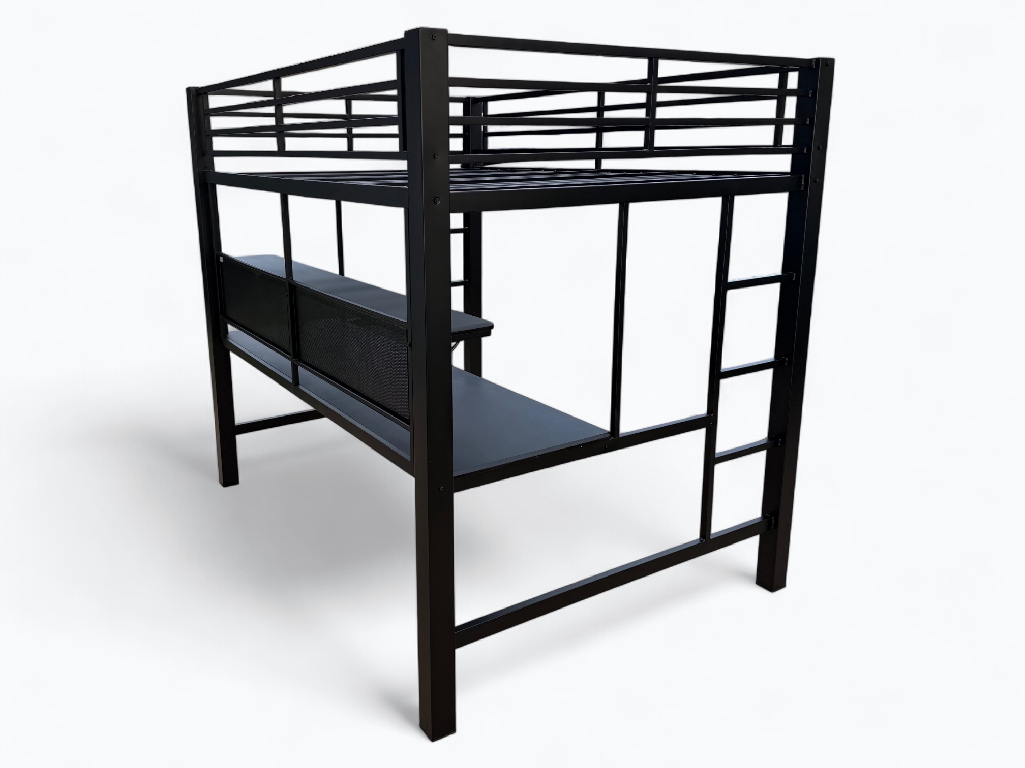 • [Features]: Lower workstation has a spacious full-length desk top, sliding keyboard tray, and storage shelf; Full-length guardrails and ladder on both sides; Fits a full size mattress