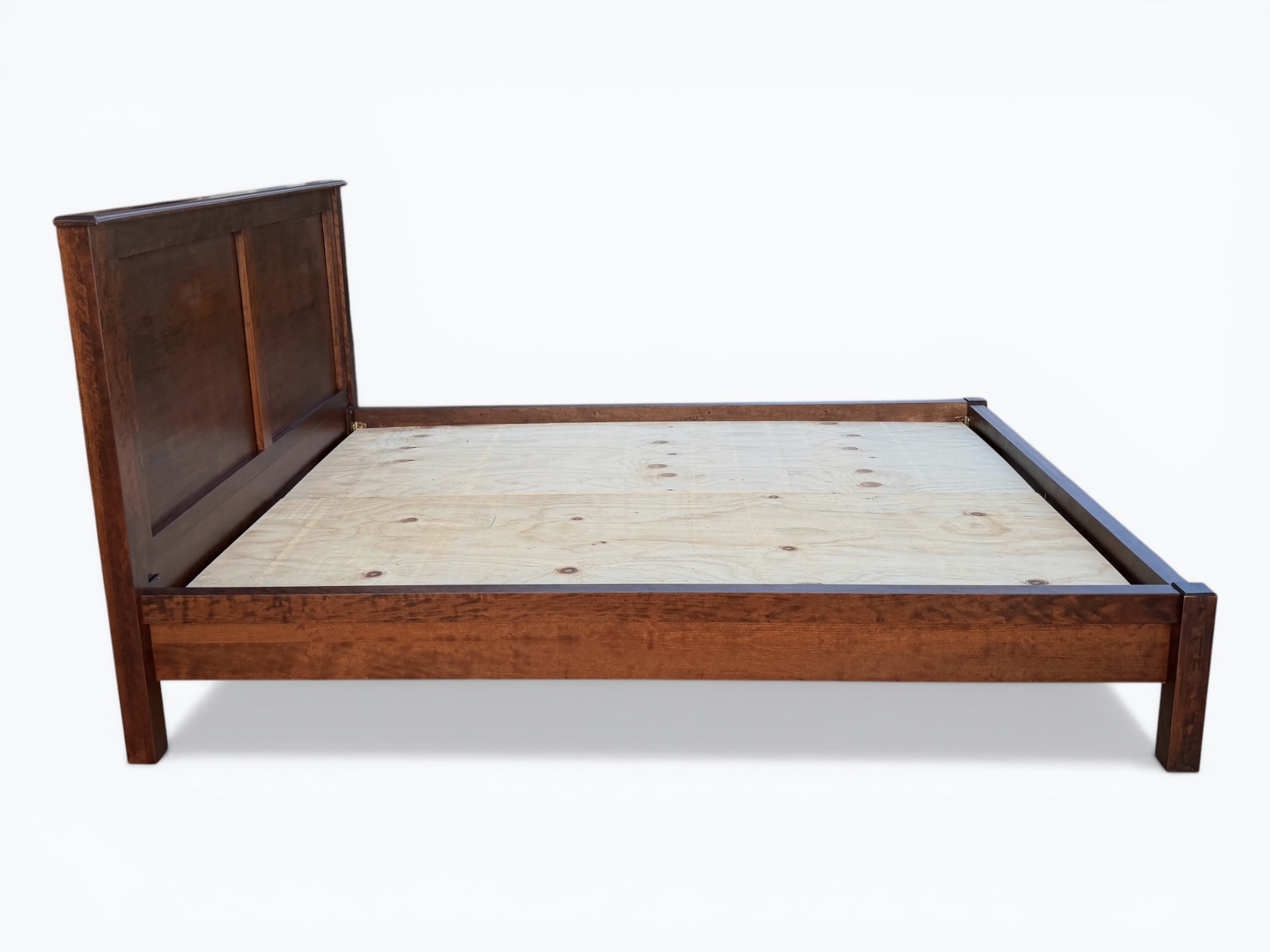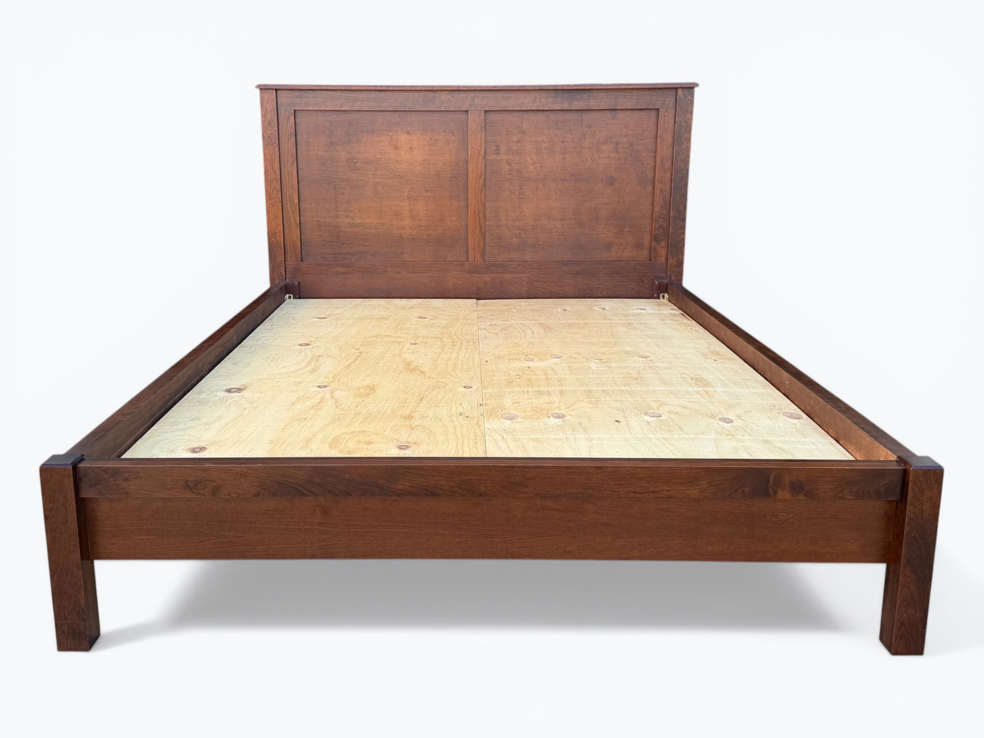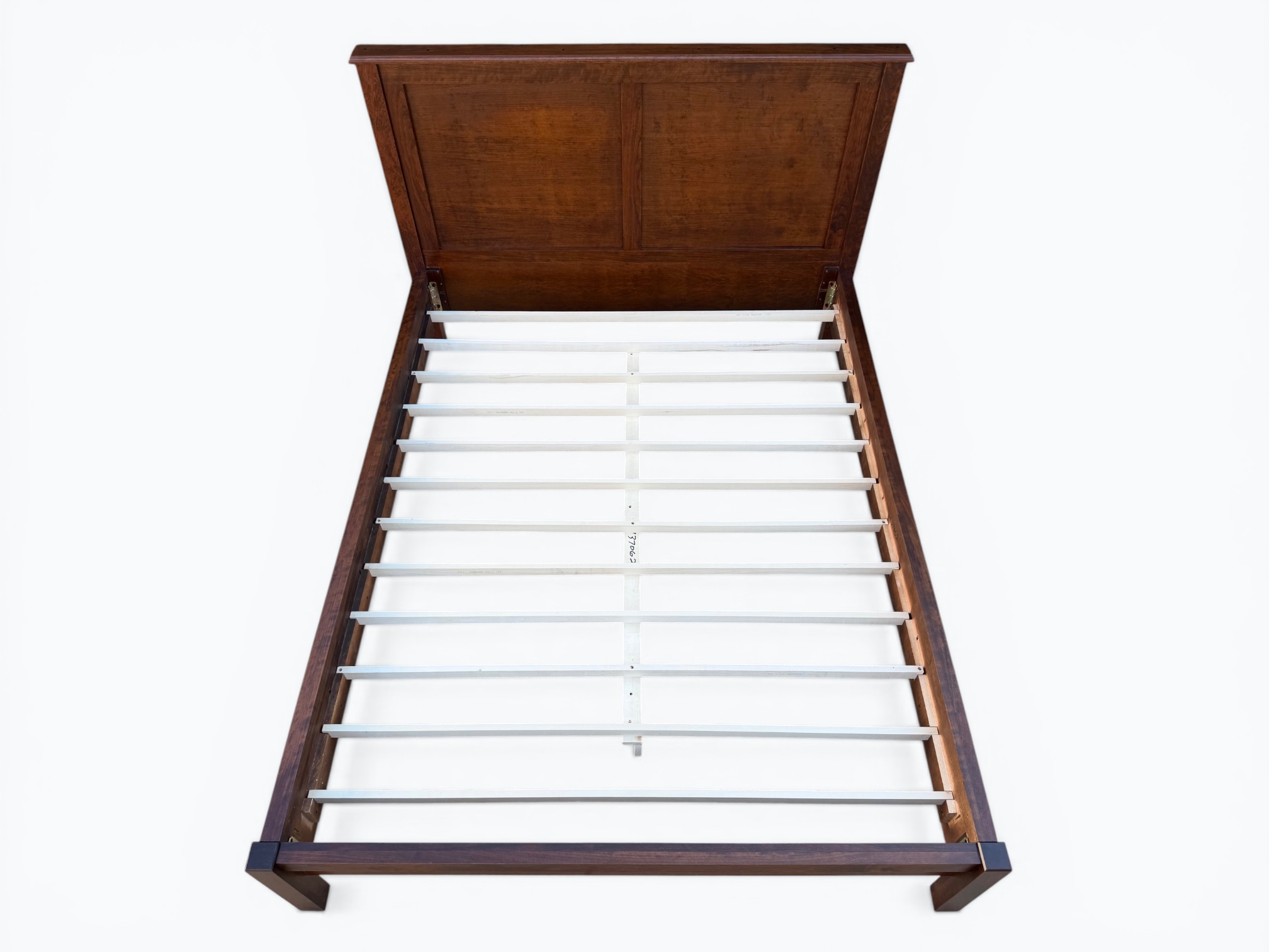 [Features]: Platform style (box spring not needed); 12 bed slats that fit into grooves; Center weight support; Bed rails hook into place; 2 plywood panels; Overhanging side rails and footboard