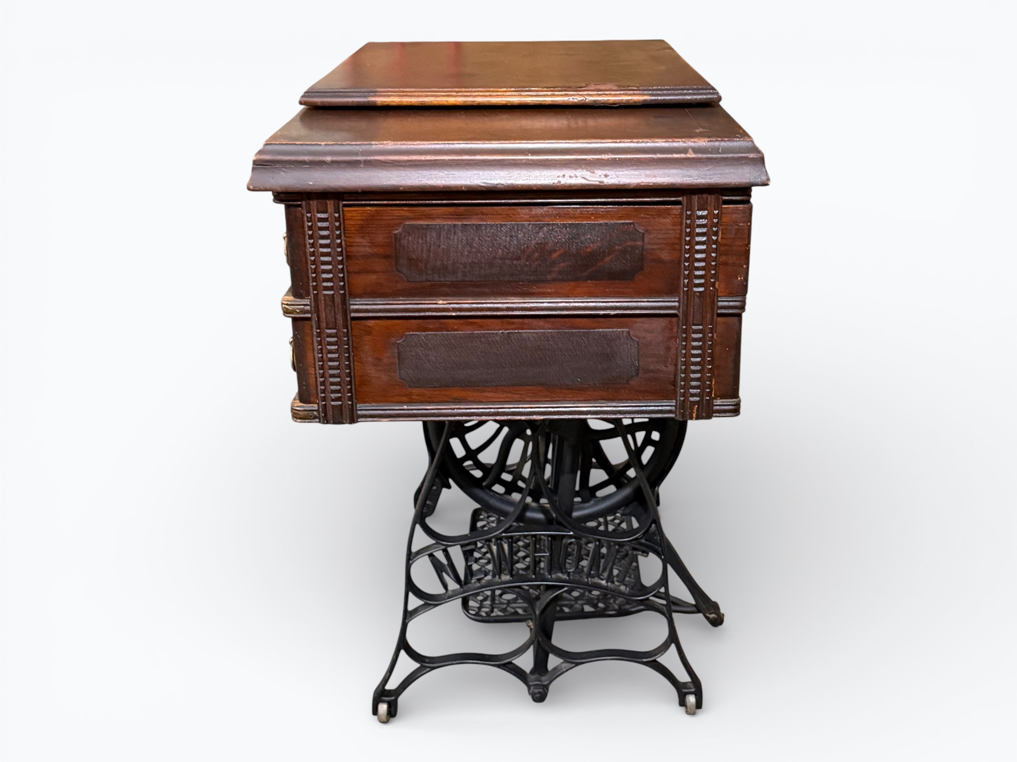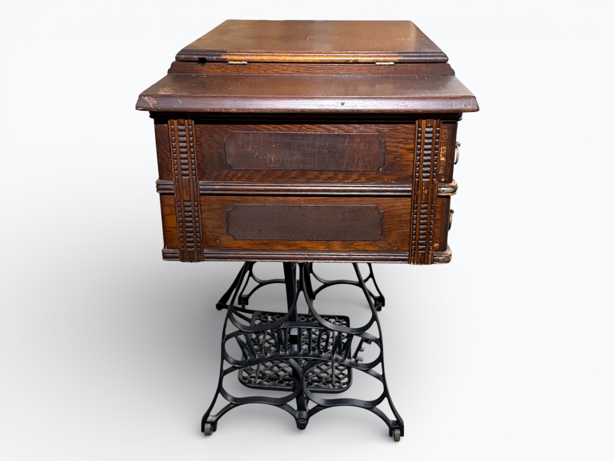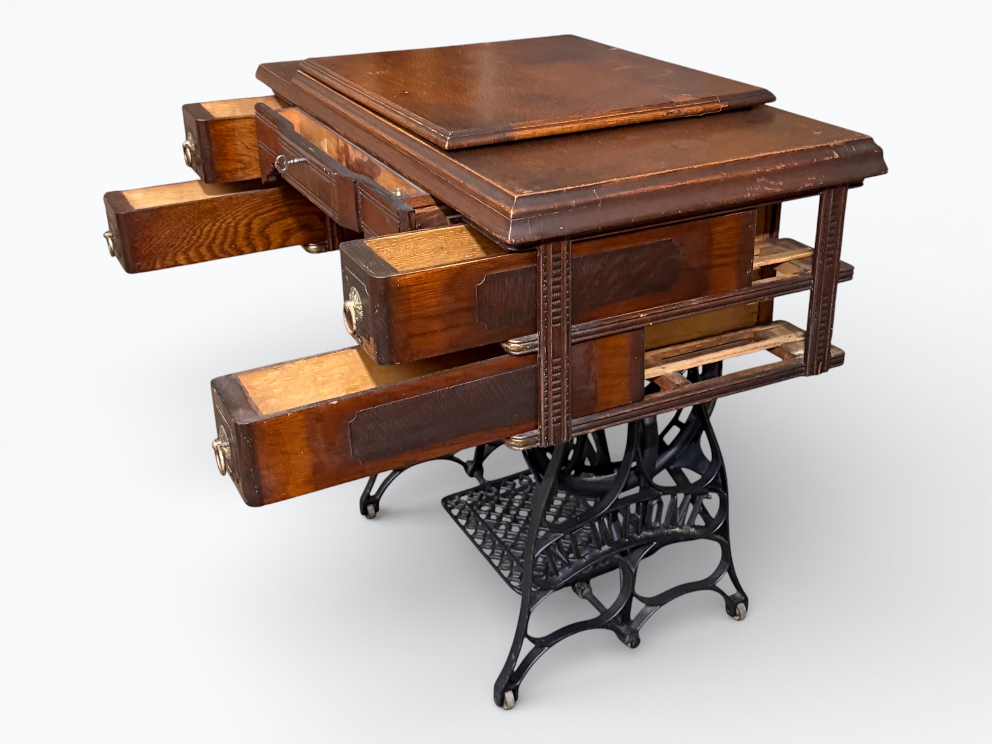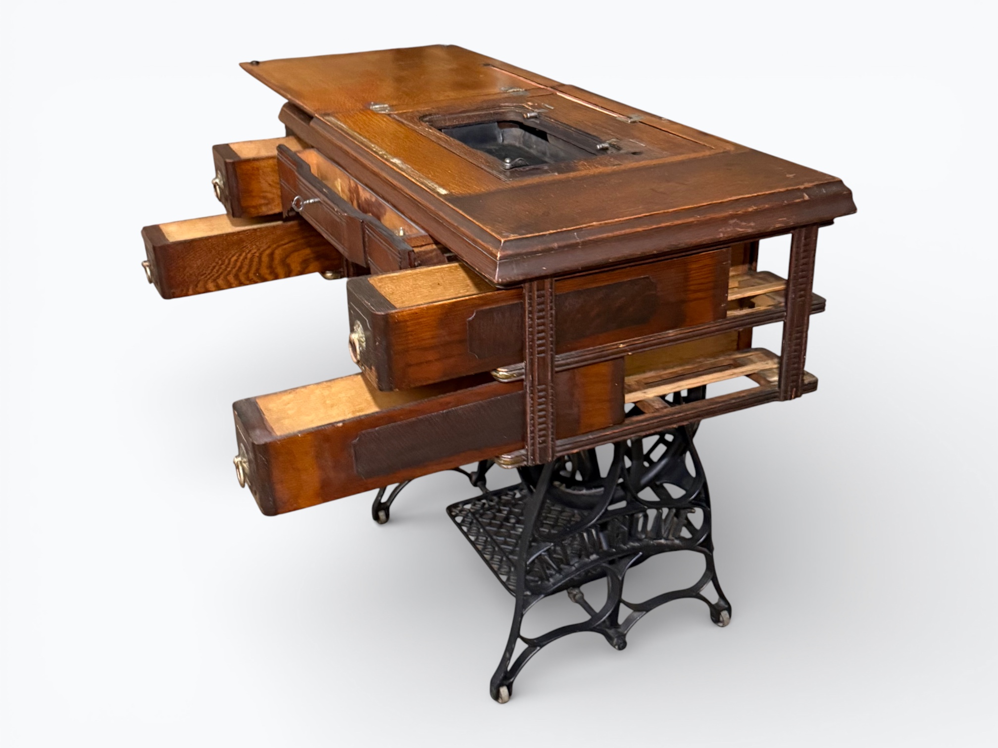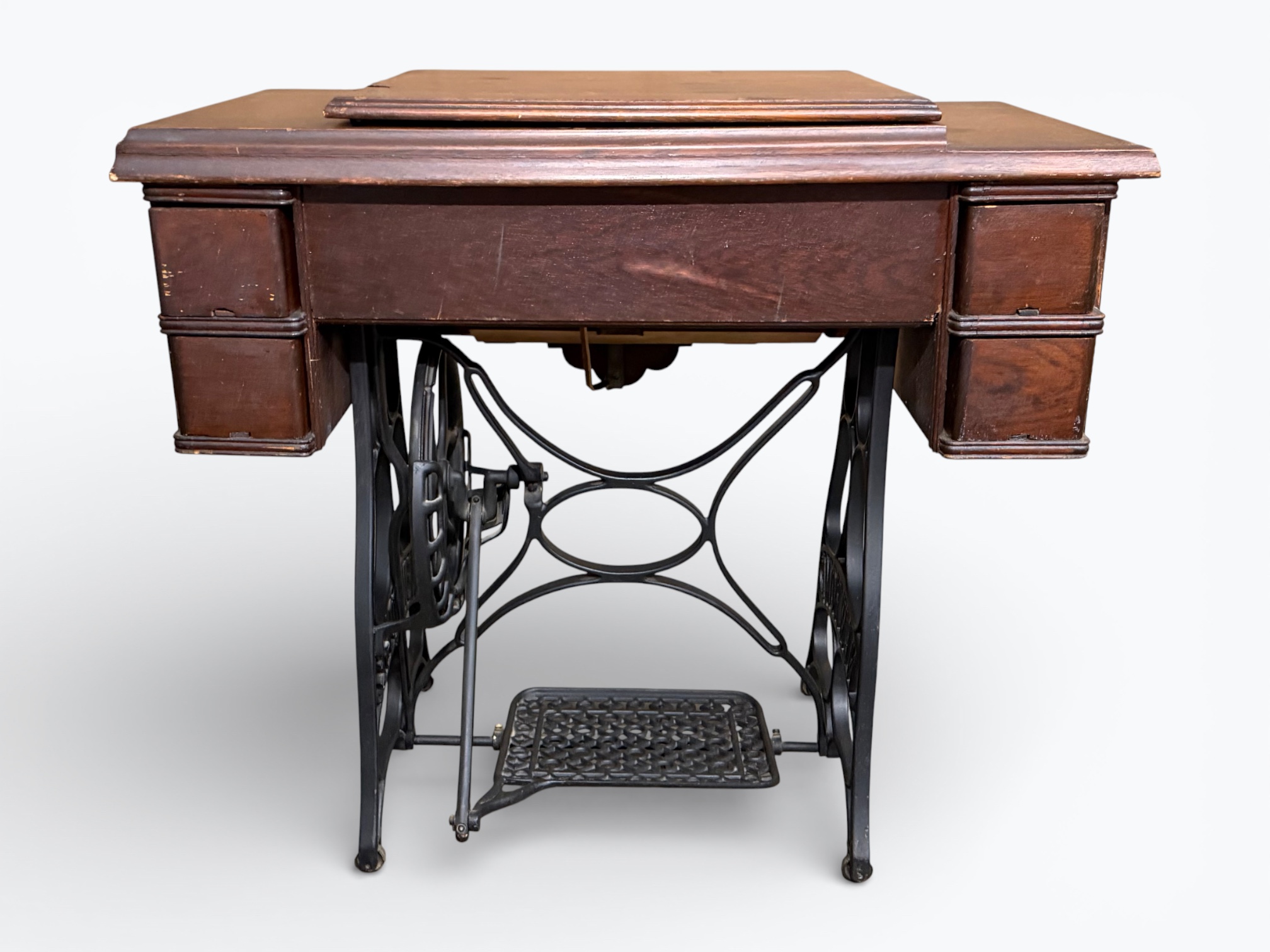 • [Features]: Original paperwork; Historical bill of sale when purchased second-hand in 1946 in Dubuque, IA; Treadle pedal and flywheel base; 4 skinny long drawers on the sides, and 1 thin center drawer with a thread spool storage block and original spools; All drawers lock and include the key; Ring drop drawer pulls with decorative backplates; Folding lift-top cabinet; Scalloped center apron; Stepped and molded top edges; Leather treadle drive belt included; Integrated seam guide ruler inlay; Stamped patent from 1985