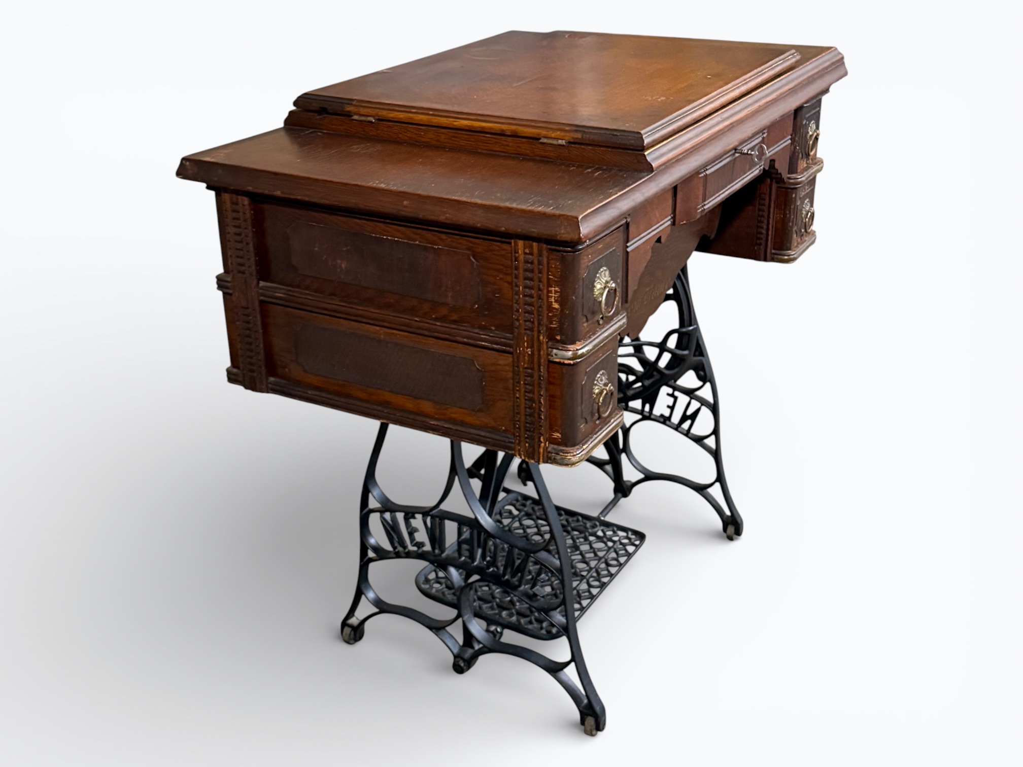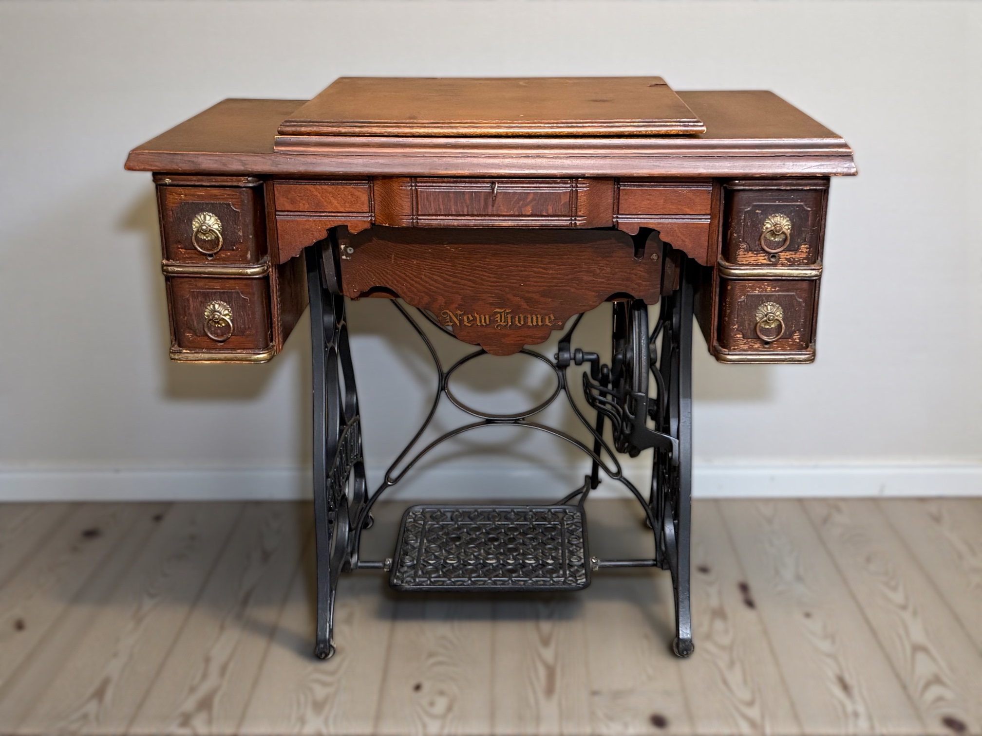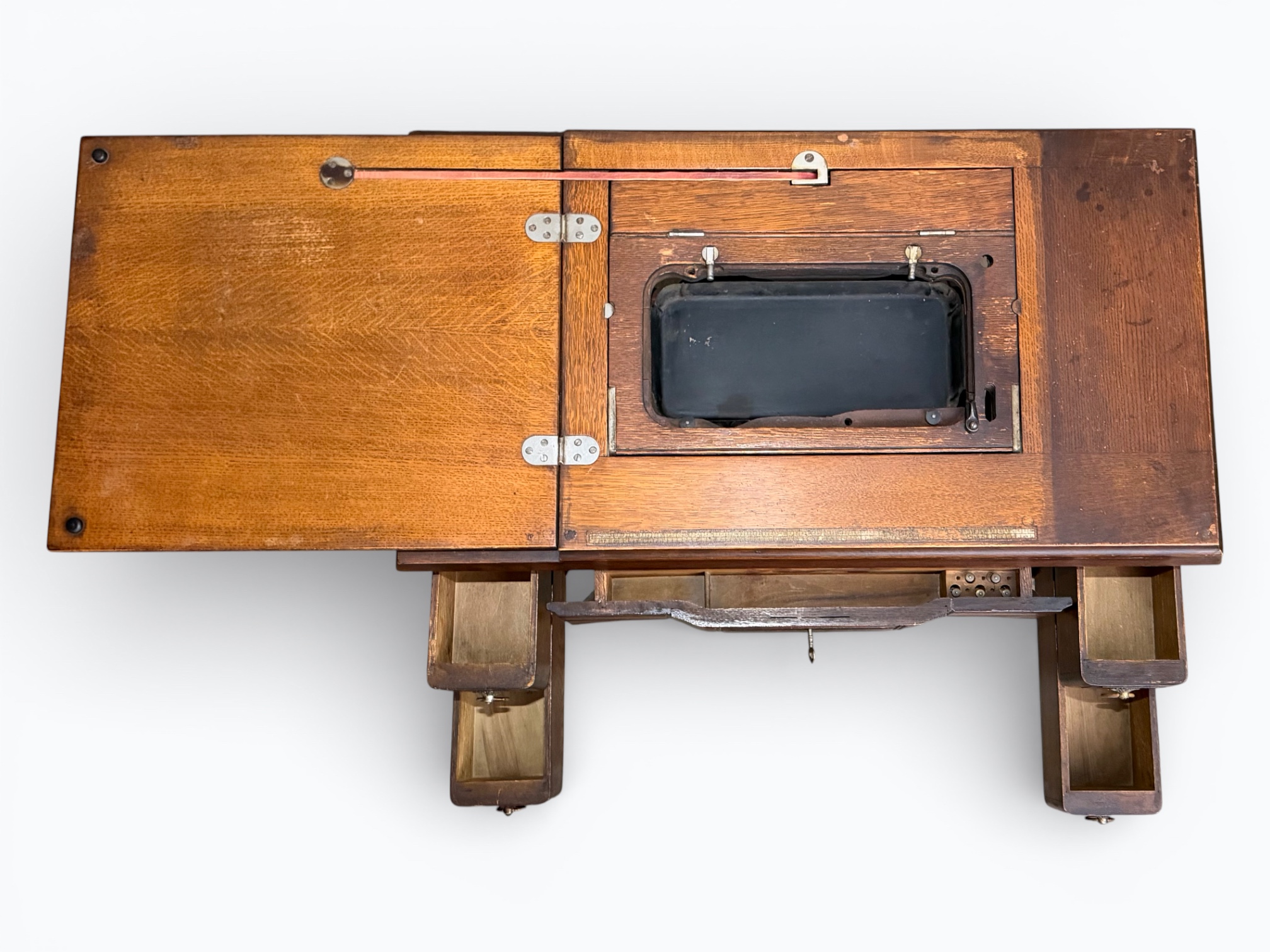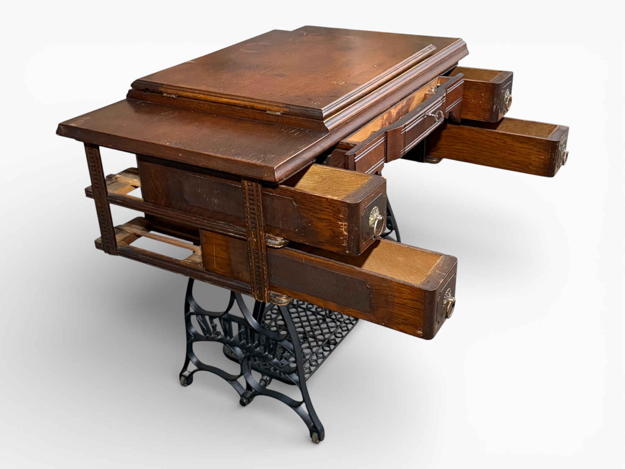 • [Features]: Original paperwork; Historical bill of sale when purchased second-hand in 1946 in Dubuque, IA; Treadle pedal and flywheel base; 4 skinny long drawers on the sides, and 1 thin center drawer with a thread spool storage block and original spools; All drawers lock and include the key; Ring drop drawer pulls with decorative backplates; Folding lift-top cabinet; Scalloped center apron; Stepped and molded top edges; Leather treadle drive belt included; Integrated seam guide ruler inlay; Stamped patent from 1985