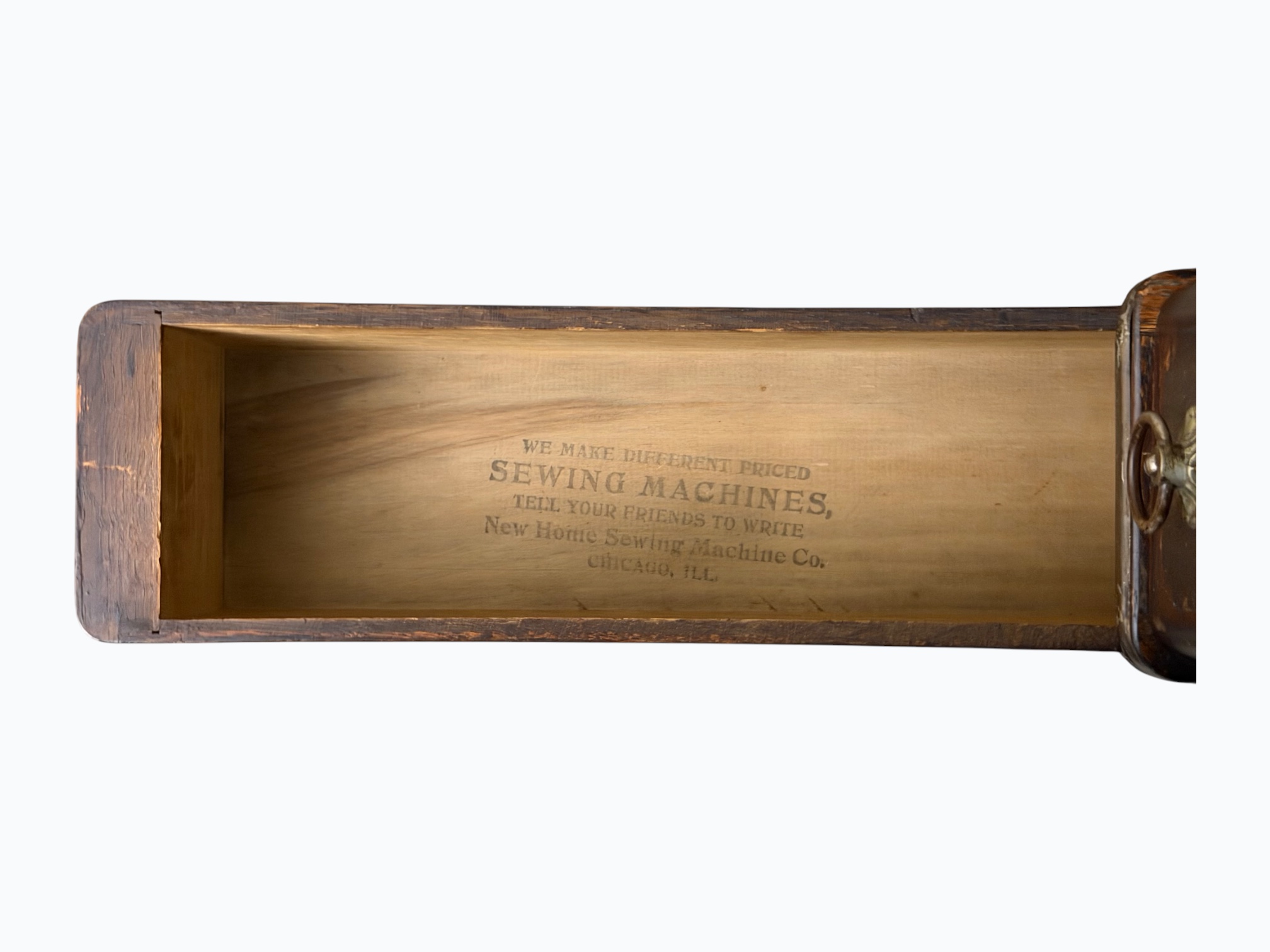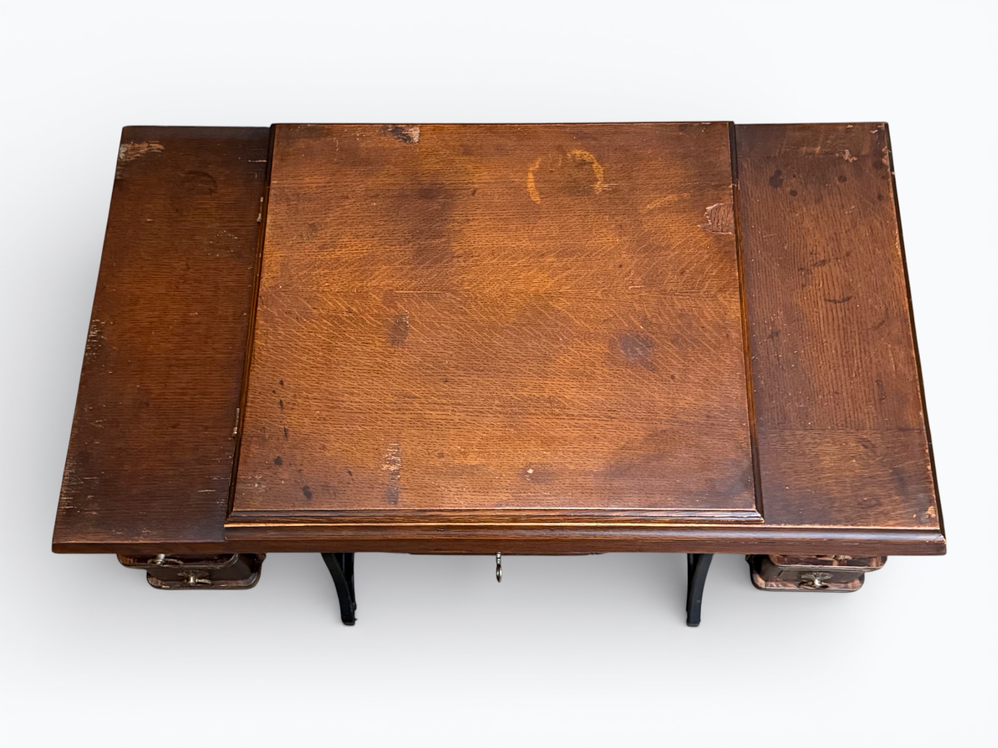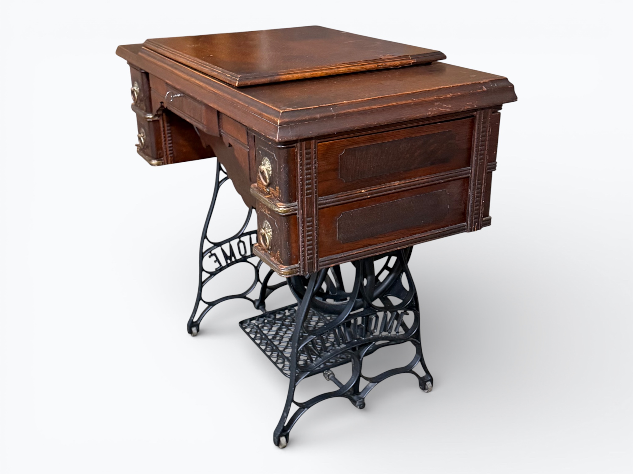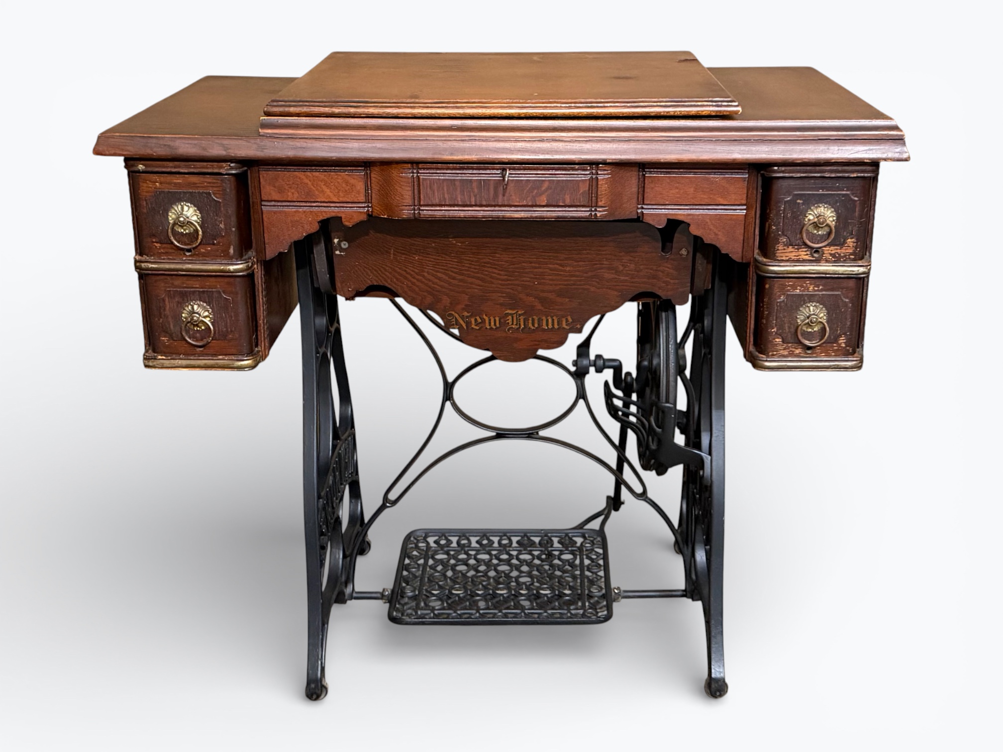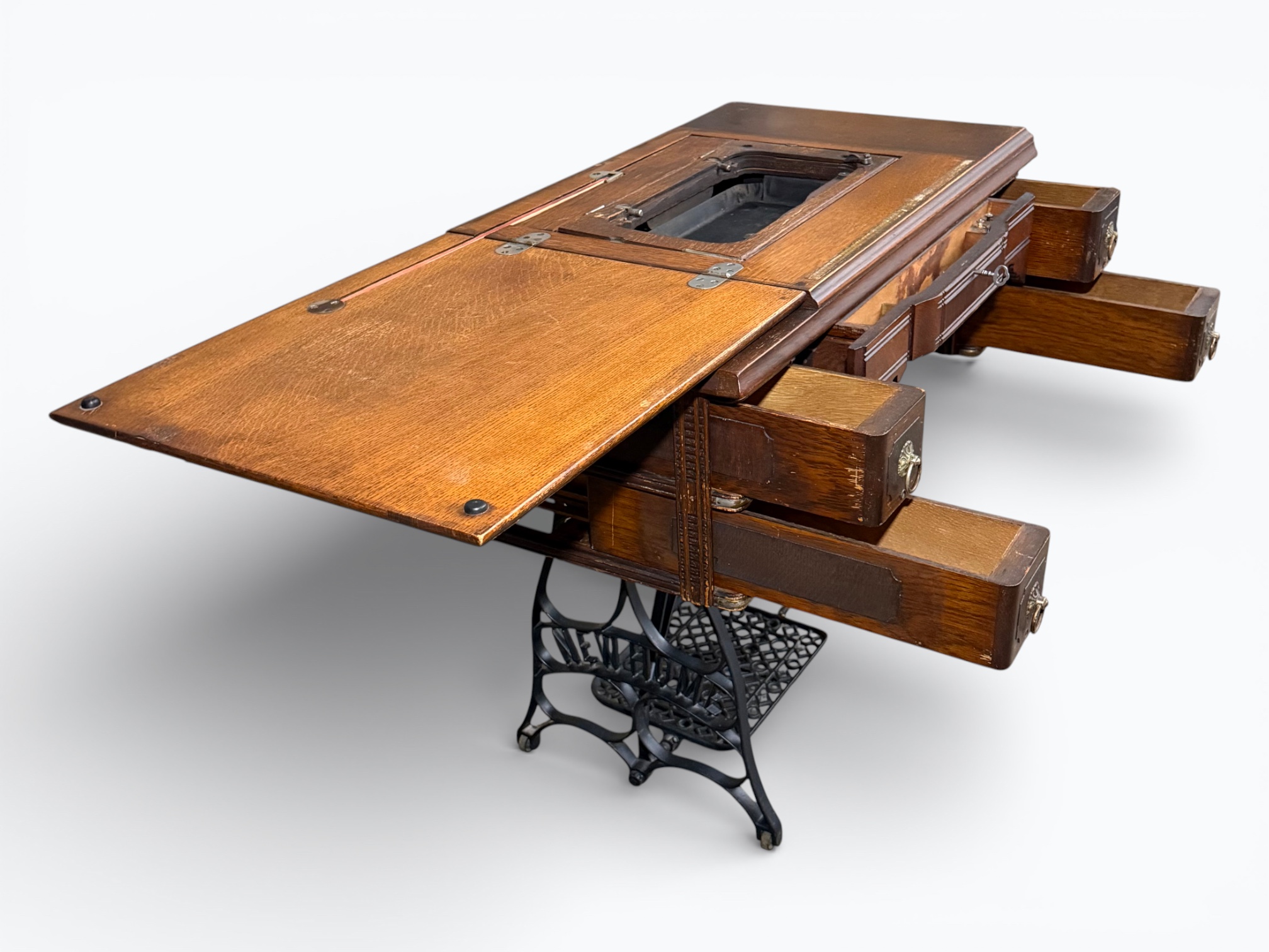 • [Features]: Original paperwork; Historical bill of sale when purchased second-hand in 1946 in Dubuque, IA; Treadle pedal and flywheel base; 4 skinny long drawers on the sides, and 1 thin center drawer with a thread spool storage block and original spools; All drawers lock and include the key; Ring drop drawer pulls with decorative backplates; Folding lift-top cabinet; Scalloped center apron; Stepped and molded top edges; Leather treadle drive belt included; Integrated seam guide ruler inlay; Stamped patent from 1985