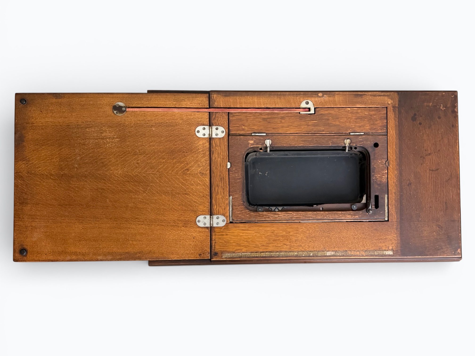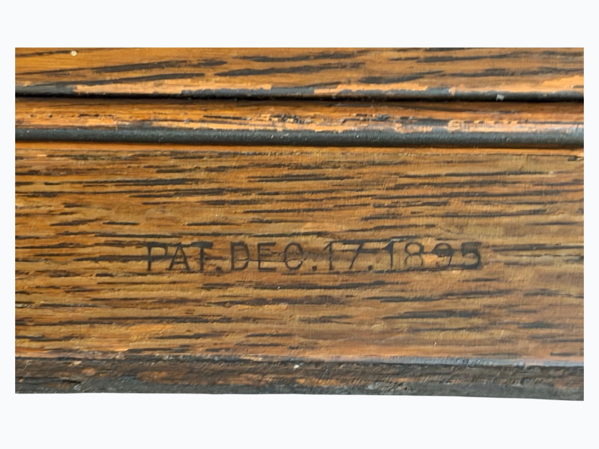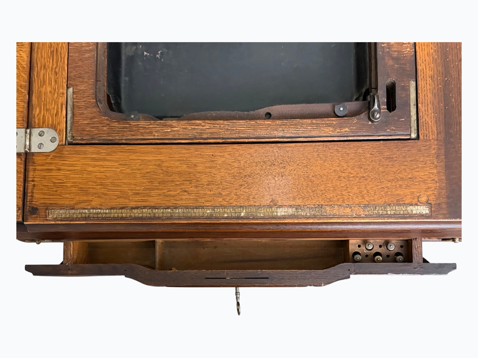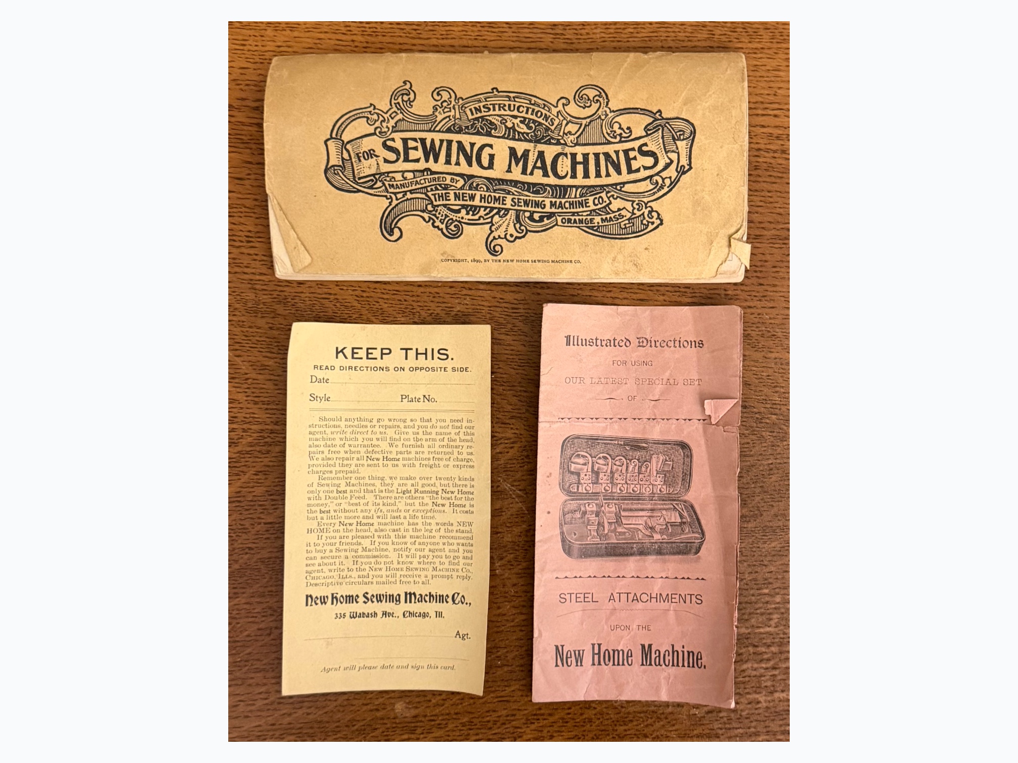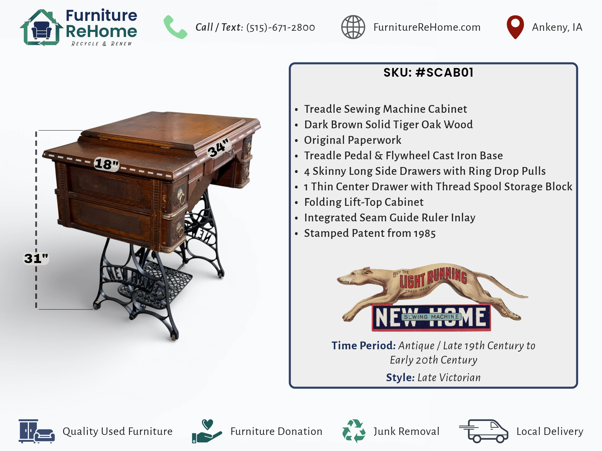 • [Features]: Original paperwork; Historical bill of sale when purchased second-hand in 1946 in Dubuque, IA; Treadle pedal and flywheel base; 4 skinny long drawers on the sides, and 1 thin center drawer with a thread spool storage block and original spools; All drawers lock and include the key; Ring drop drawer pulls with decorative backplates; Folding lift-top cabinet; Scalloped center apron; Stepped and molded top edges; Leather treadle drive belt included; Integrated seam guide ruler inlay; Stamped patent from 1985